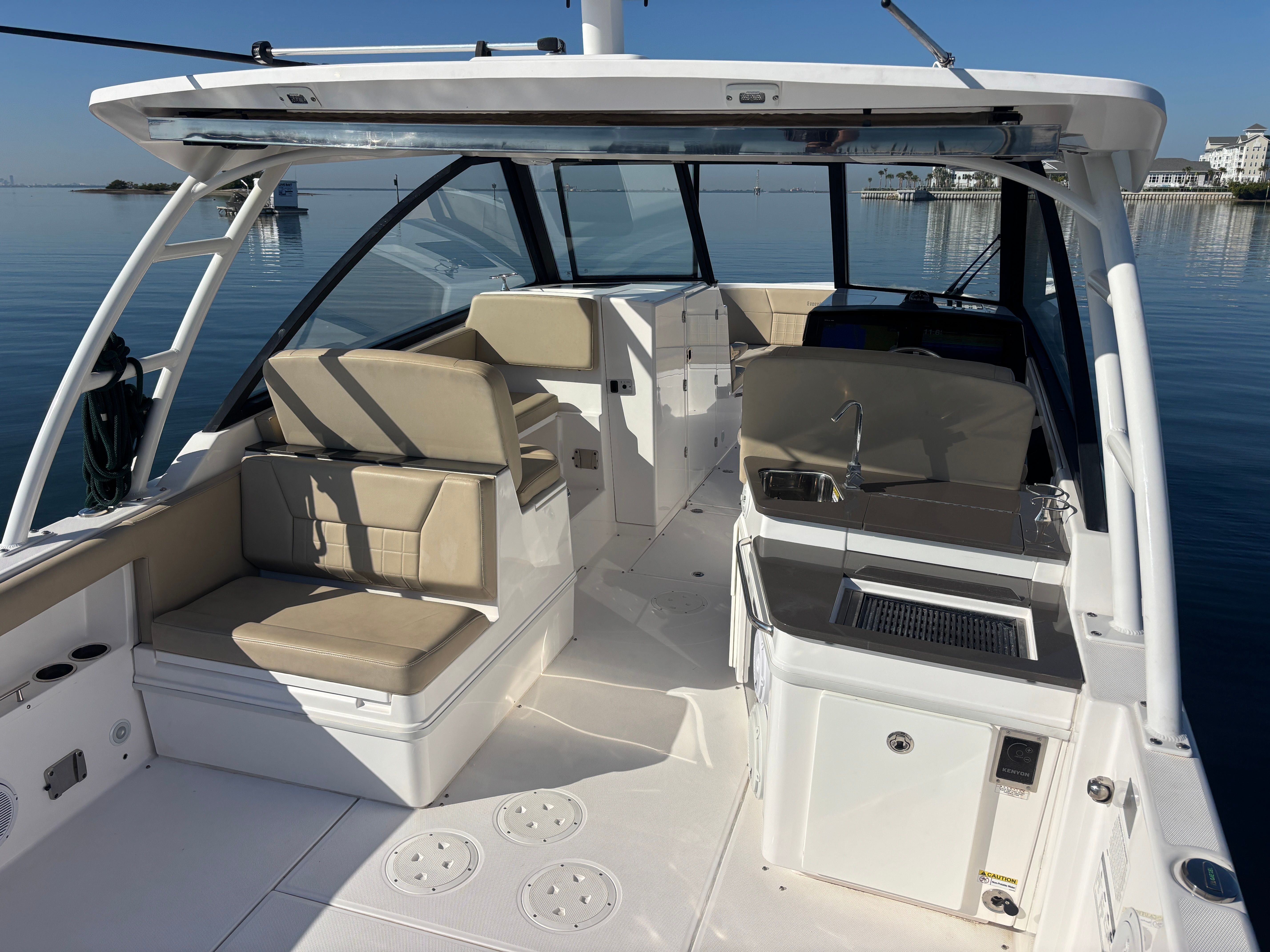 •Fiberglass hardtop with powder-coated aft legs, includes LED lights, spreader lights, radio box and speakers