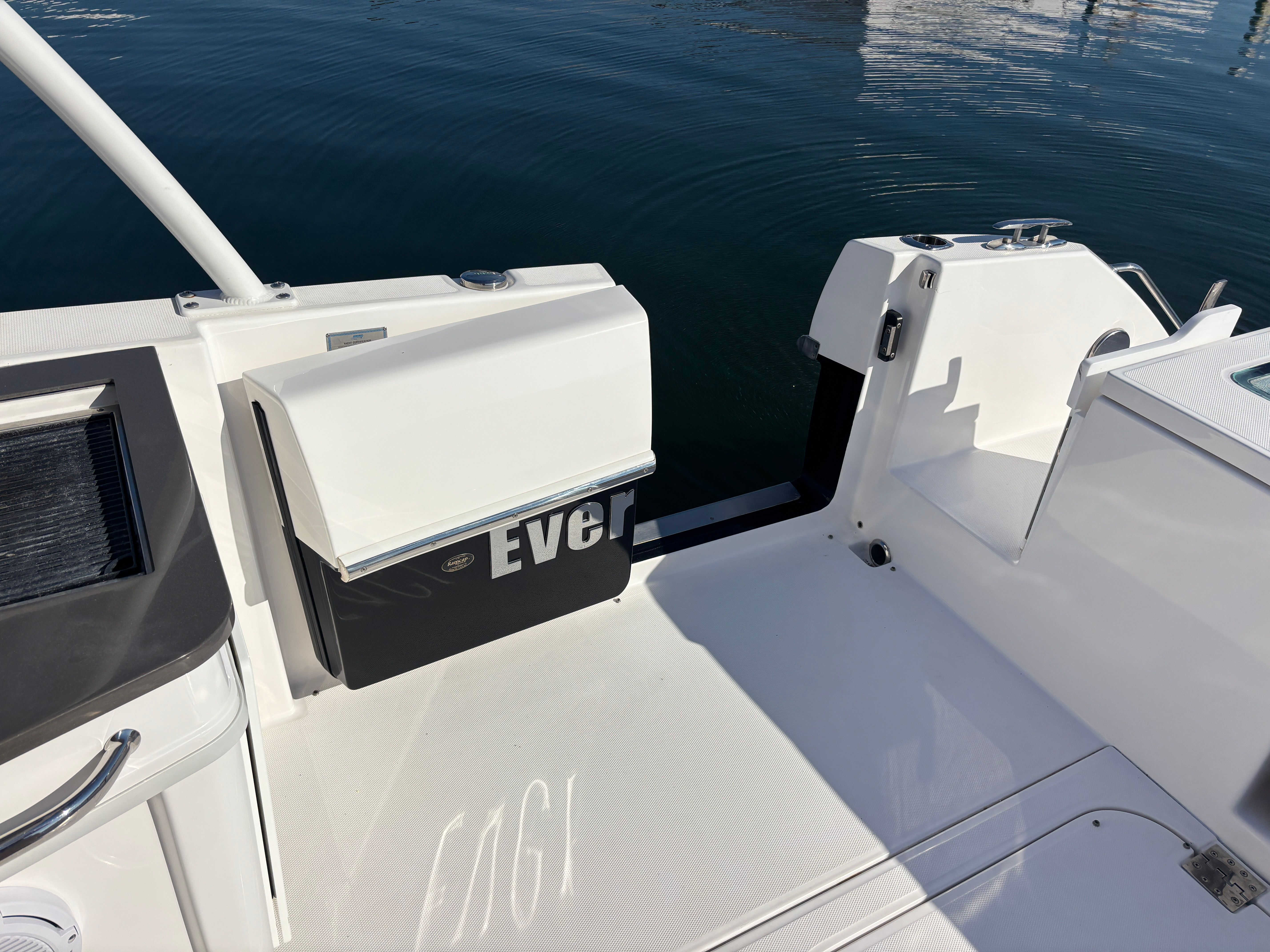 •Retractable boarding ladder at transom with stainless steel grab rail