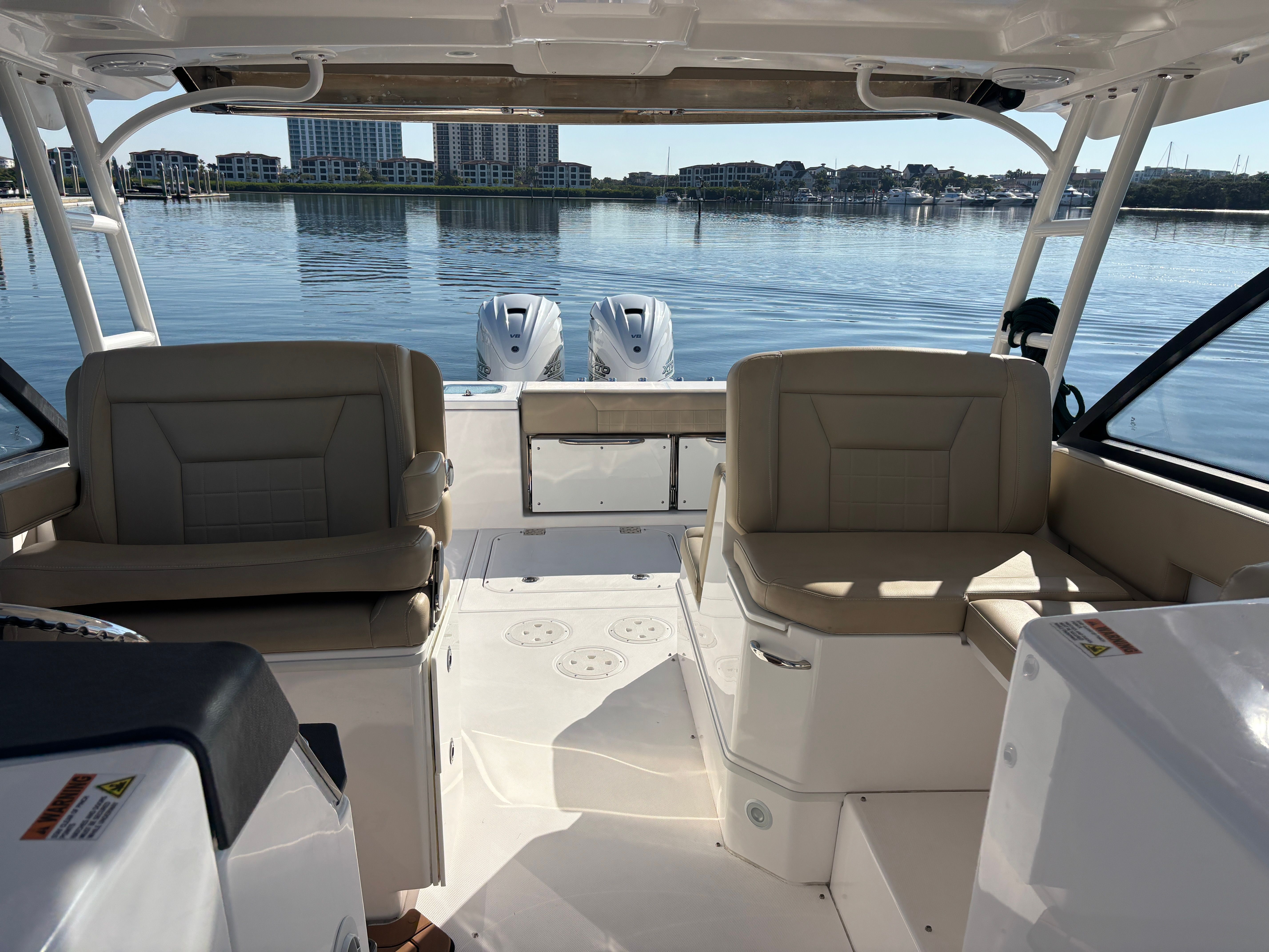 •Bow seating with FWD facing lounge cushions and backrests •Double wide helm seat to stbd