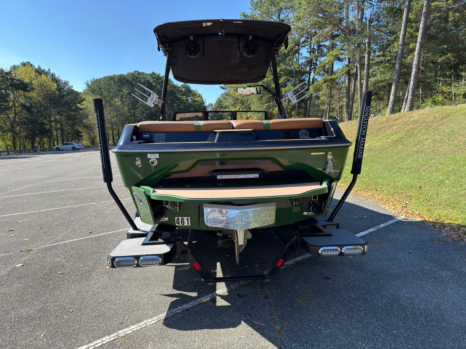 Notable features include: -Malibu M5Di engine (86 hours) -PTM Clamping racks -Extended Bimini -Wake view seating -Plug and play ballast -Cockpit soft grip flooring -Tower speakers -Matching trailer This boat is loaded out and is stunning in its Sumpter Green and Sepia Tan colorway.