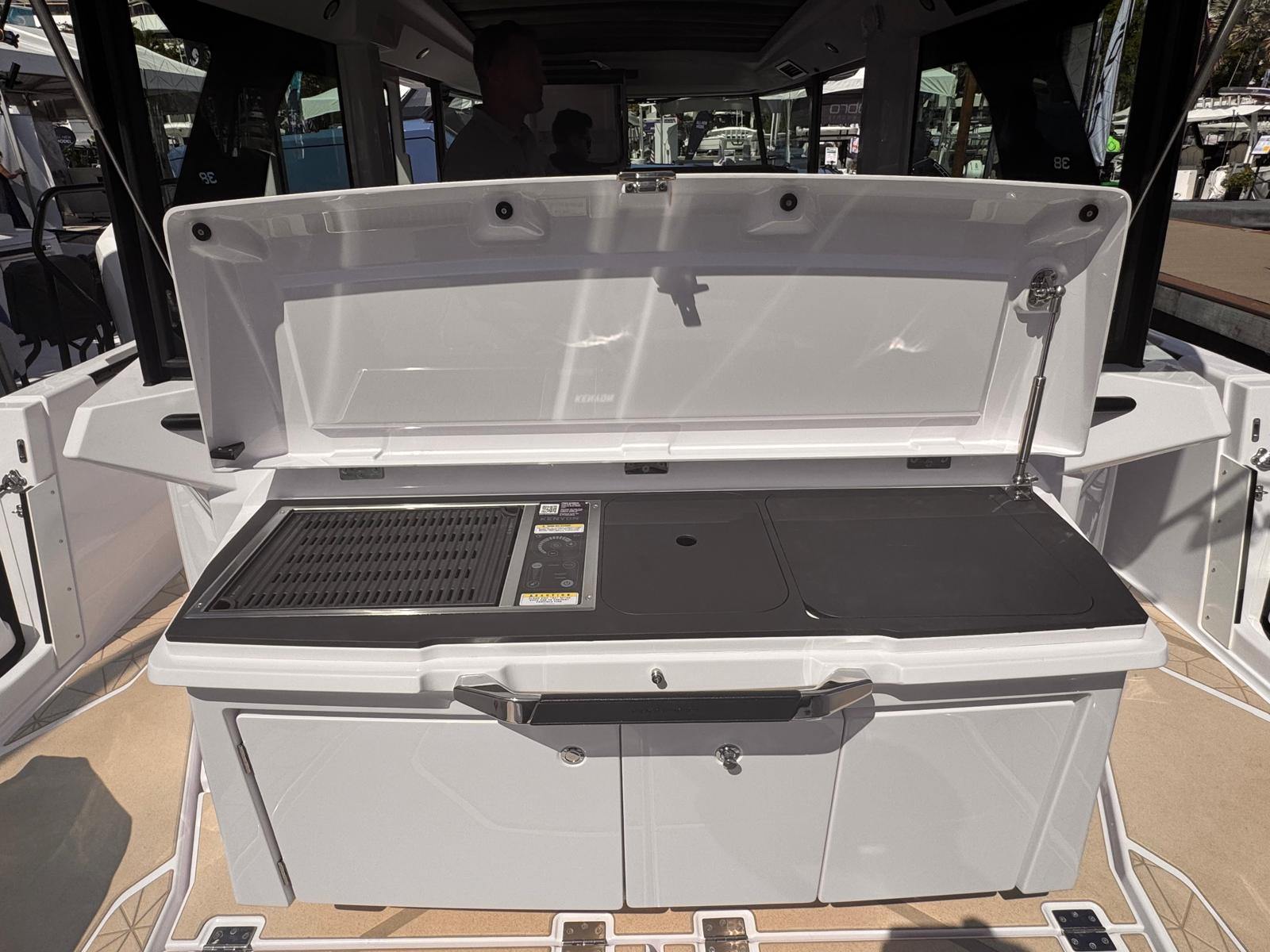 The Axopar 38 XC Cross Cabin excels in both form and function. Its nearly 39-foot length provides generous space for passengers and gear, while the smart storage solutions—such as the Fenderbox Sofa—keep the deck clutter-free. The mooring package streamlines docking, making it accessible even for those new to boating. The roof rack set expands your adventure possibilities, allowing you to bring along paddleboards, kayaks, or other equipment with ease. The freshwater system with a fridge and hot/cold water adds a touch of luxury, making it simple to stay refreshed and comfortable throughout your journey.