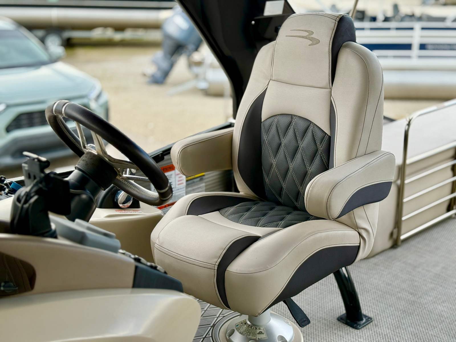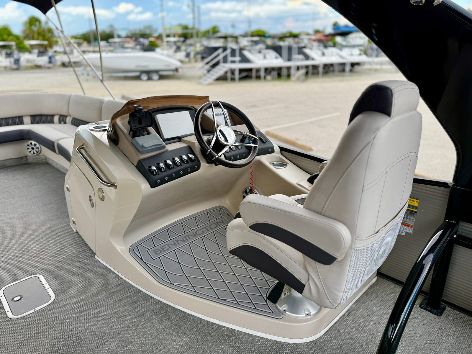 The Bennington 28 QSRFBX1 3T is thoughtfully designed to enhance your boating experience with a range of features and specifications that cater to both comfort and convenience. The spacious deck layout provides plenty of room for seating, entertaining, and relaxing, while the high-quality construction ensures durability and longevity. The pontoon’s generous length of over 28 feet allows for a versatile arrangement of seating and amenities, making it ideal for hosting gatherings or enjoying quiet moments on the water.With its modern styling and attention to detail, this Bennington pontoon boat offers a premium boating experience. The ergonomic helm station provides easy access to controls and instrumentation, allowing the captain to navigate with confidence and ease. The plush seating and ample storage options ensure that everyone on board can relax in comfort, while keeping personal items and gear organized and out of the way.
