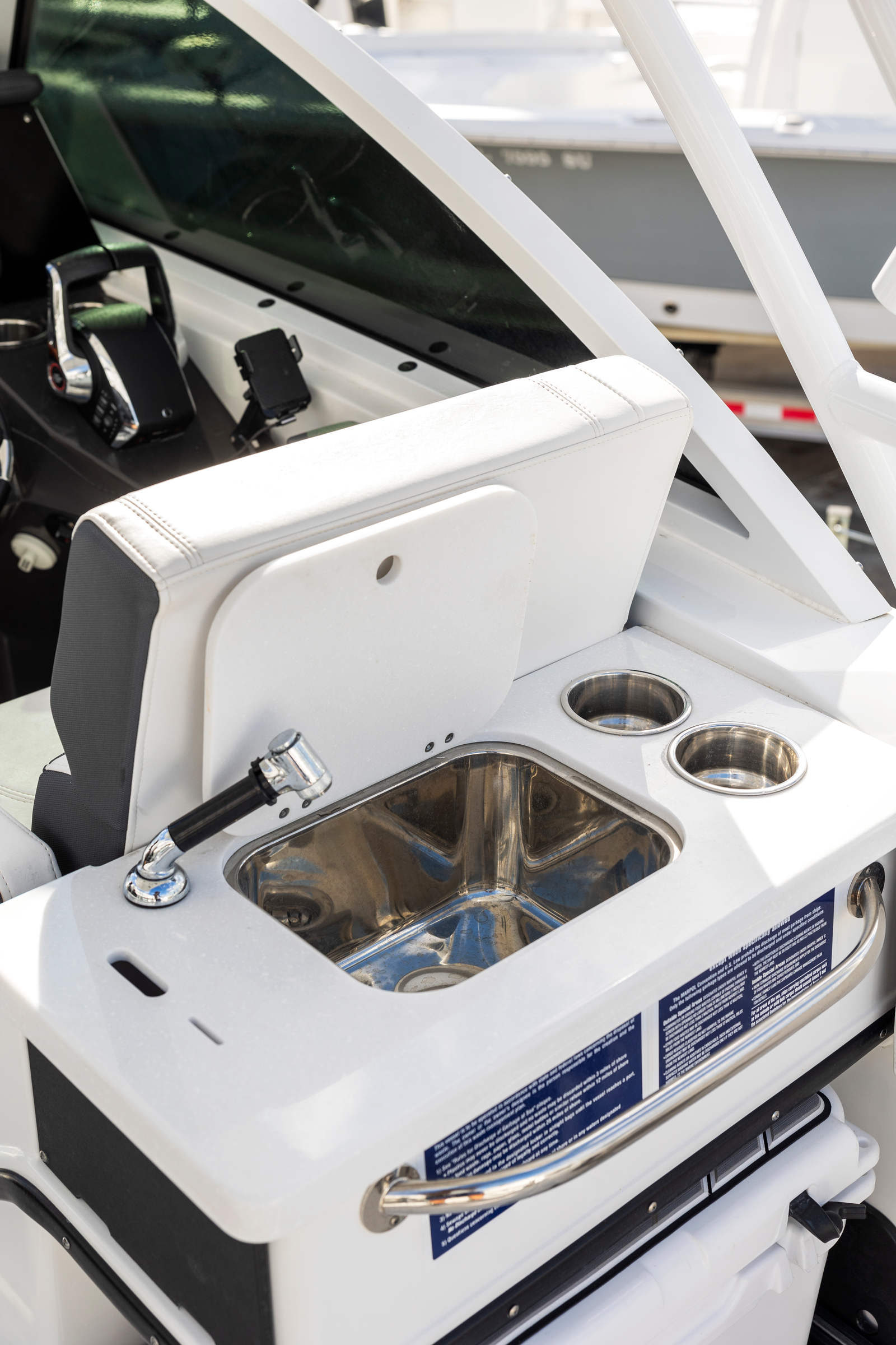 Lockable port-side glove box and recessed stainless grab rails