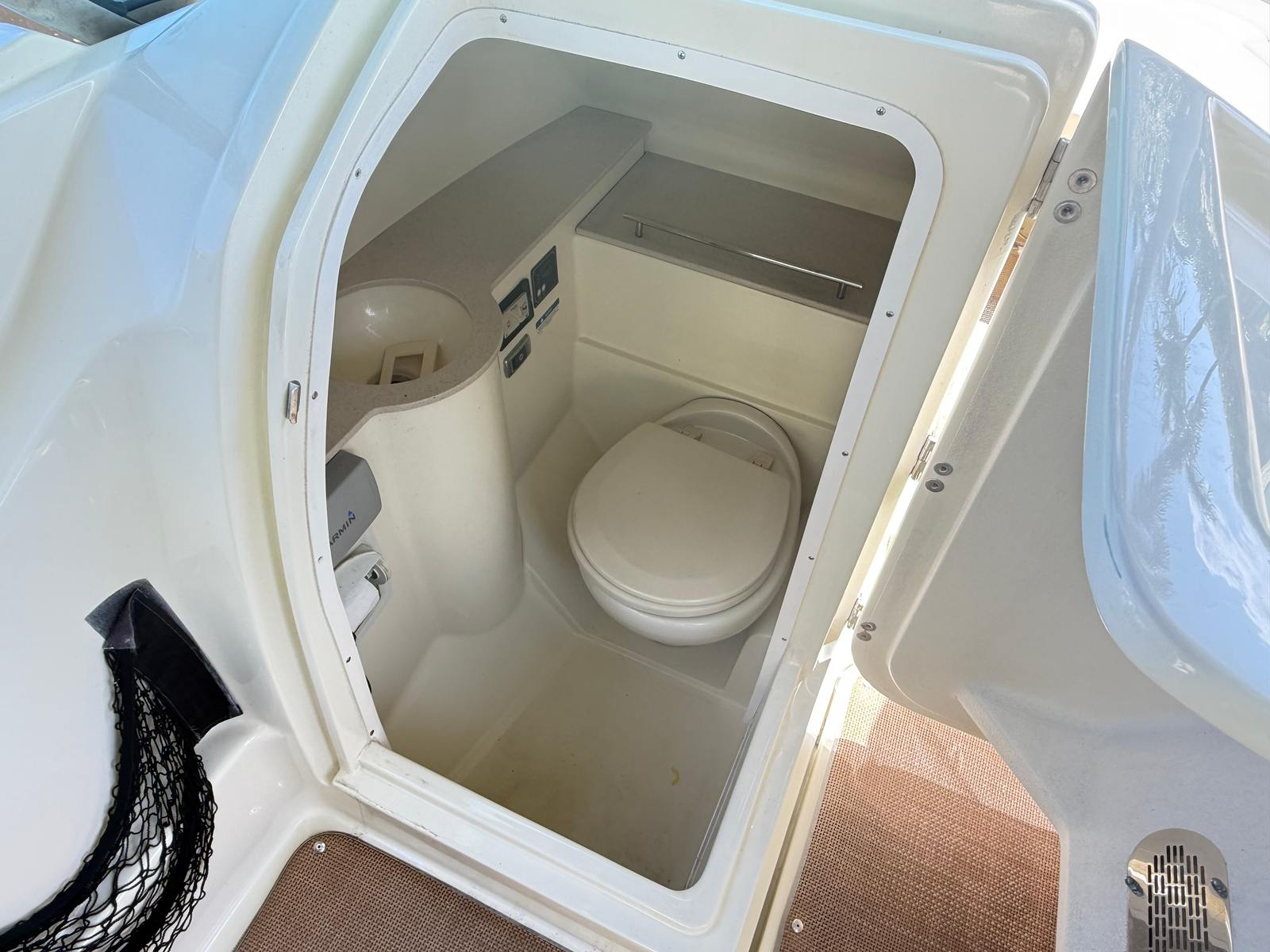 • Enclosed head compartment with sink and marine toilet