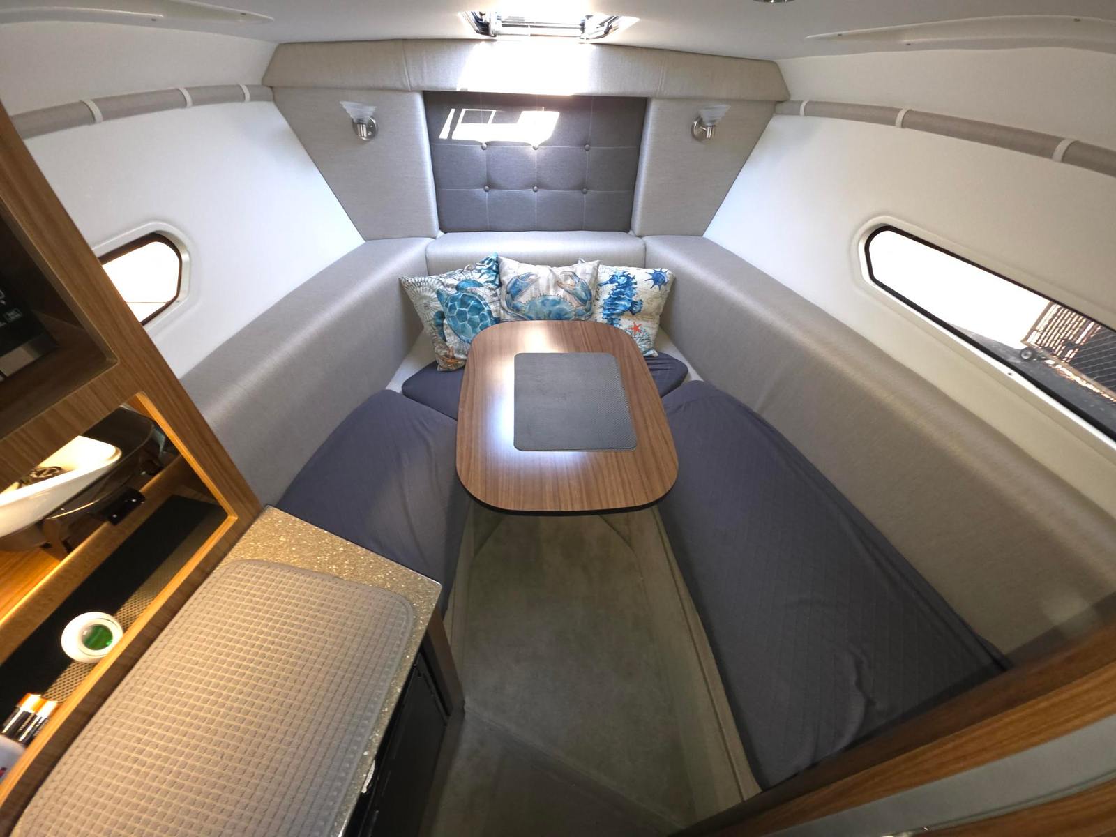The V255 offers ample cabin space with a convertible V-bunk in the bow and a beam-width aft cabin accommodation. It can sleep up to six people, making it a spacious option for families or groups.