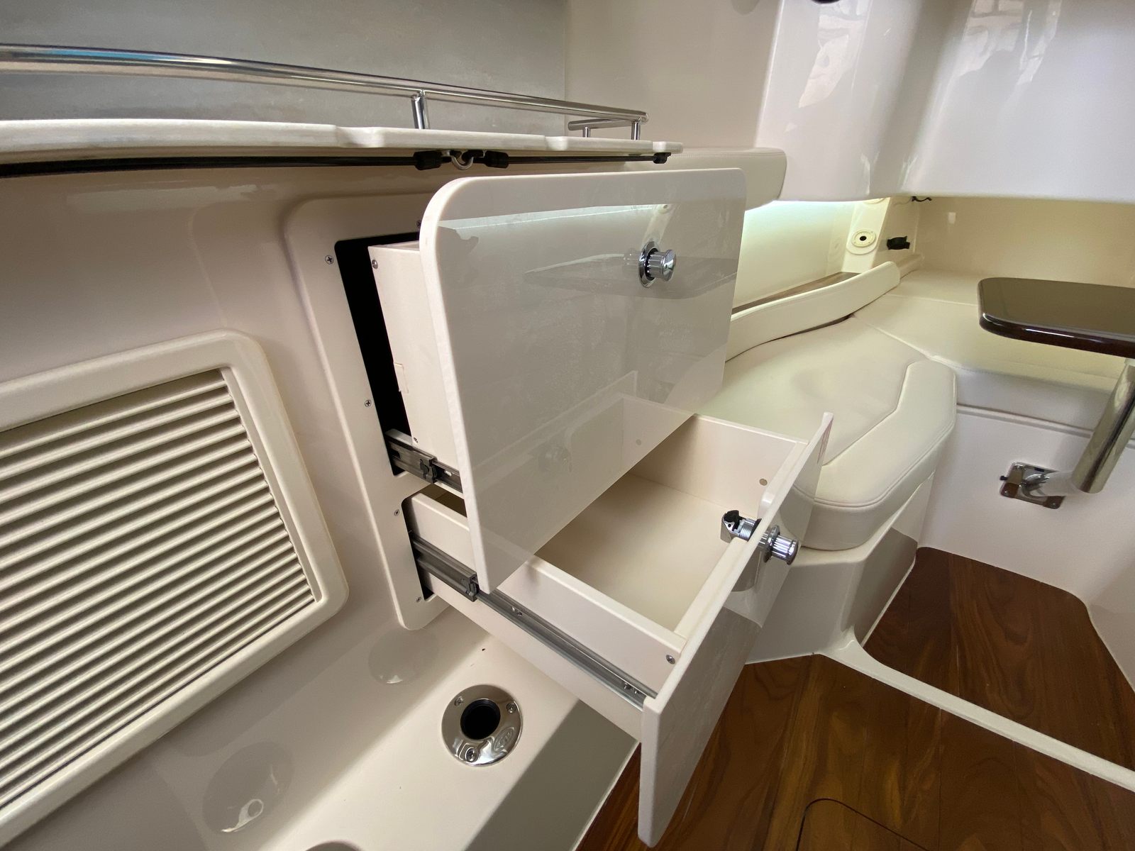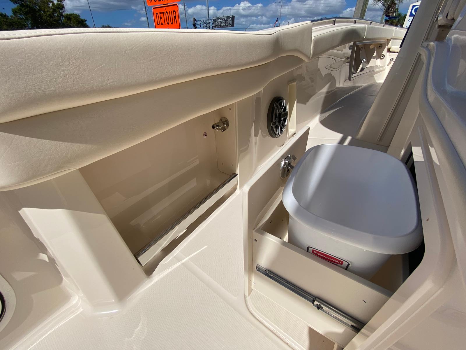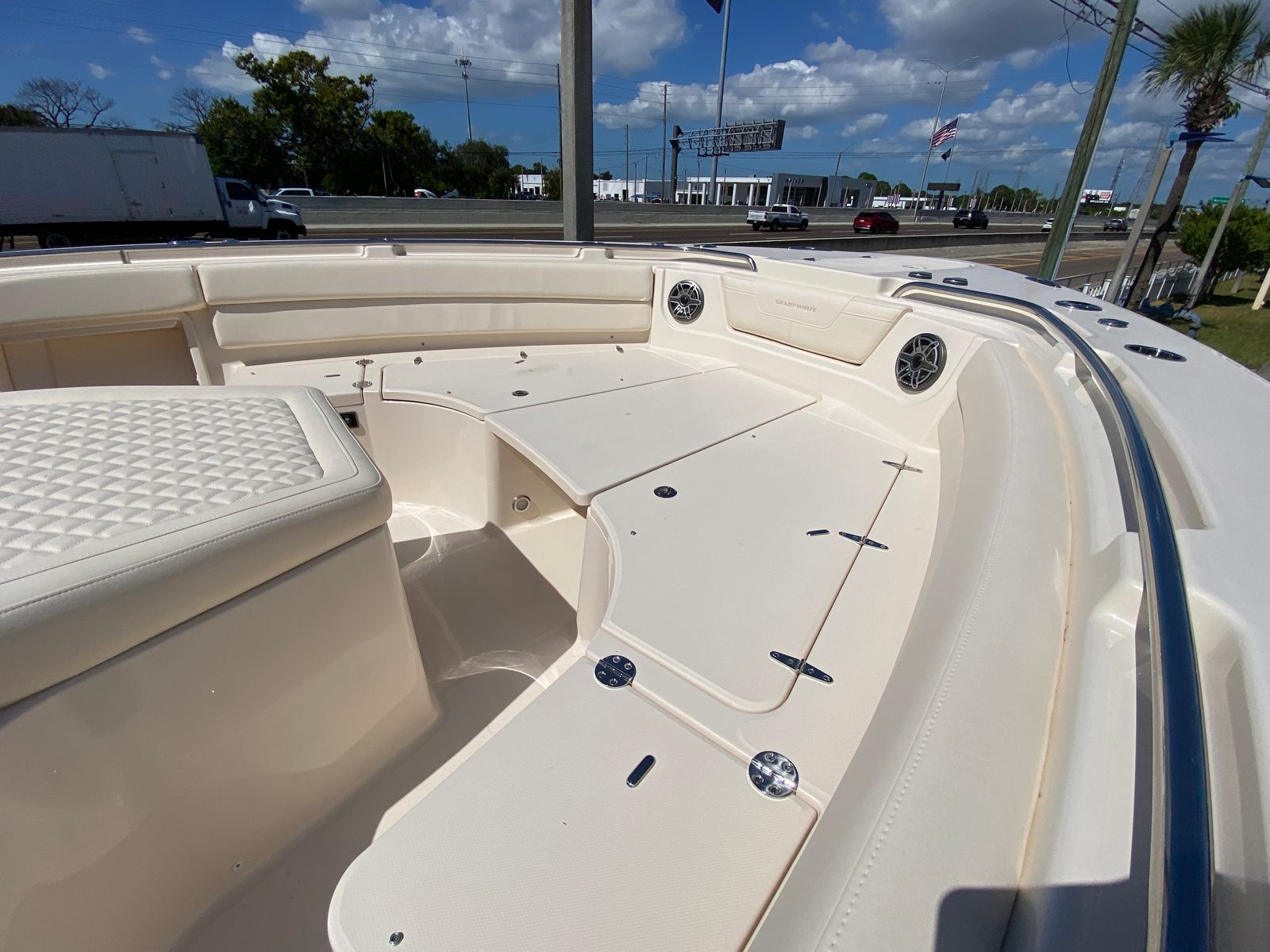 The Grady-White Canyon 386 is packed with special features that elevate your boating experience. The triple Yamaha XF450 engines are expertly integrated for optimal performance and reliability. The prerig triple Yamaha XF450 FM with BTH ensures seamless operation and advanced control, giving you the confidence to navigate any waters. The bow fiberglass table is motorized, adding a touch of luxury and convenience for entertaining guests or enjoying meals al fresco. The gel coat in celestial blue not only enhances the boat’s visual appeal but also provides long-lasting protection against the elements. The ivory bow shade offers respite from the sun, creating a comfortable space to relax during warm days. The Jit top underside in celestial further complements the boat’s sophisticated aesthetic, making every detail a testament to Grady-White’s commitment to excellence.