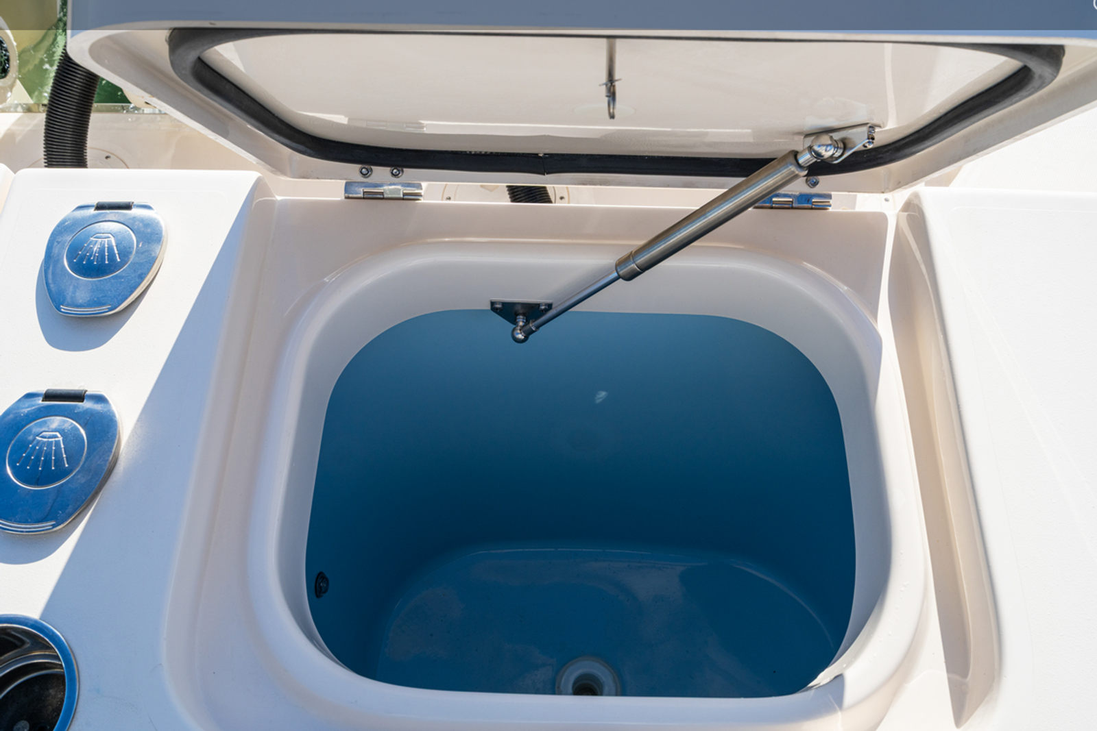 The Grady-White Express 340 is as practical as it is luxurious. Its 33.5-foot length strikes the perfect balance between spaciousness and maneuverability, making docking and storage straightforward and stress-free. The efficient triple Yamaha F350XSB engines are engineered for reliability and ease of maintenance, ensuring that you spend more time enjoying the water and less time worrying about upkeep. The Seakeeper 3 HD stabilization system not only enhances comfort but also contributes to safety, providing a stable platform for all your activities. The cockpit refrigerator is ideal for storing drinks and snacks, making it easy to entertain guests or keep your family fueled for a day of fun. The custom Loose Style Line Tape and Ocean Mist Blue gel coat ensure your boat stands out, while also protecting its exterior for years to come.