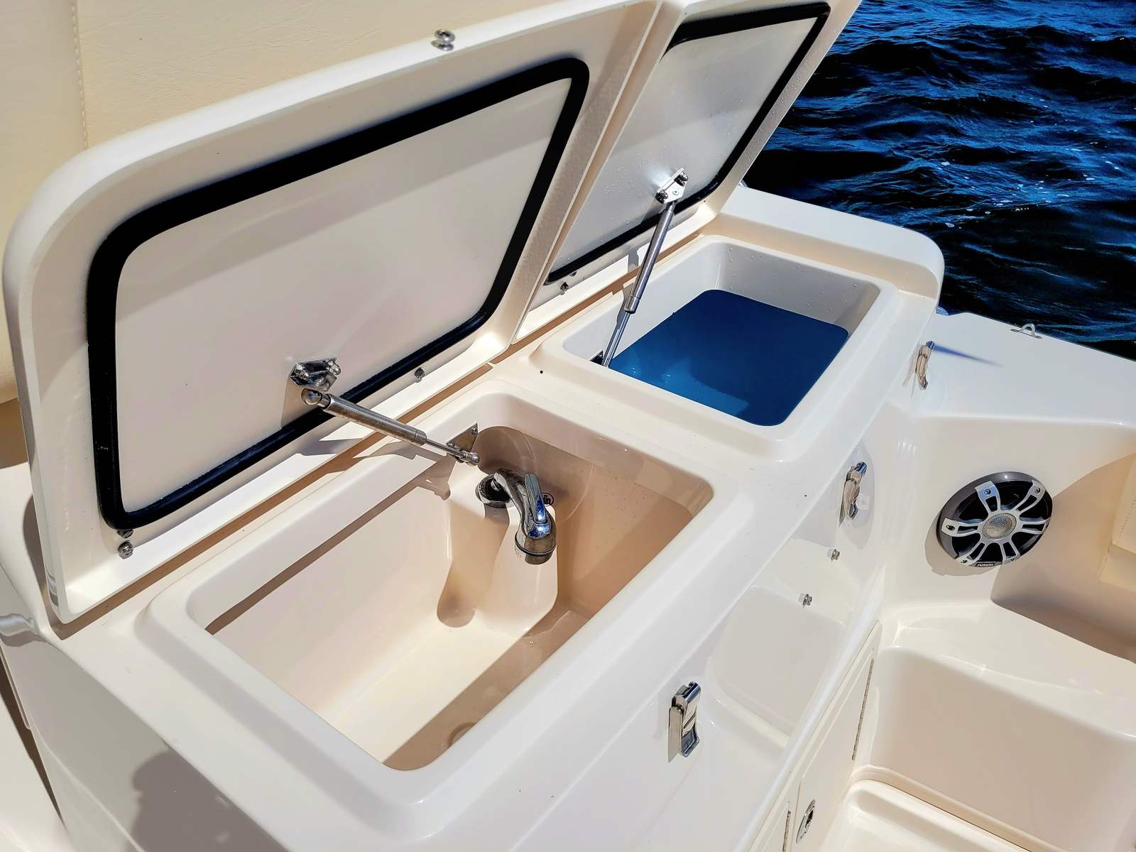 This is a superb example of the classic Grady White 370 Express. This example has been meticulously cared for by its one owner and shows extremely well. Finished in beautiful Ocean Mist Blue and powered by the reliable triple Yamaha F425XTO with Yamaha Warranty thru 10.06.27. Equipped with Helm master joystick with Stay Point and Fish point position hold makes docking and fishing effortless!