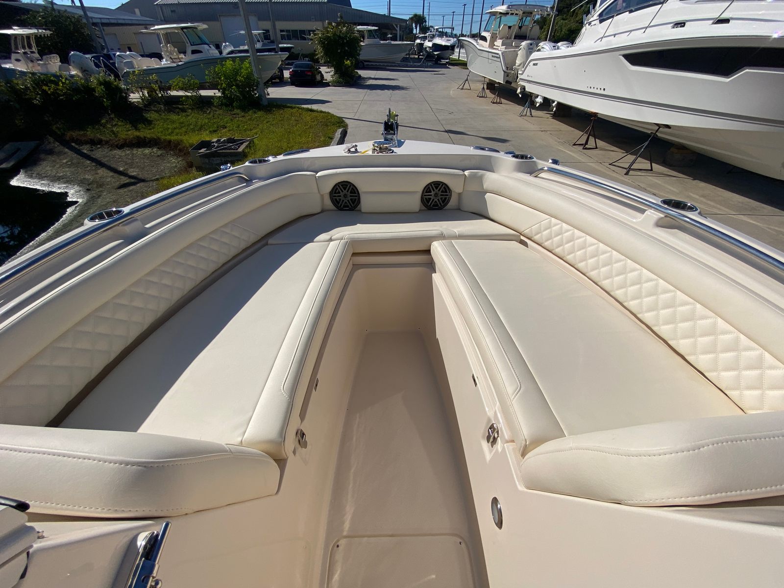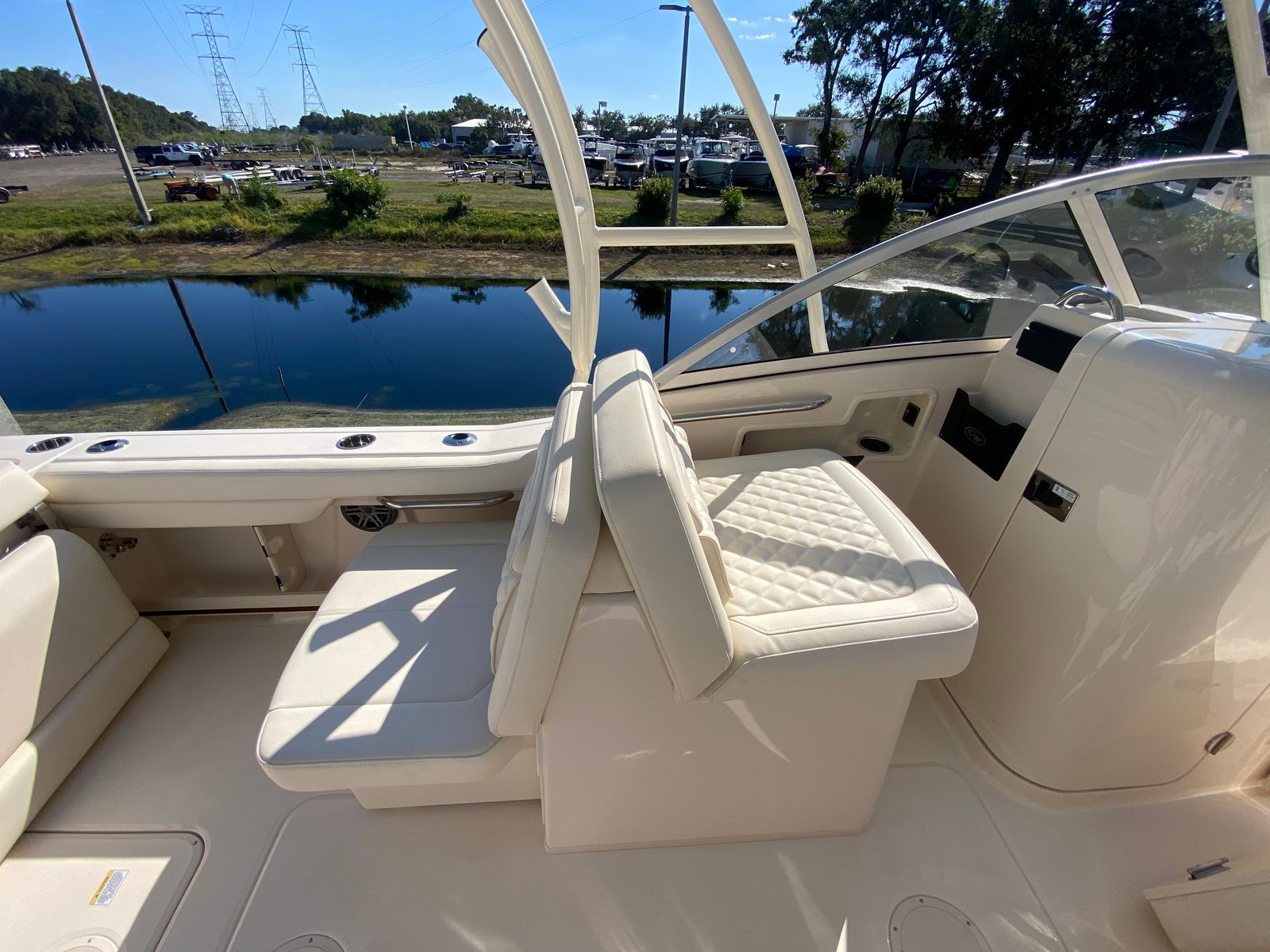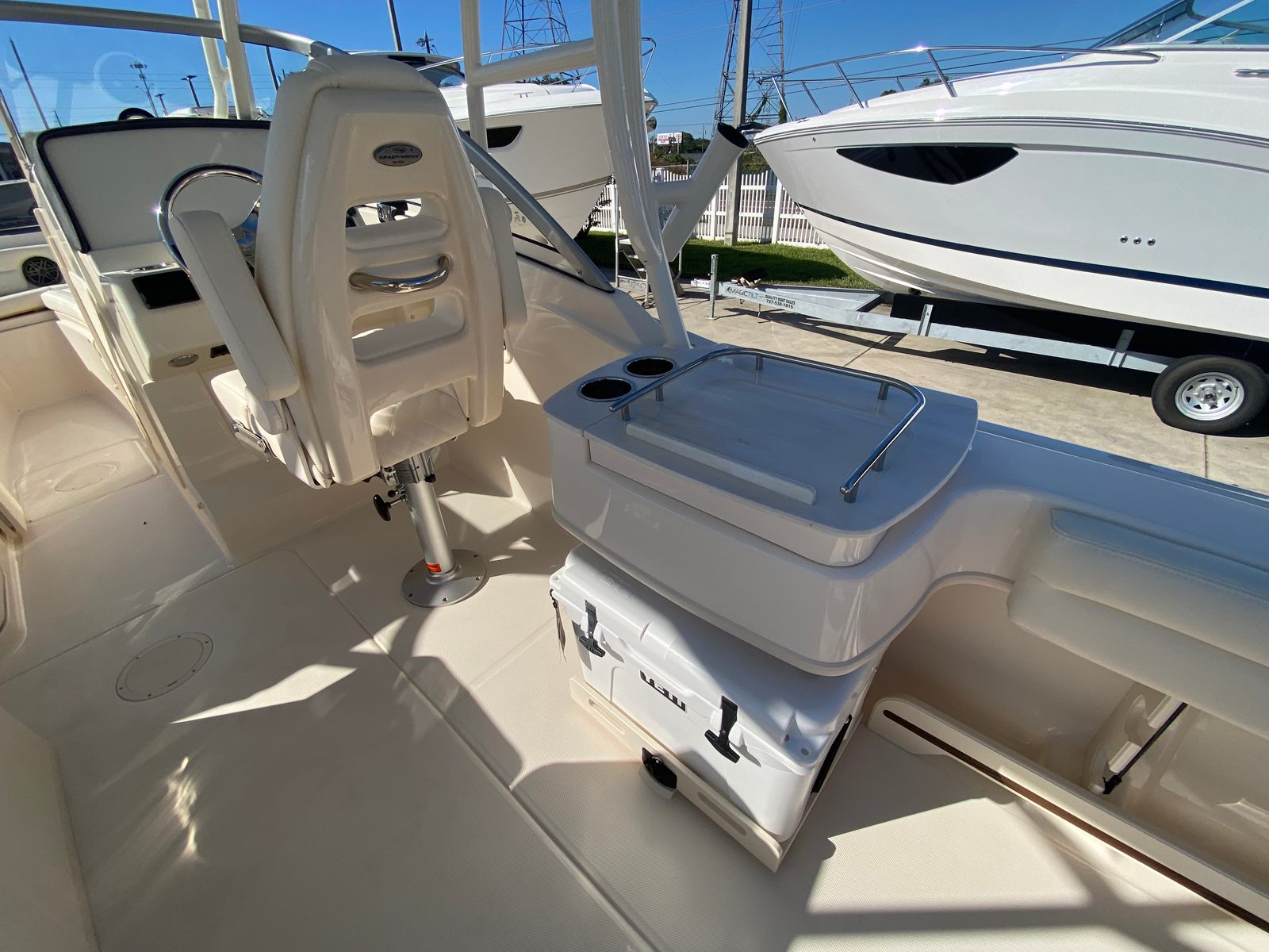 Practicality is at the core of the Grady-White Freedom 235’s design. The anchor windlass with bow roller makes docking and anchoring a breeze, saving you time and effort when arriving at your destination. The spacious layout offers ample storage for gear, water toys, and personal items, keeping the deck clutter-free and organized. The efficient Yamaha F350XSB engine is engineered for optimal fuel economy, allowing you to spend more time on the water and less time refueling.The dual console configuration provides excellent protection from the elements, with a windshield and bow shade that shield passengers from sun and spray. The boat’s intuitive controls and ergonomic seating make it easy to operate, whether you are an experienced captain or new to boating. Every detail is designed to enhance your experience, from the easy-to-clean surfaces to the durable construction that stands up to the rigors of marine life.