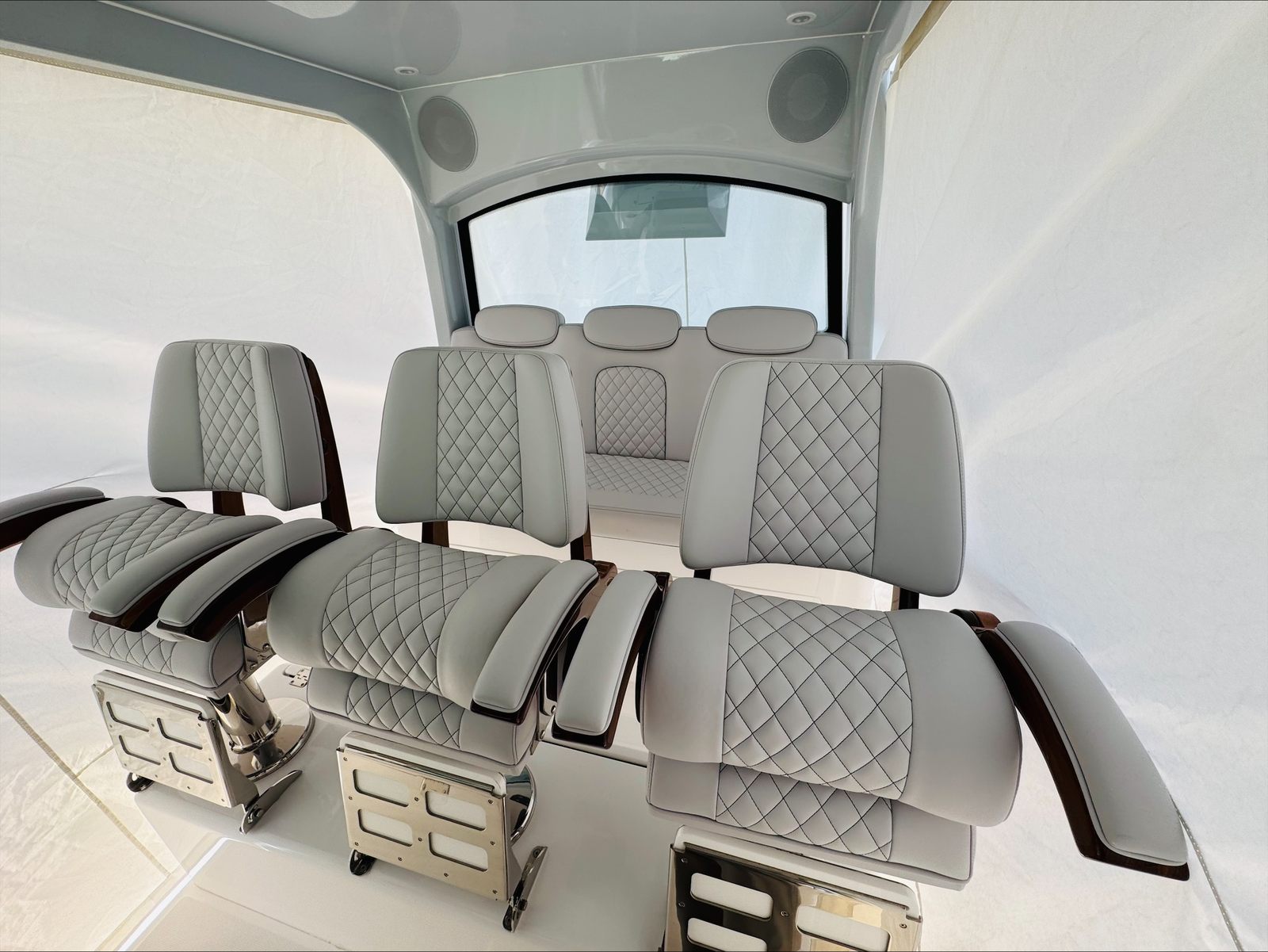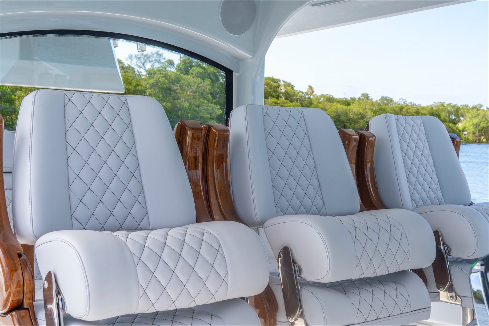 Release Marine Triple Helm Seats with Teak Ladder Backs and Arm Rests - Includes Polished S/S Swivel Bases