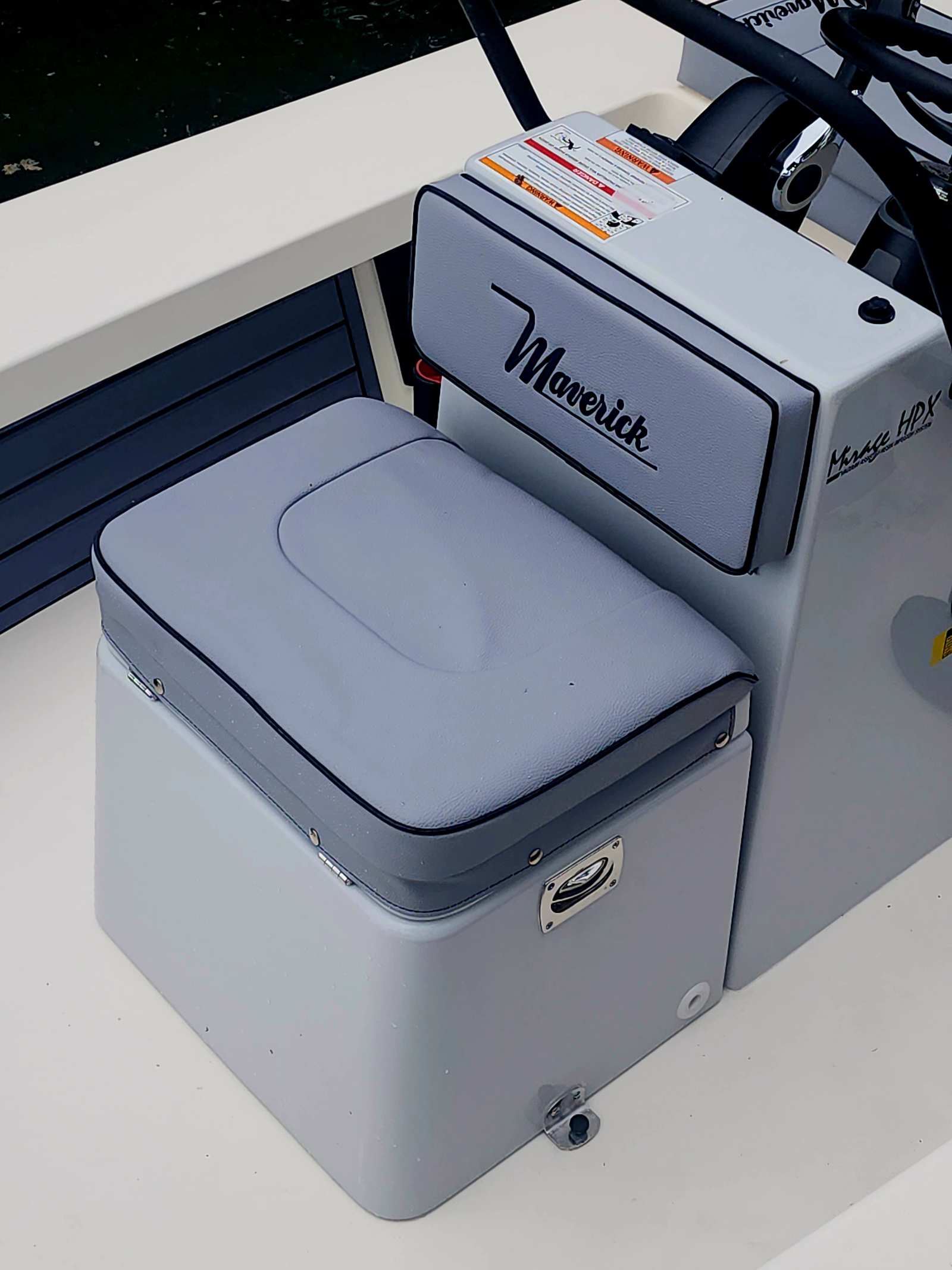 This center console boat is loaded with premium features that enhance both functionality and comfort. The hydraulic tilt steering system, complemented by an upgraded Edson steering wheel with a power knob in sleek black, offers effortless navigation and a touch of sophistication at the helm. The hull is finished in Whisper Gray, a modern and stylish color that not only looks stunning but also stands up to the elements.Comfort is paramount on the Maverick 17 Hpx-V, with upgraded grey cushions accented by black trim, providing both durability and a refined aesthetic. The helm seat backrest cushion ensures support during long days on the water, while the 38-inch poling platform tower (compatible with F90 and F115 engines) gives anglers a superior vantage point for spotting fish in shallow waters. The poling platform lean bar features plug-ins only, offering flexibility and convenience for various fishing techniques.For those who love casting, the bow casting platform is a standout feature, providing a stable and spacious area to perfect your technique. Every detail of this Maverick boat for sale is thoughtfully designed to maximize your enjoyment and success on the water.