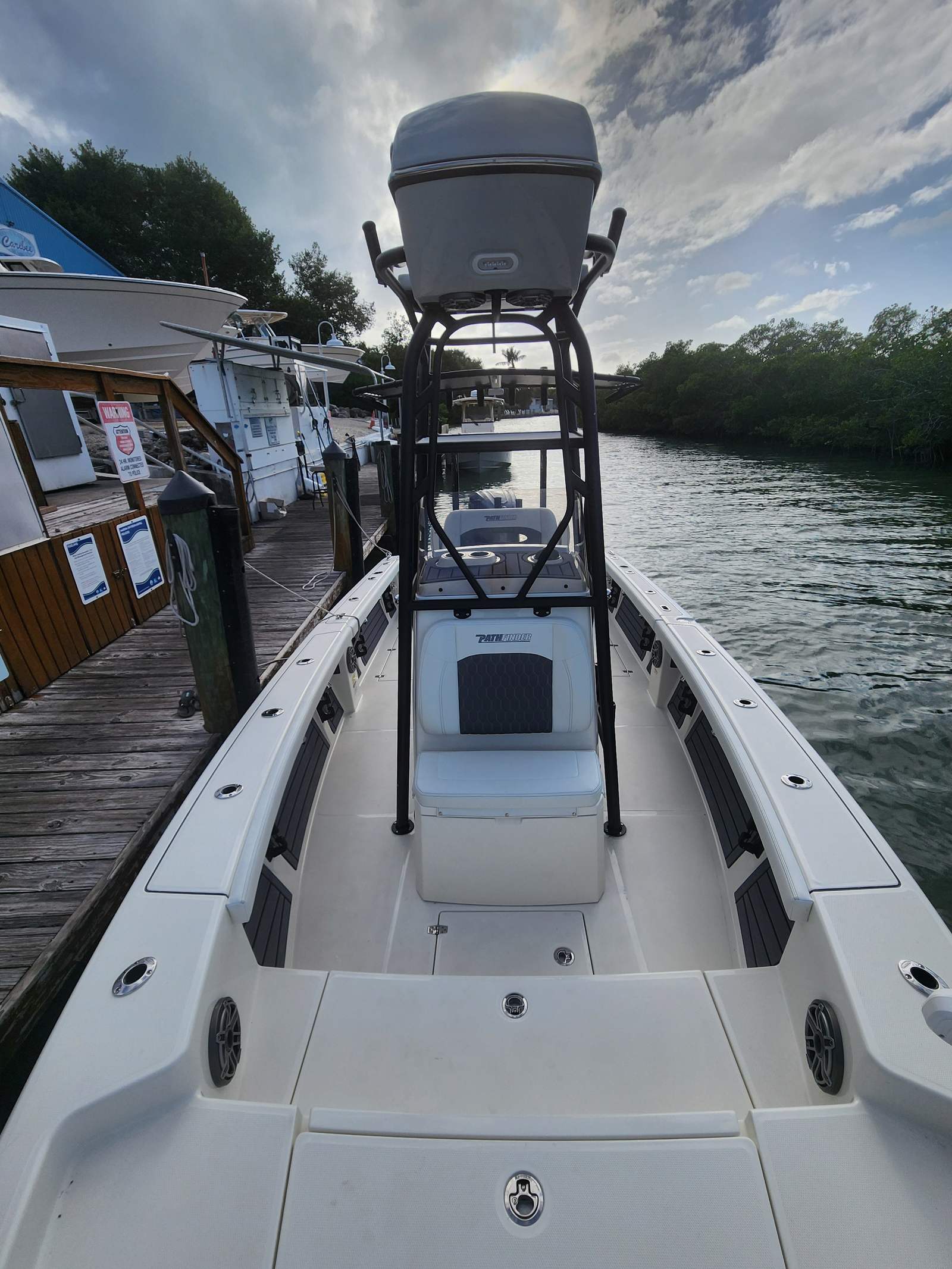 Practicality is at the core of the Pathfinder 2400 Open’s design. The center console configuration maximizes deck space, providing ample room for gear, coolers, and other essentials. The advanced steering and control systems make docking and maneuvering in tight spaces a breeze, reducing stress and increasing confidence for boaters of all skill levels. The efficient hull design, combined with the powerful Yamaha engine and trim tabs, ensures optimal fuel efficiency, allowing you to spend more time on the water and less time at the fuel dock.The elevated 2nd station tower is a game-changer for anglers, offering a superior vantage point for sight fishing and navigation. The durable construction and high-quality materials ensure that your investment will stand the test of time, providing years of reliable performance and enjoyment. Whether you are heading out for a day of fishing, a family picnic on a secluded beach, or a sunset cruise with friends, the Pathfinder 2400 Open is equipped to handle it all with ease.