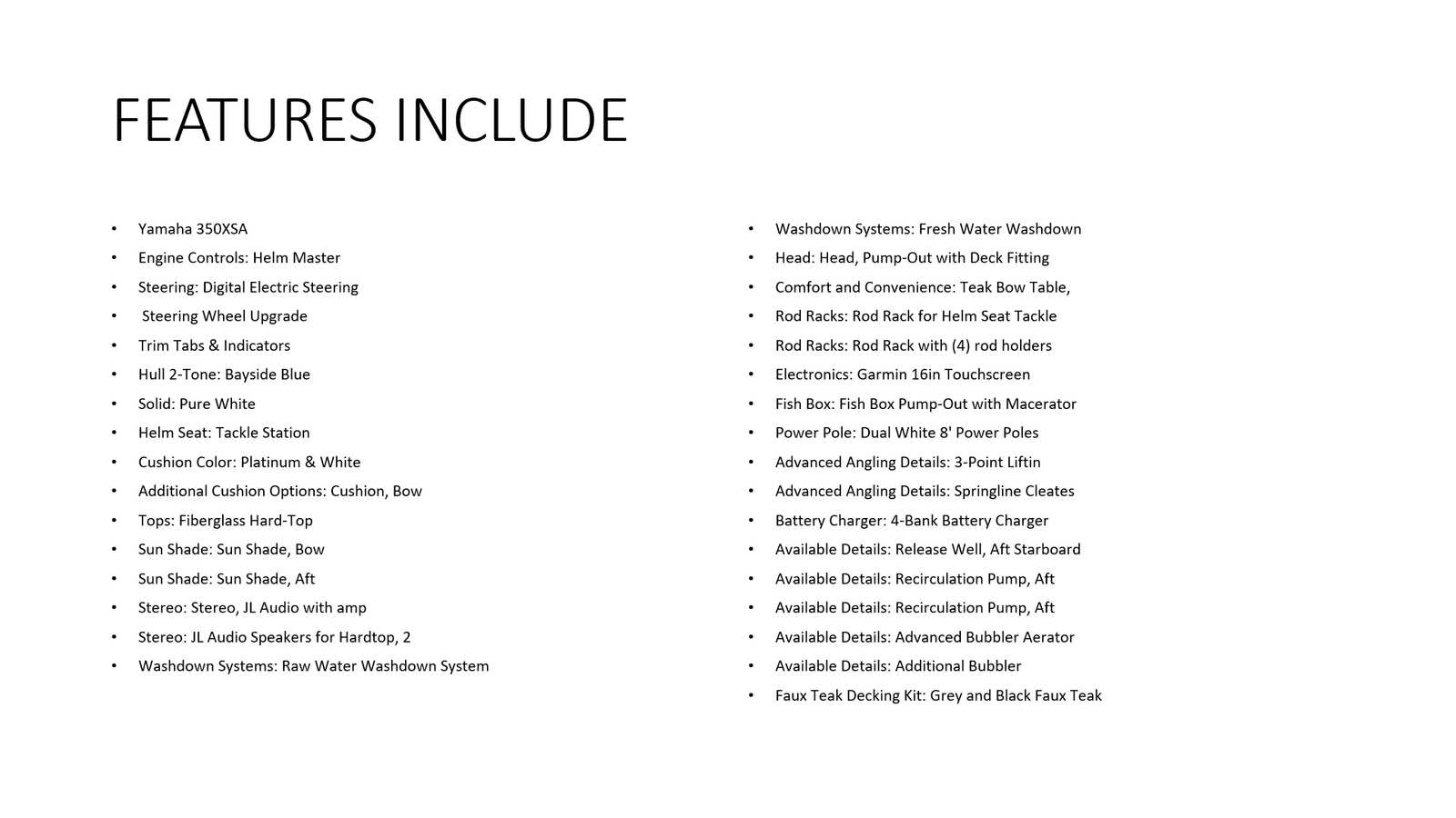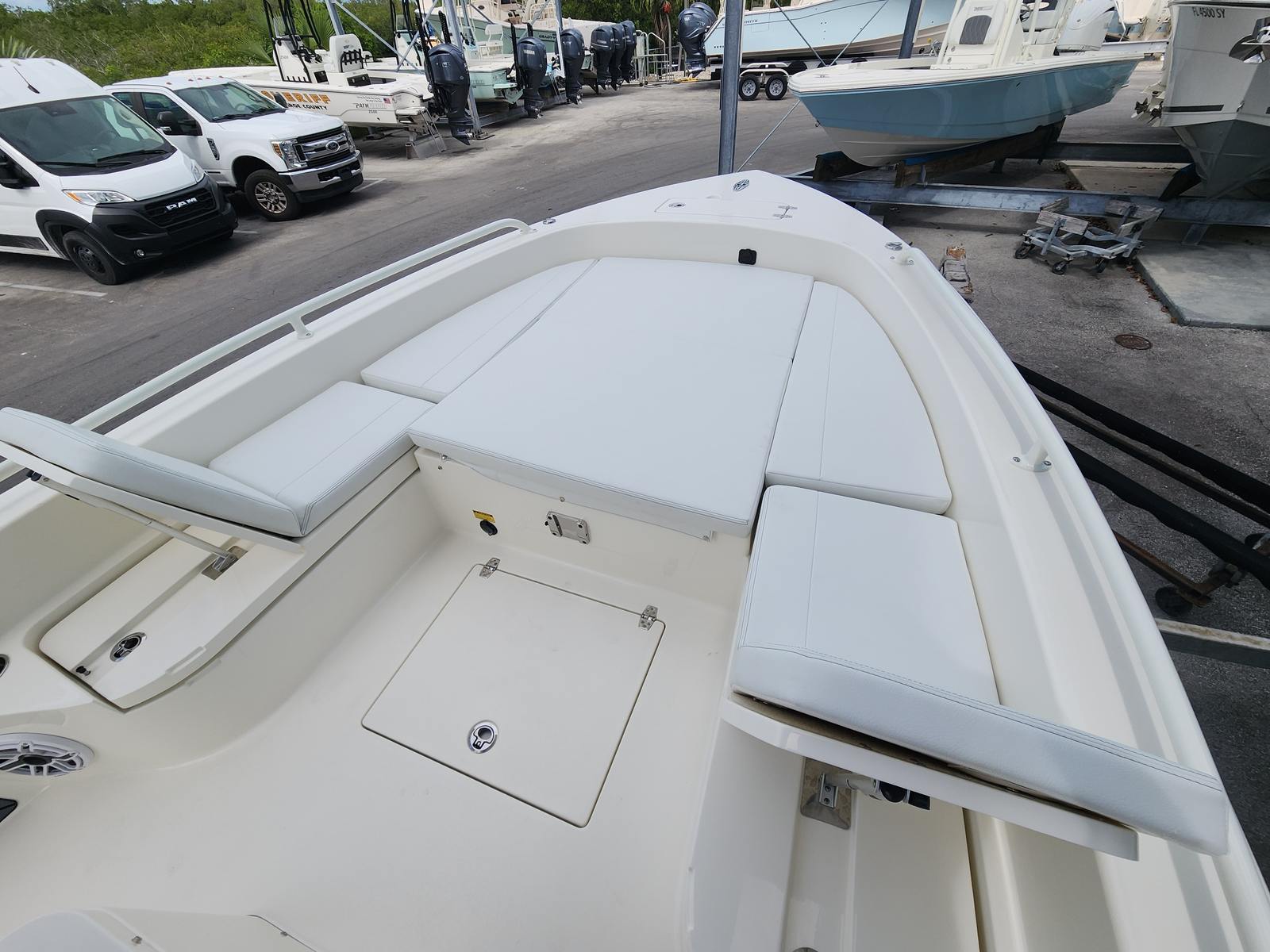 The Pathfinder 2600 TRS is packed with features designed to elevate your boating experience. The Yamaha 350XSA engine is renowned for its reliability and power, making it a top choice for those who demand performance without compromise. The Helm Master EX system with integrated digital electric steering offers advanced control, making docking and maneuvering a breeze. The jackplate provides added versatility, allowing you to adjust the engine height for shallow water navigation or improved speed. The upgraded Edson steering wheel with a stainless power knob adds a touch of luxury and ergonomic comfort, while the trim tabs and indicator ensure you can maintain the perfect running attitude in any conditions.The hull’s two-tone Bayside Blue and Pure White color scheme not only enhances the boat’s visual appeal but also reflects its premium build quality. Every detail, from the hull design to the advanced steering and control systems, is crafted to deliver a superior on-water experience.