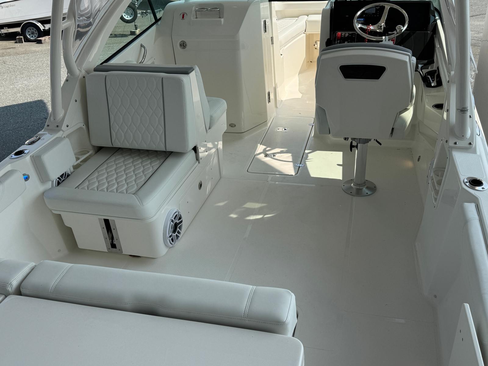 The Pursuit DC 246 is packed with premium features designed to enhance your boating experience. The upgraded upholstery in white and gray not only elevates the boat’s aesthetic but also ensures maximum comfort for you and your guests. The anchor windlass system with remote makes anchoring effortless, allowing you to secure your spot with the push of a button. For convenience and comfort, the electric fresh water head comes equipped with a 6-gallon holding tank, providing a private and functional restroom on board.Ambient lighting is provided by four mid-level cockpit accent lights in LED blue, creating a relaxing atmosphere for evening cruises or dockside gatherings. The stereo system receives a premium upgrade with JL Audio components, including a 6-channel DSP amp, subwoofer, four sport speakers with blue backlighting, and an external antenna. The Sirius receiver and included three-month subscription ensure you have access to your favorite music and entertainment while on the water. The forward poly table adds versatility to the bow area, perfect for dining, socializing, or simply enjoying the view.