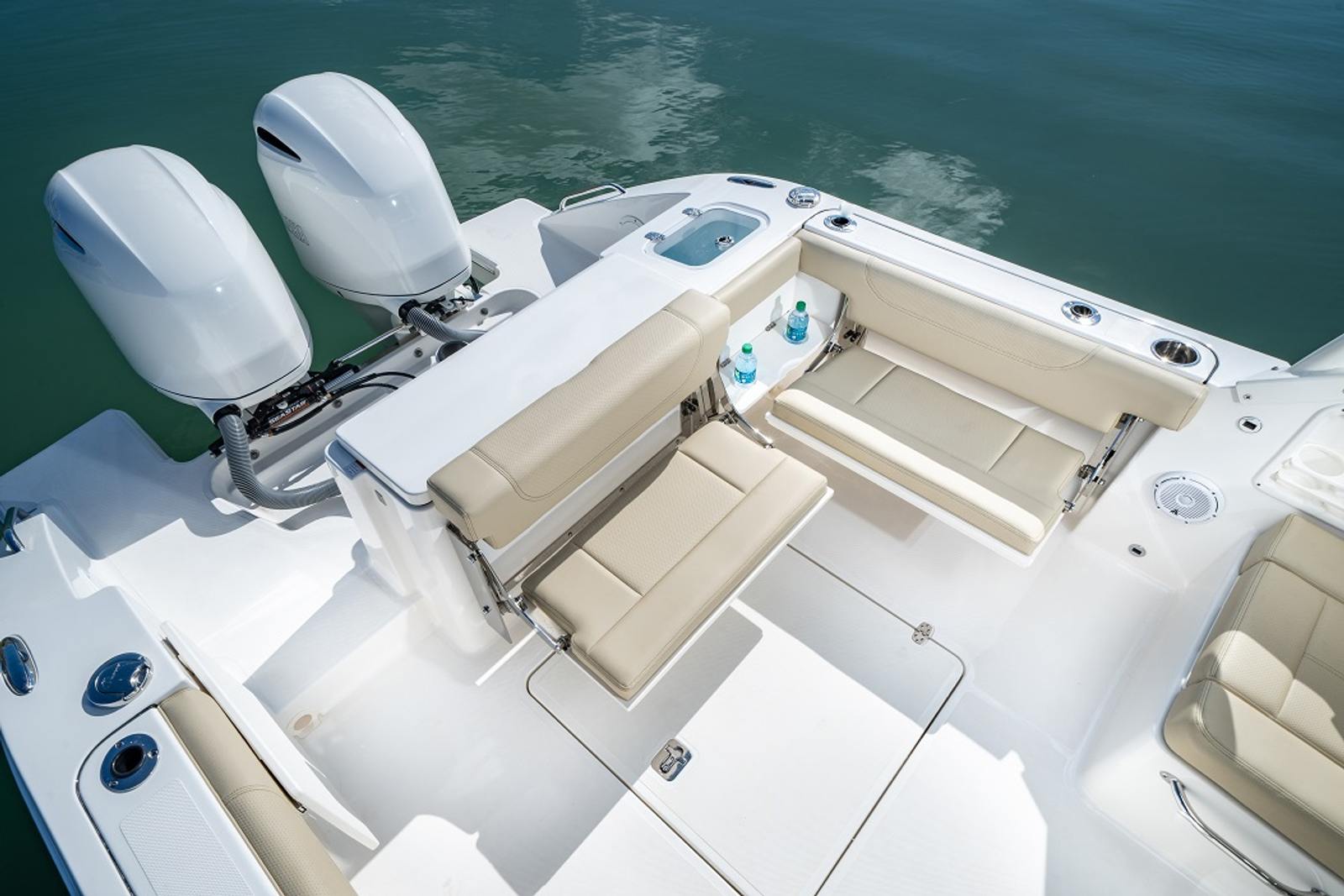 The Pursuit DC 266 is as practical as it is stylish. The Dual Console design provides excellent storage options for gear, water toys, and personal items, keeping the deck clutter-free and organized. The boat’s manageable length makes docking and maneuvering straightforward, even for those new to boating. The efficient twin Yamaha F200 engines offer a balance of power and fuel economy, allowing you to spend more time on the water and less time refueling.The anchor windlass system with remote adds convenience when anchoring in various locations, while the LED cockpit lights enhance visibility and safety during evening outings. The removable ski tow mount and versatile bow table make it easy to adapt the boat for different activities, from water sports to casual dining.