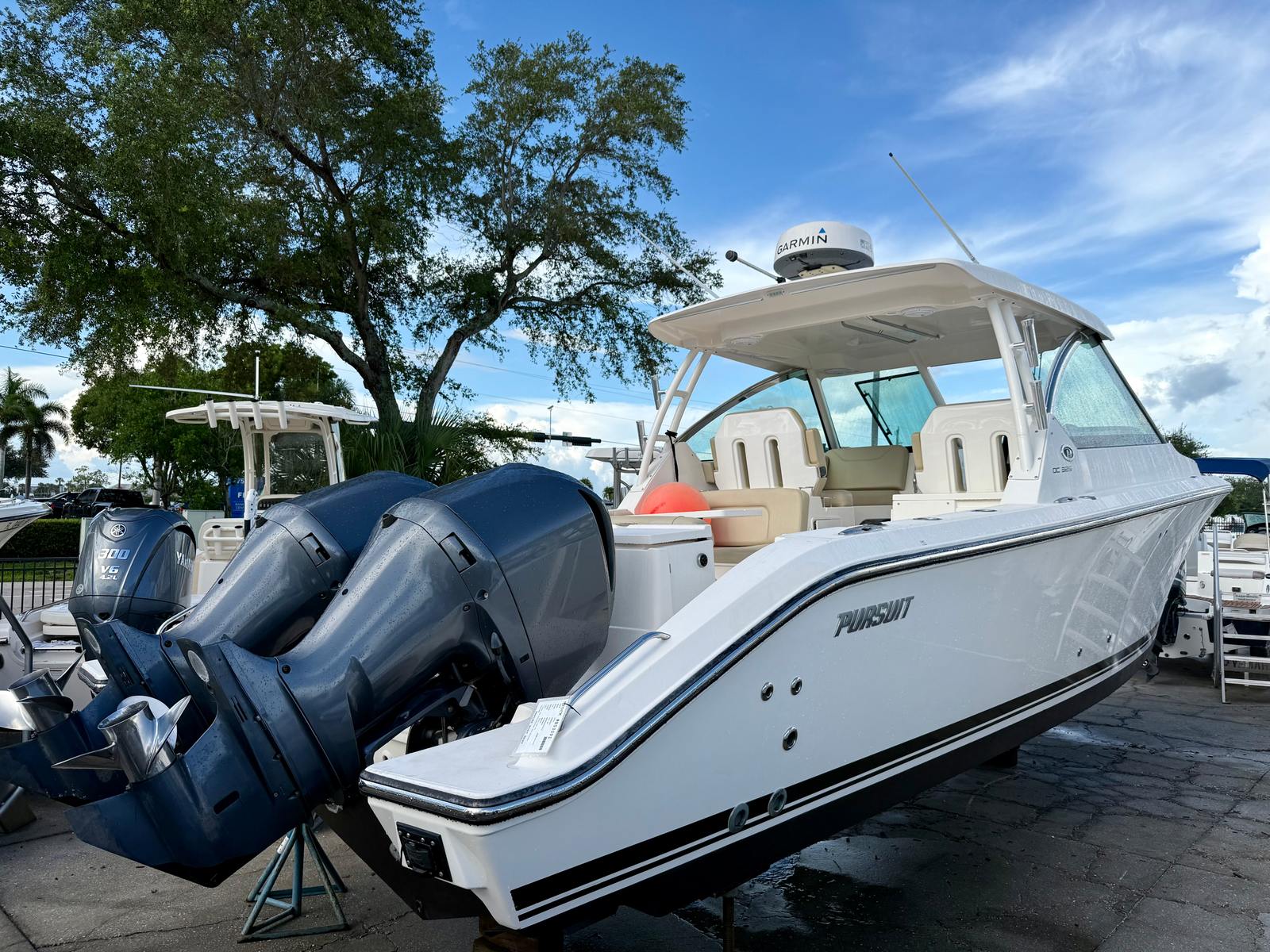 Practicality is a hallmark of the Pursuit DC 325. The generous storage options make it easy to stow away everything you need for a day on the water, from fishing gear and water toys to picnic supplies and extra clothing. The dual console layout enhances safety and convenience, allowing for easy access to all areas of the boat and providing protection from wind and spray when needed.Docking and maneuvering are made simple thanks to the boat’s responsive handling and well-designed helm station. Whether you are an experienced captain or new to boating, you will appreciate the intuitive controls and visibility offered by the DC 325. The efficient twin engines not only deliver impressive power but also contribute to fuel efficiency, helping you make the most of every outing.