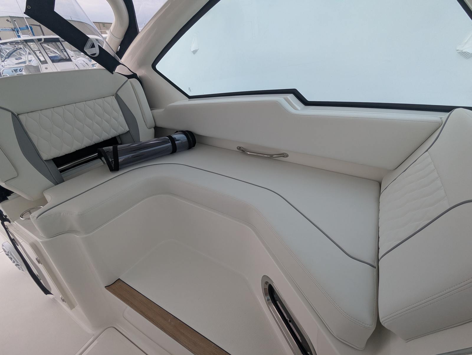 The Pursuit DC 326 is loaded with premium features designed to enhance every aspect of your boating experience. The hardtop-mounted rod holders (six in total) and Gemlux Deluxe 18’ Hybrid carbon fiber outrigger poles with a double rigging kit make this boat a dream for serious anglers. Whether you’re trolling for big game or enjoying a leisurely day of fishing, these features provide the flexibility and convenience you need. The ACR RCL-100 LED spotlight, with remote control at the helm, ensures clear visibility during nighttime excursions, adding an extra layer of safety and confidence. The helm, finished in Carbon, is both stylish and functional, offering a commanding view and easy access to all controls. The upgraded upholstery in white and gray not only looks fantastic but also provides superior comfort for you and your guests.