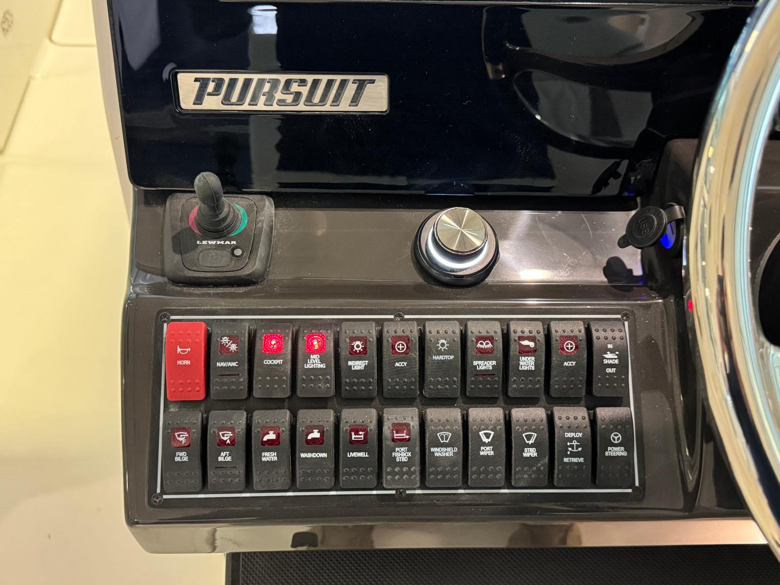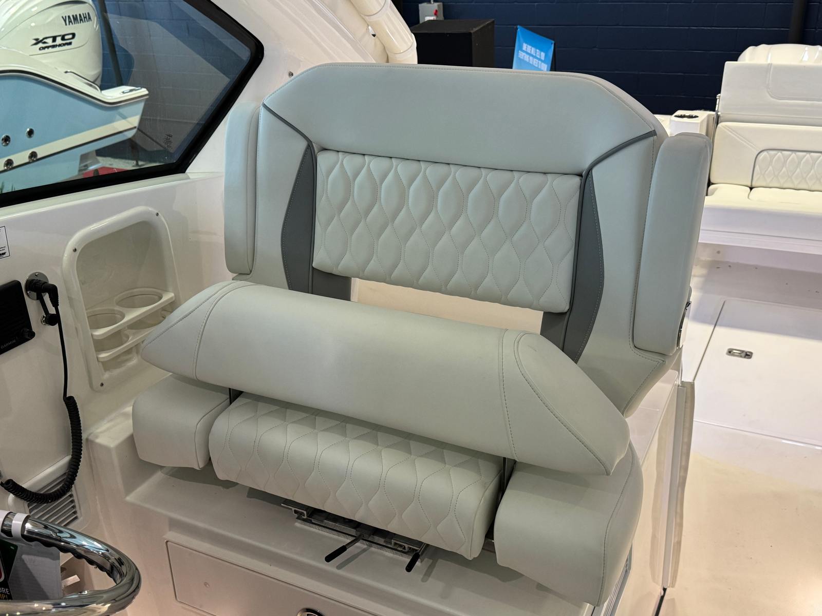 When it comes to performance, the Pursuit DC 326 is in a league of its own. Powered by twin Yamaha Digital F350 V6 Offshore engines in Pearlescent White, this Dual Console boat delivers a combined 600 horsepower, ensuring exhilarating speed and responsive handling. The integrated Digital Electric Steering (DES) and Helm Master EX Digital Electronic Control (DEC) provide precise control and effortless maneuverability, making docking and navigation a breeze. For those who demand the ultimate in control, the Yamaha Joystick Control with Full Maneuverability, including Set Point and Autopilot, offers advanced handling capabilities, allowing you to pilot your boat with confidence in any conditions.