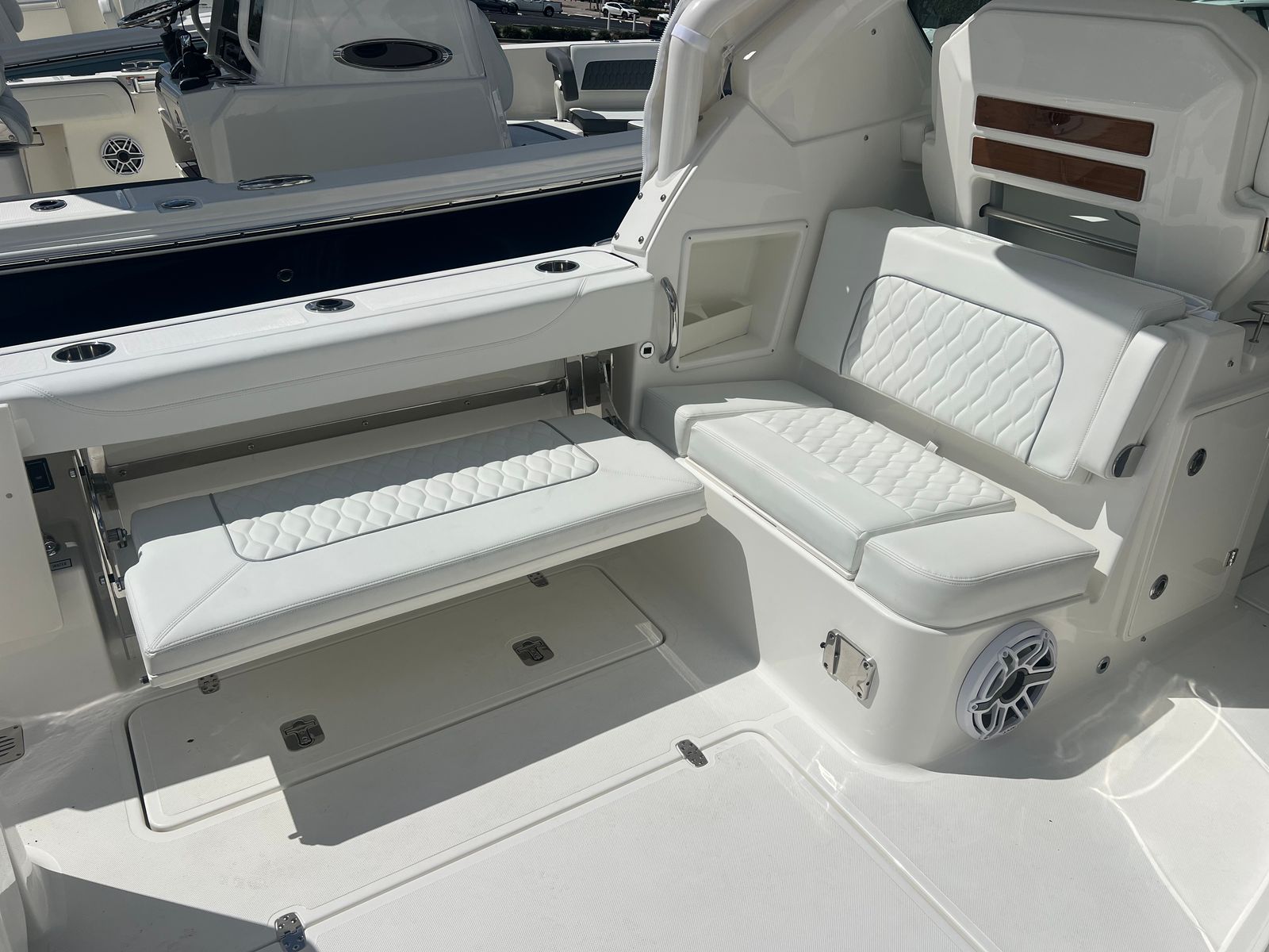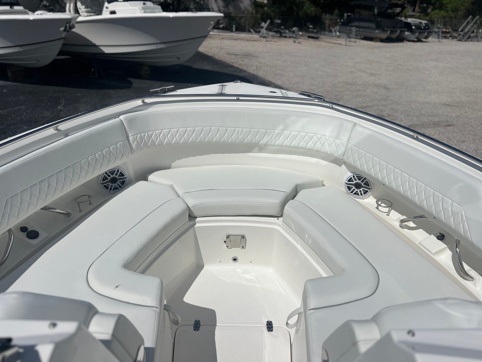 Power and precision are at the heart of the Pursuit DC 326. Equipped with twin Yamaha F350 engines, this dual console boat boasts a combined 700 horsepower, delivering exhilarating speed and smooth handling. The Yamaha Joystick Control with Full Maneuverability transforms docking and tight navigation into effortless tasks, allowing you to command the boat with confidence and ease. Whether you’re cruising along the coastline or venturing into open waters, the Pursuit DC 326 offers a responsive and stable ride that will satisfy even the most discerning boating enthusiasts.