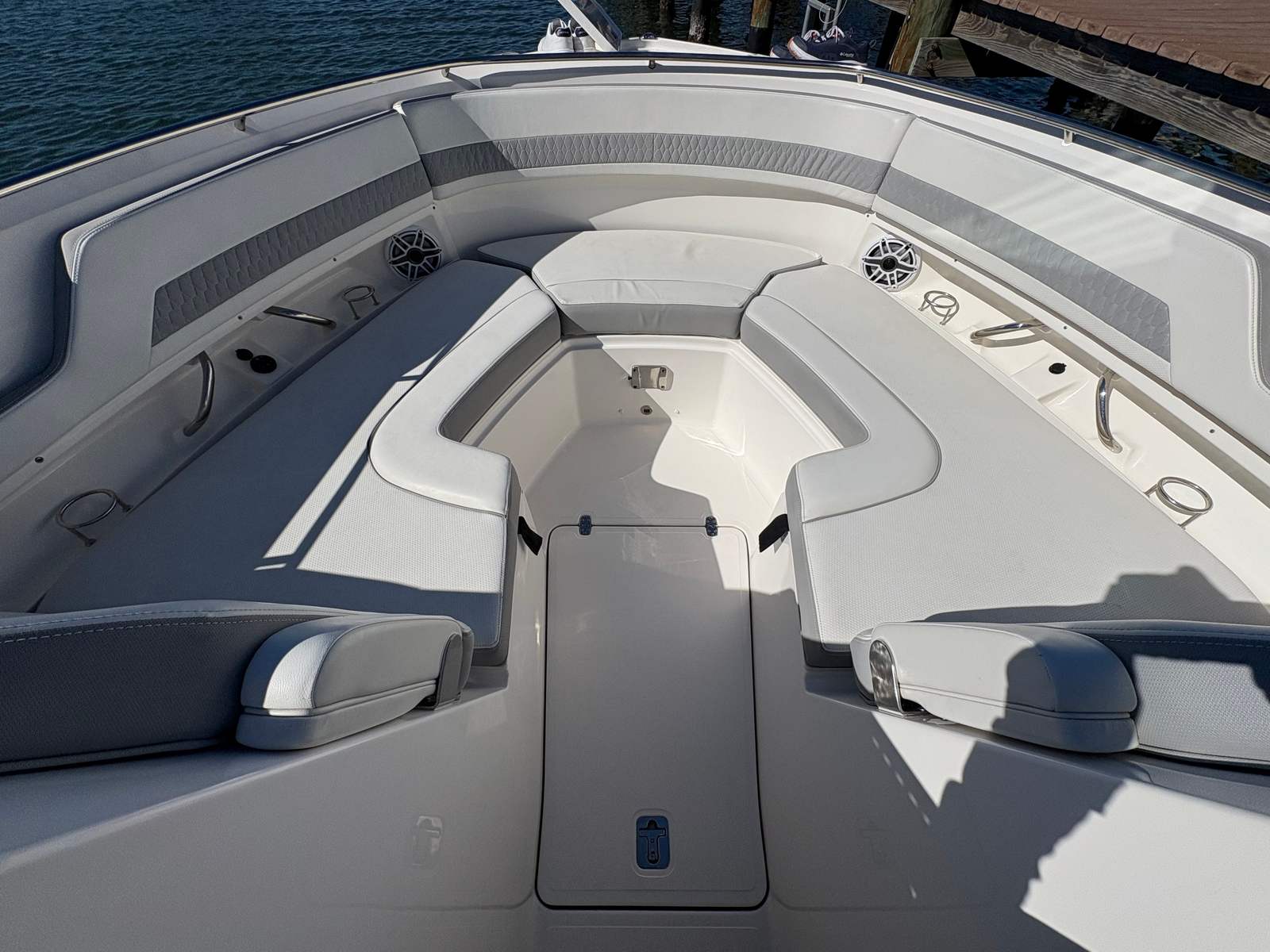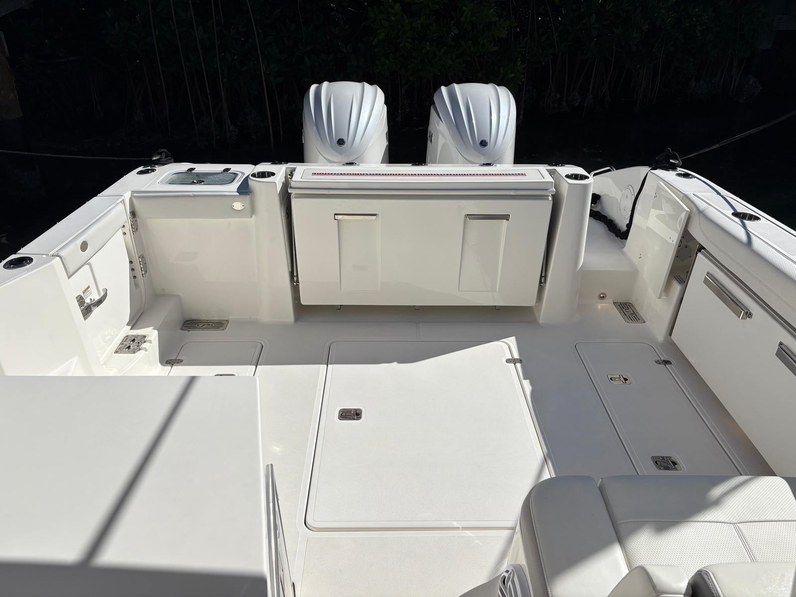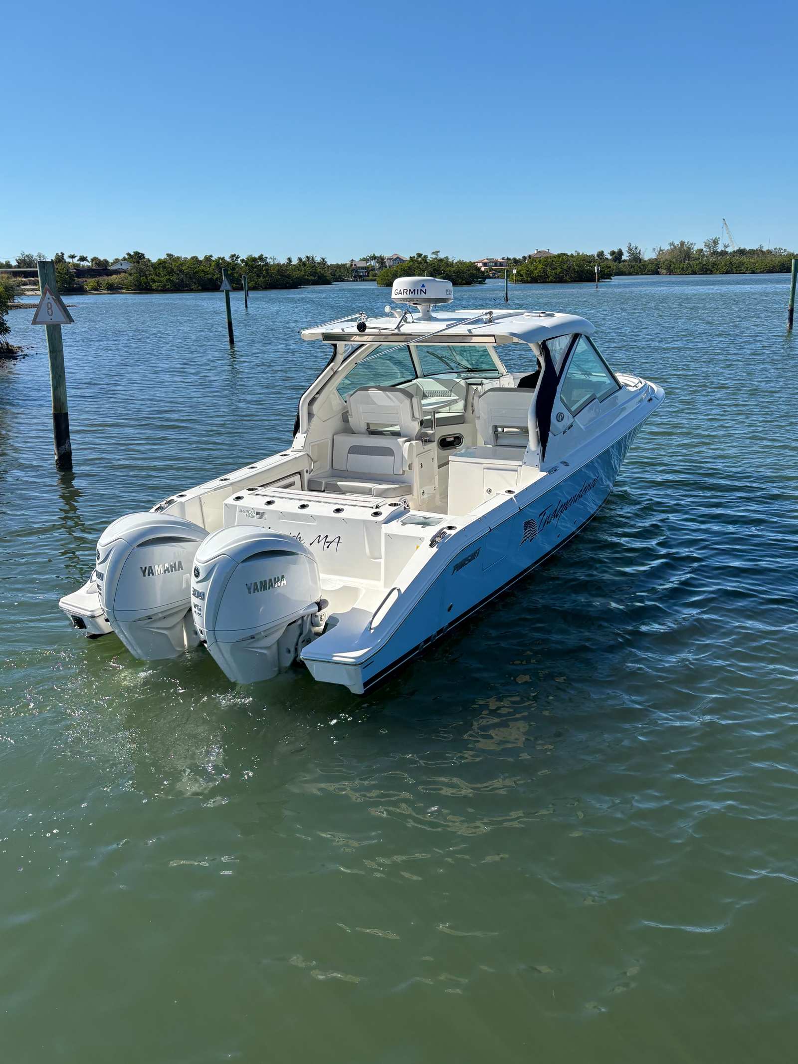 Step aboard to find crisp white upholstery, a bridge deck table, and a custom retractable sunshade for flexible entertaining. Enjoy immersive sound with the Premium JL Audio Package, and protect your investment with an aft curtain, instrument cover, and bow tonneau cover. Equipped with Garmin GMR 24 xHD radar, this 326 DC is fully outfitted for cruising, fishing, or relaxing days on the water. Well-maintained, beautifully optioned, and turnkey ready. Note this boat is bottom painted.
