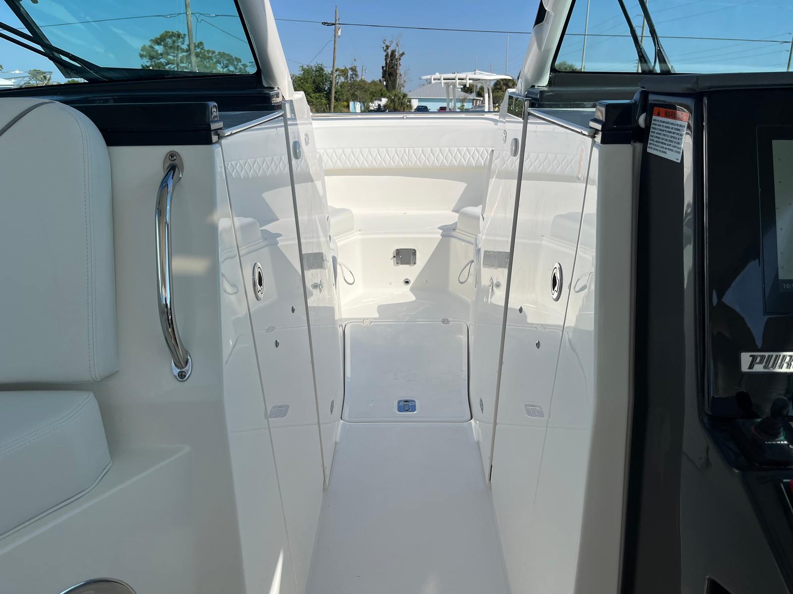 The Pursuit DC 326 is as practical as it is stylish. The twin Yamaha engines and joystick control make docking and maneuvering a breeze, even in crowded marinas or tight slips. The diesel generator and air conditioning package provide the comfort and convenience needed for overnight stays or long days on the water. The upgraded upholstery and durable finishes are designed to withstand the rigors of marine life while maintaining their beauty and comfort. With plenty of storage for gear and supplies, this dual console boat is ready for any adventure you have in mind.