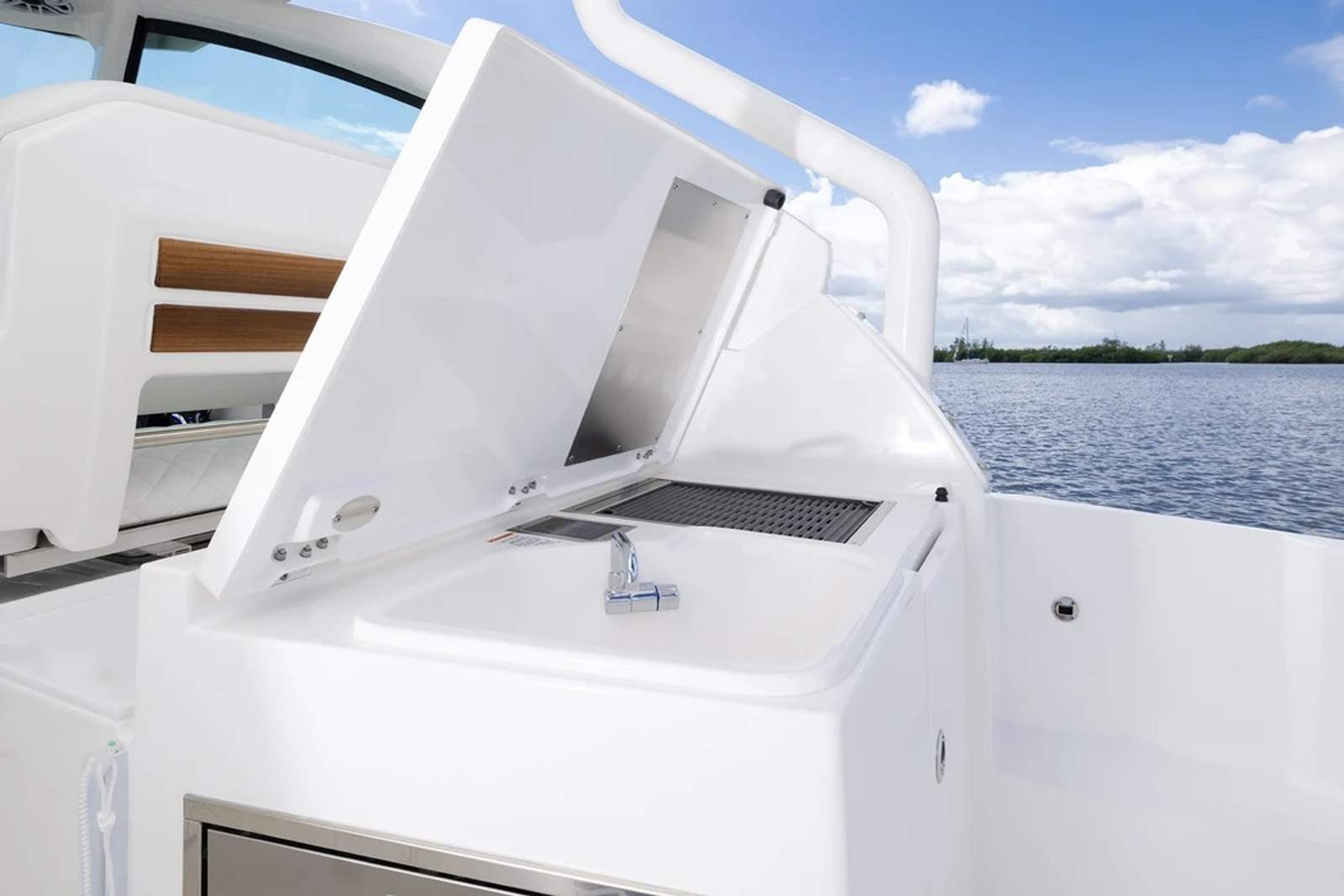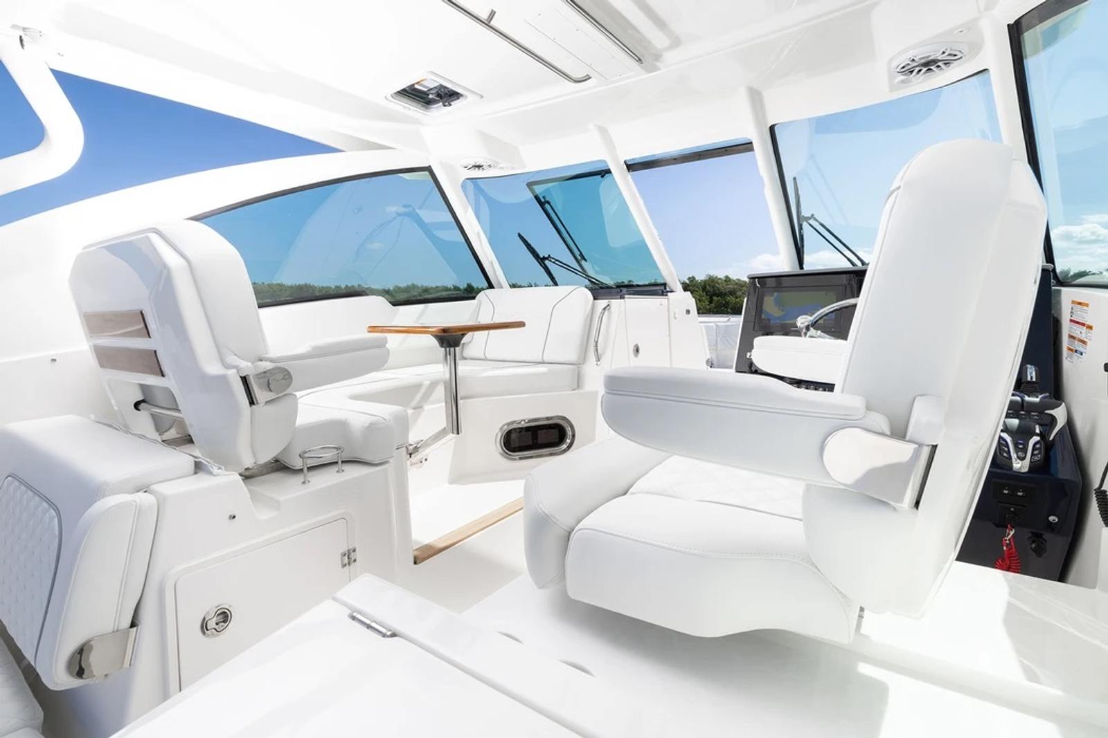 The Pursuit DC 326 is loaded with premium features designed to elevate your boating experience. The helm and footrest are finished in a stylish Carbon color, complementing the overall aesthetic and providing a comfortable command center for the captain. The diesel genset ensures reliable onboard power, while the Cabin Bridgedeck A/C Package keeps the interior cool and comfortable, even on the hottest days. Entertain guests with the cockpit grill, perfect for preparing delicious meals while enjoying the open air. The hardtop-mounted LED sportlight at the helm control enhances visibility during evening cruises, adding both safety and style to your outings.