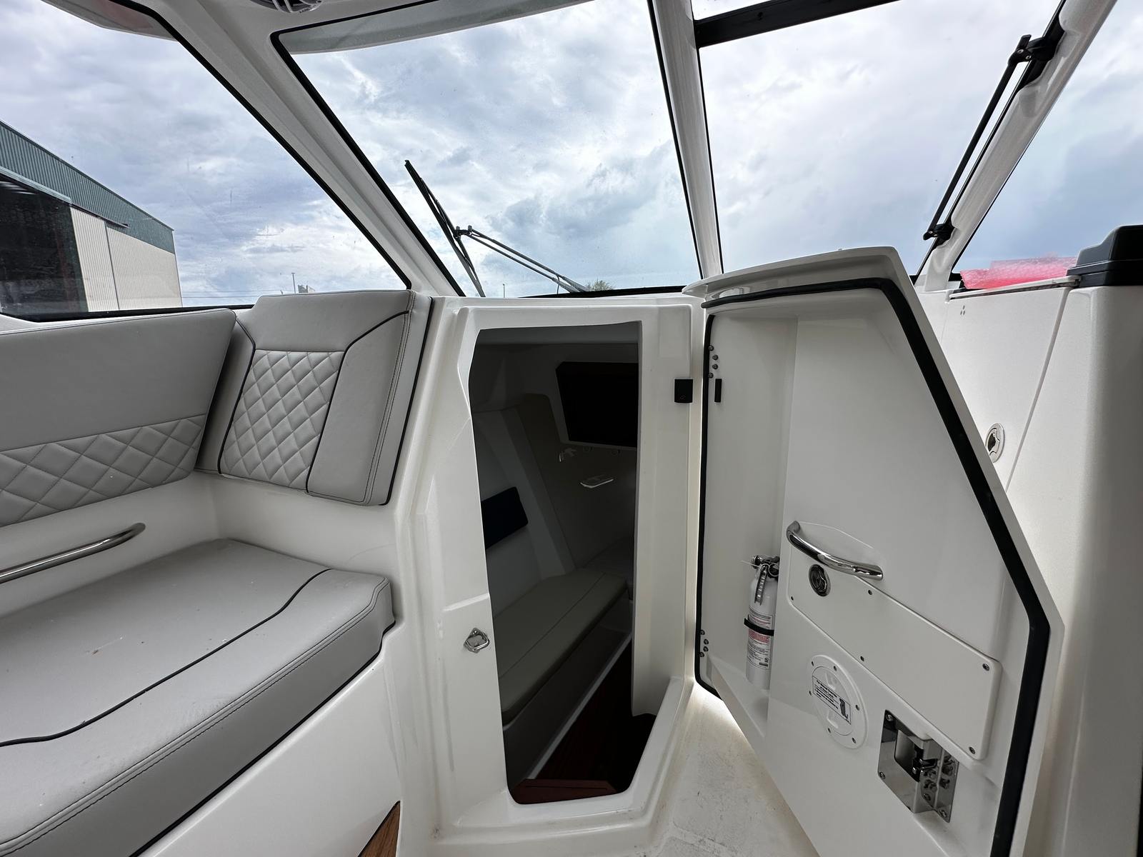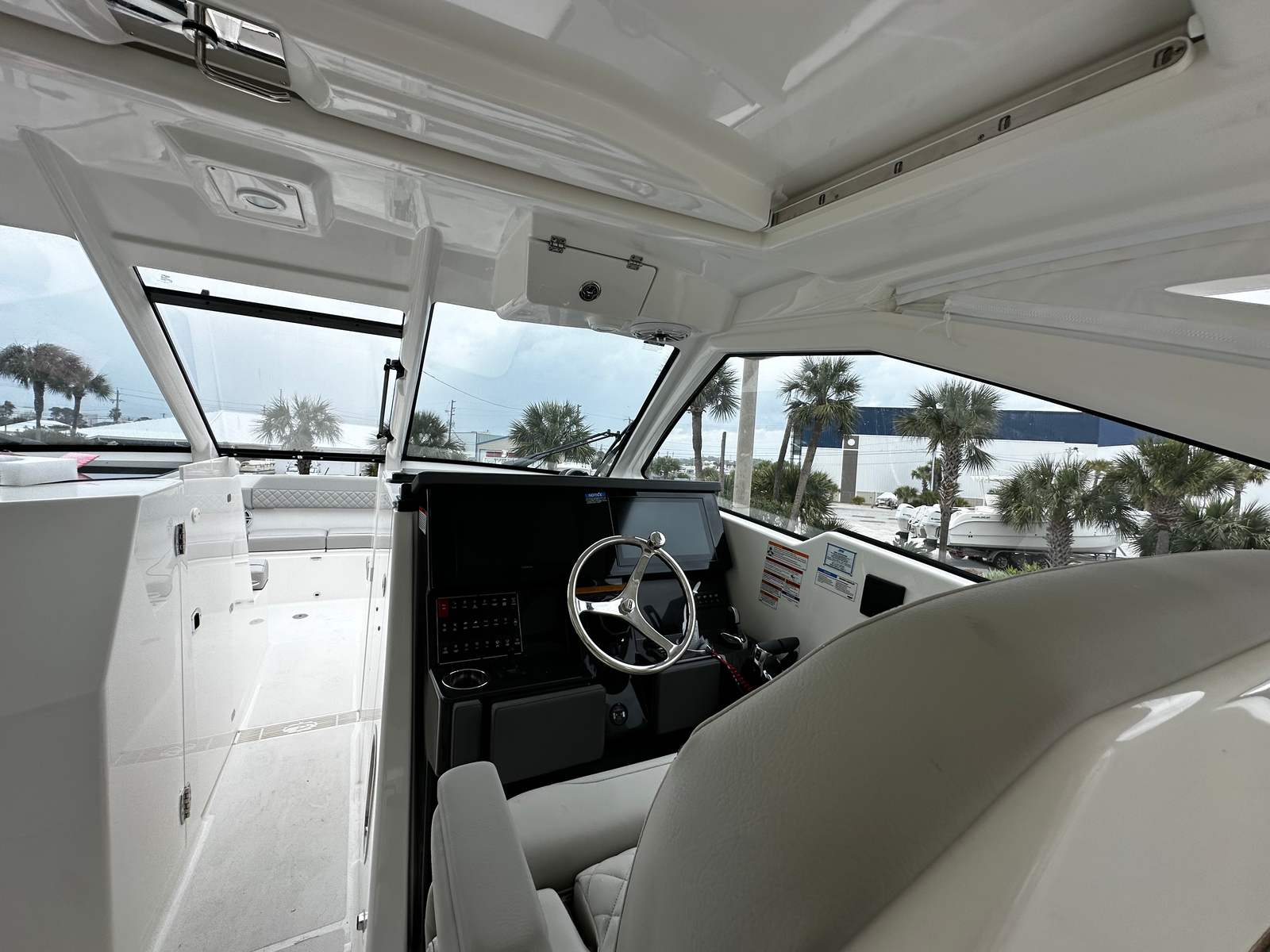 The Pursuit DC 365 is loaded with premium features that set it apart from other Dual Console boats for sale. The black bootstripe adds a touch of elegance to the exterior, while the four underwater lights create a captivating ambiance for evening cruises or dockside gatherings. Navigation and safety are enhanced by the Garmin Radar Open Array GMR Fantom 54, providing cutting-edge radar technology for superior situational awareness. The interior, finished in the serene Tranquil Sea color scheme, offers a relaxing and inviting atmosphere for you and your guests.For added comfort and protection, the DC 365 includes a white Stamoid aft curtain, shielding the cockpit from the elements while maintaining a clean, modern look. The Bow Mediterranean Style Sunshade provides ample shade for those sunny days, allowing you to relax in comfort at the bow. The cockpit air conditioning system ensures a cool and pleasant environment, even on the hottest days, making every outing enjoyable regardless of the weather.At the helm, the carbon finish adds a touch of high-tech sophistication, while the FLIR M332 Night Vision with image stabilization enhances safety and confidence during nighttime navigation. These features combine to create a Dual Console boat that is as functional as it is luxurious, making the Pursuit DC 365 a standout choice for discerning boaters.
