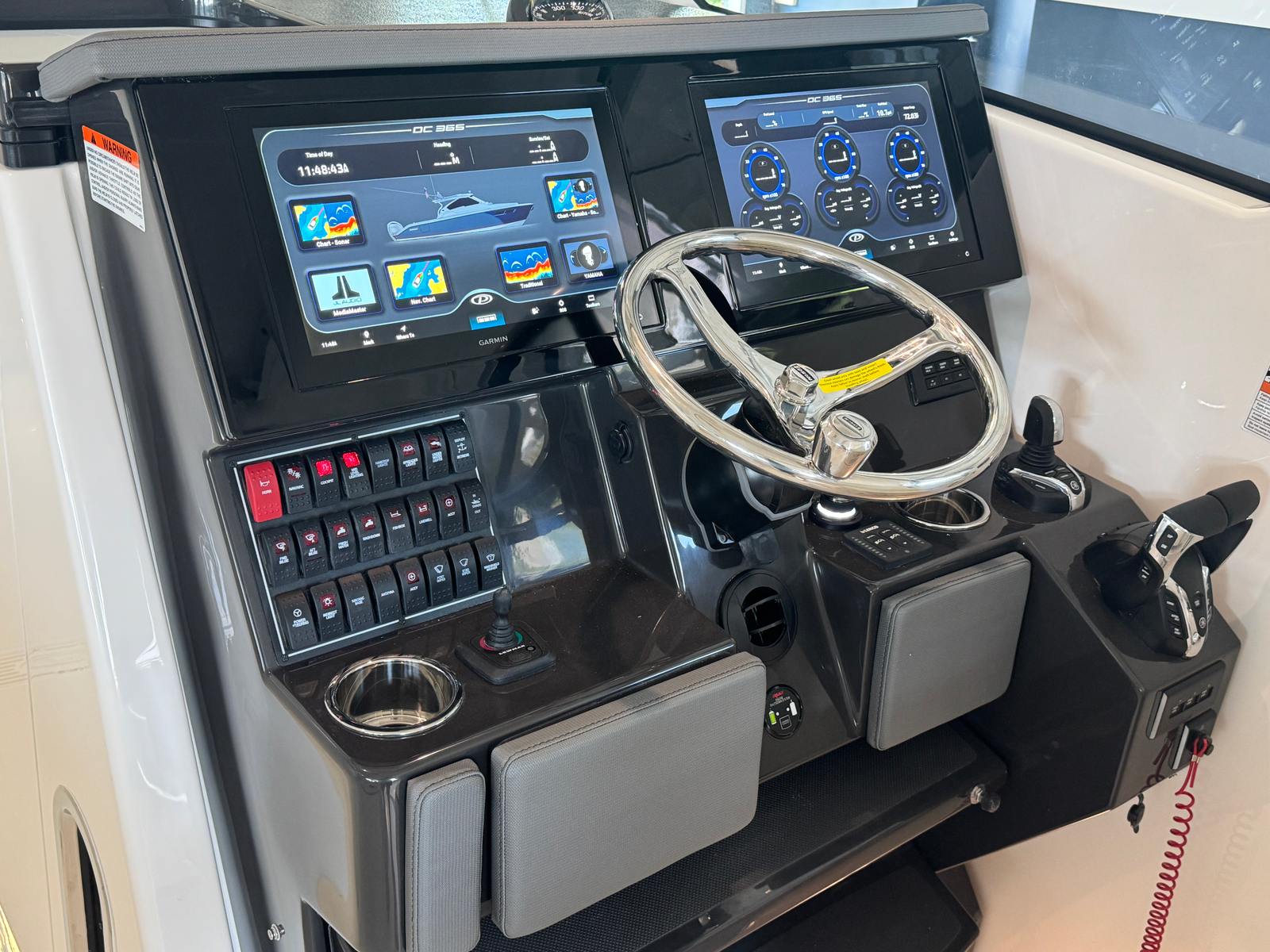 The 2026 Pursuit 365 DC is loaded with premium features designed to enhance your boating lifestyle. Enjoy the convenience of a 12v, 2.3 cu. ft. cooler with a chill plate located under the aft-facing seat, perfect for keeping refreshments cold during long days on the water. The 240v/60Hz cockpit air conditioning system with 16,000 BTU ensures you and your guests remain cool and comfortable, even on the hottest summer days. Navigation and control are elevated with a second Garmin widescreen 16" display, providing advanced technology at your fingertips for safer and more enjoyable voyages.For those who appreciate both style and function, the boat features a white aft curtain Stamoid and a matching bow tonneau cover, offering protection from the elements while maintaining a crisp, elegant appearance. The bridgedeck teak table with dedicated storage adds a touch of luxury and provides a perfect setting for onboard dining or socializing. The cadet gray instrument cover protects your helm from the sun and weather, ensuring your controls remain in pristine condition. A custom retractable Makefast sunshade with one-touch operation allows you to easily create shade or bask in the sun as you please. The forward poly table offers additional space for entertaining or relaxing at the bow.