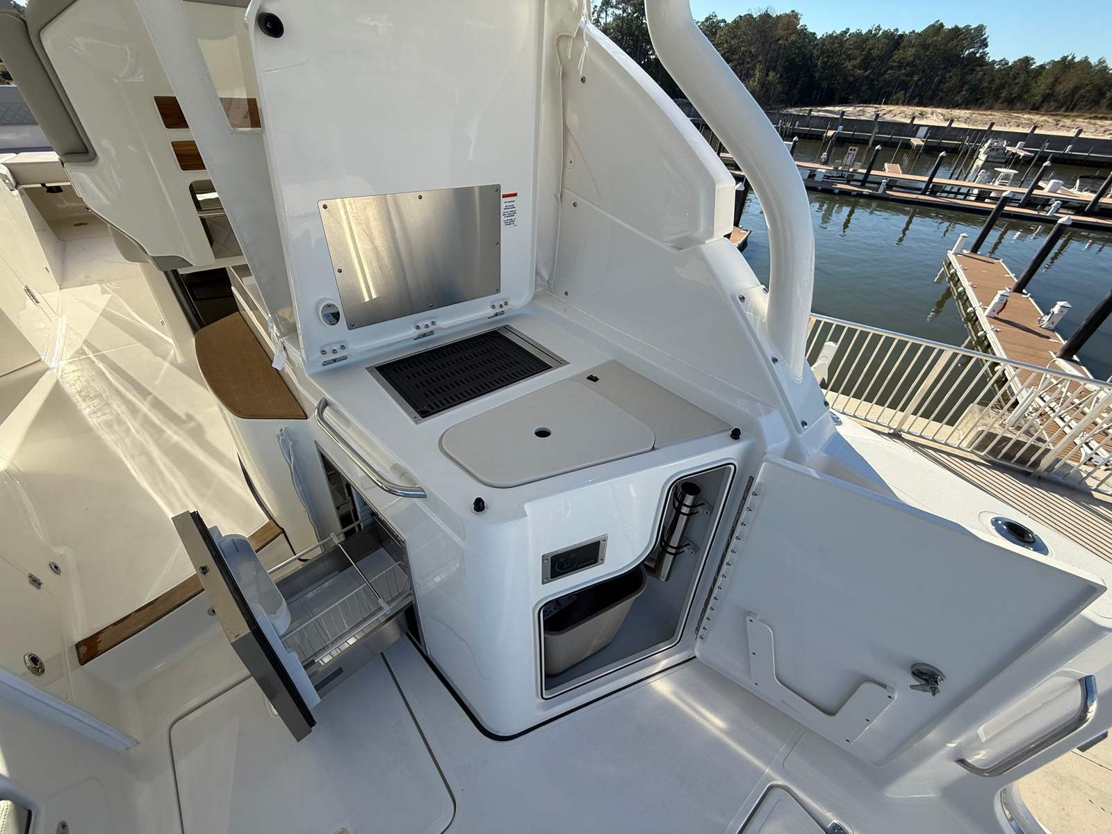 The Pursuit DC 365 is as practical as it is luxurious. Its dual console design offers versatile storage solutions, making it easy to stow gear, water toys, and personal items securely. Docking is a breeze thanks to the boat’s responsive handling and intuitive helm controls, allowing you to maneuver confidently in tight spaces or busy marinas.Fuel efficiency is optimized by the triple-engine configuration, providing the power you need without compromising on economy. The bridgedeck teak table with storage adds a layer of convenience for onboard dining and entertaining, while the chill plate-equipped cooler ensures you’re always prepared for impromptu picnics or celebrations.