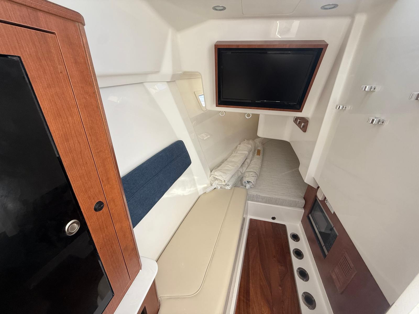 Powering the Pursuit DC 365 are three robust engines, delivering a combined 1050 horsepower. This triple-engine setup ensures exhilarating acceleration, smooth cruising, and reliable handling in various sea conditions. Whether you’re navigating coastal waters or venturing offshore, the Pursuit DC 365 offers the kind of performance that serious boaters demand. The advanced helm, featuring a carbon finish, provides a modern and intuitive command center, allowing you to control every aspect of your journey with confidence and precision.