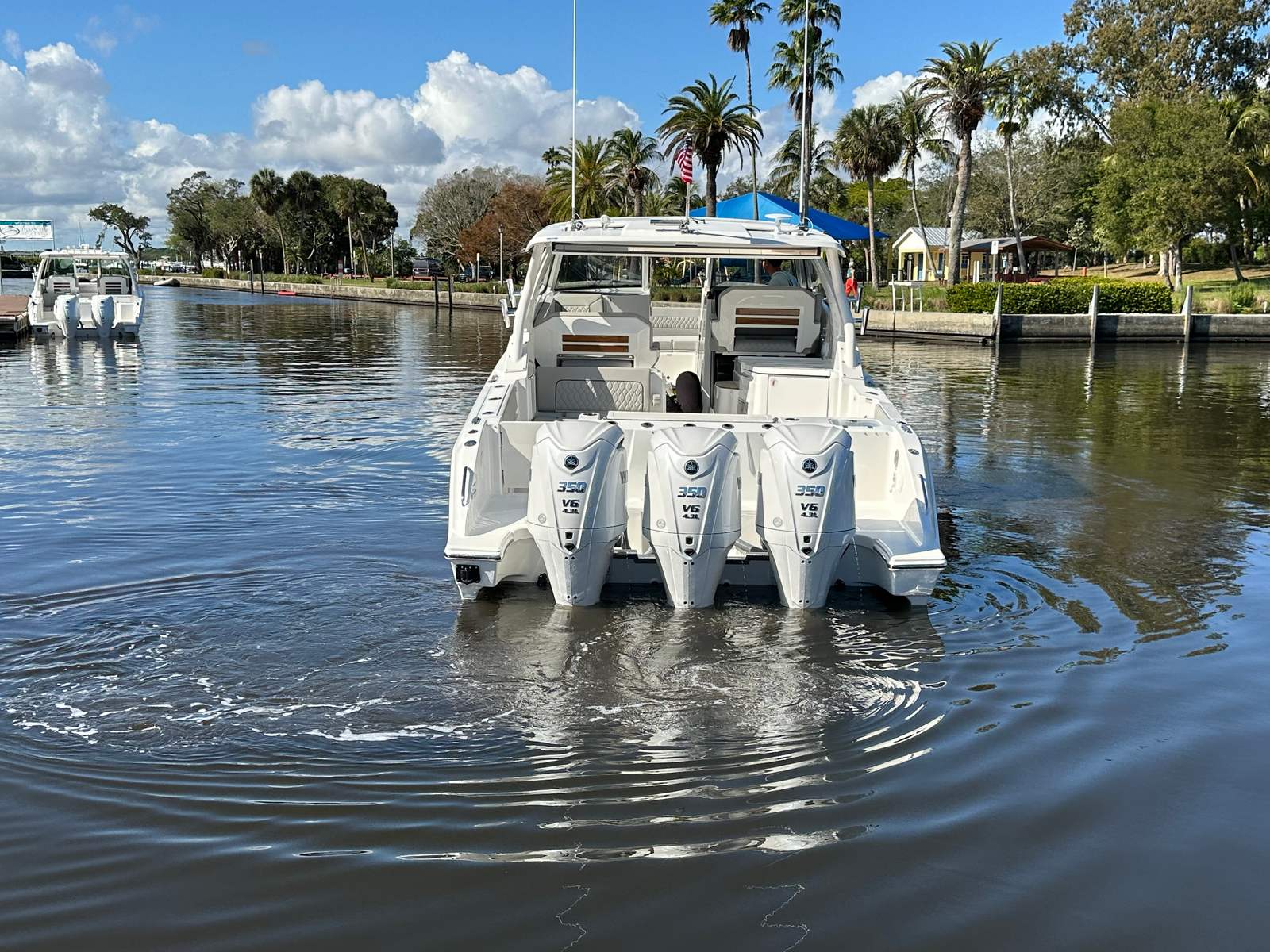 The Pursuit DC 365 is designed with practicality in mind, making ownership easy and enjoyable. The spacious layout provides plenty of room for storing gear, water toys, and essentials, so you’re always prepared for a day on the water. The dual console configuration makes docking and maneuvering straightforward, whether you’re at a busy marina or a secluded cove. The efficient triple Yamaha engines offer reliable performance and fuel economy, allowing you to spend more time exploring and less time refueling.The hardtop-mounted LED spotlight enhances safety and convenience during nighttime operations, while the cockpit air conditioning keeps everyone cool and comfortable. The upgraded audio system ensures that entertainment is always at your fingertips, and the underwater lights make evening outings truly special. Every detail of the DC 365 is designed to make your boating experience as enjoyable and hassle-free as possible.
