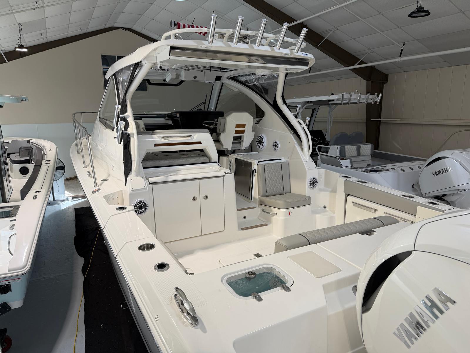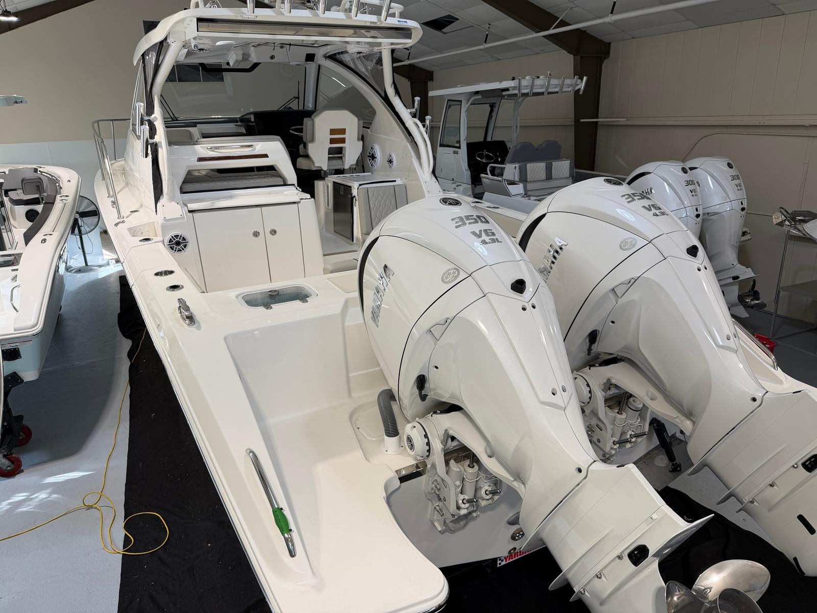 - Twin Yamaha Digital F350 V6 Offshore (Pearlescent White) w/Integrated Digital Electric Steering (DES) and Helm Master EX Digital Electronic Control (DEC) (does not include joystick control), Multifunction Display Interface and Manual Engine Flushing System