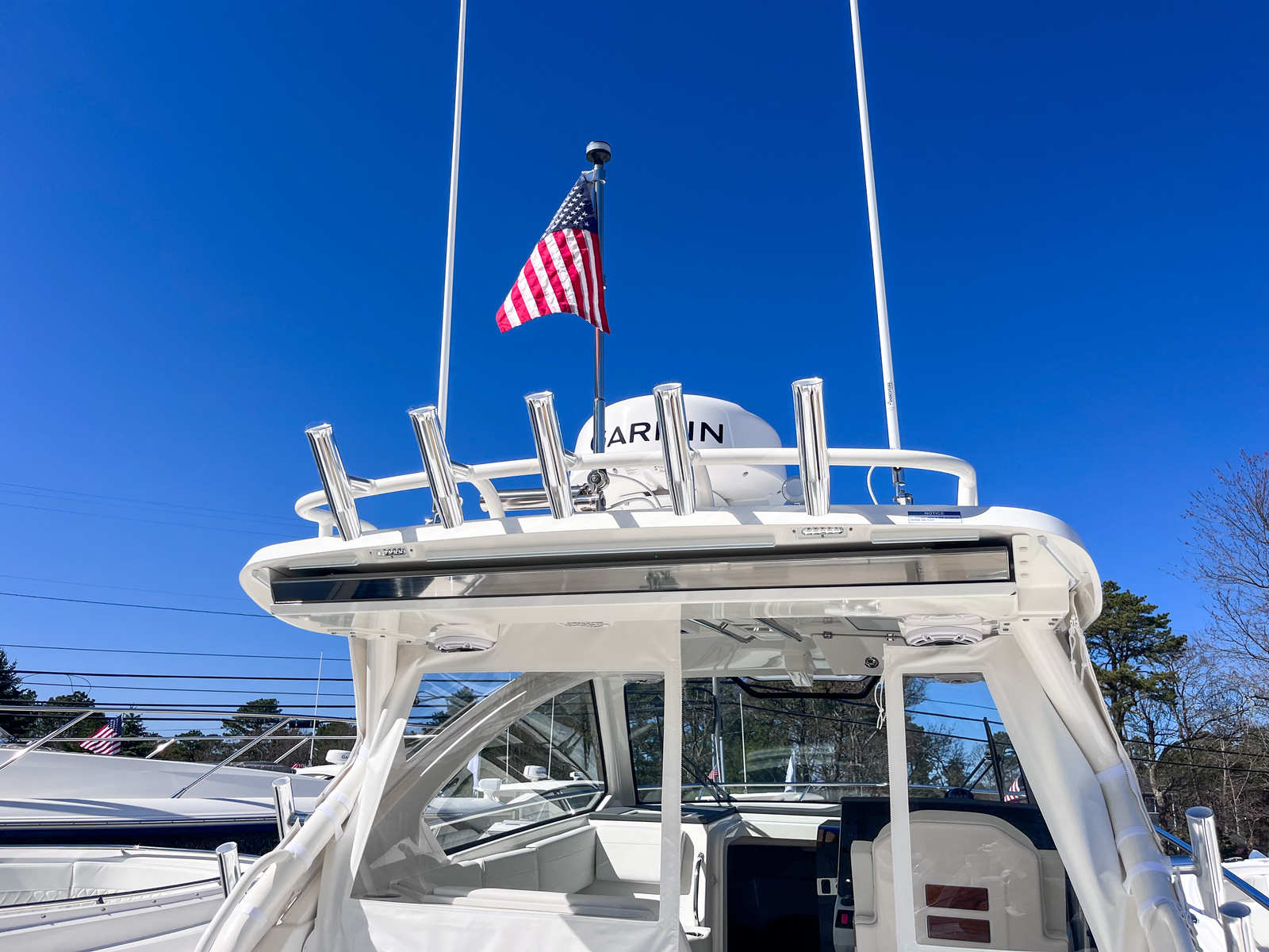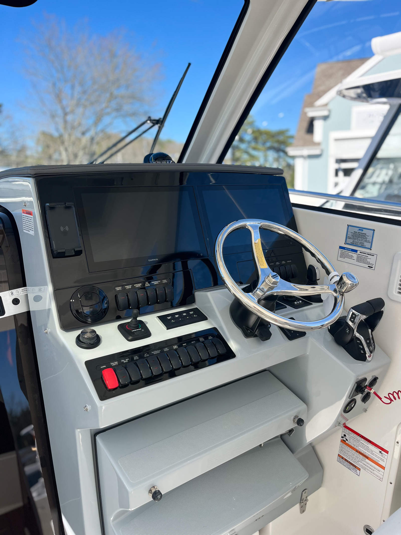 The Pursuit OS 325 is packed with premium features designed to enhance your boating experience. The bow Mediterranean style sunshade is stowable, offering flexible protection from the sun when you need it most. Entertain guests or enjoy a meal with the bridgedeck teak table, which comes with dedicated storage for convenience. Comfort is paramount, with cabin air conditioning featuring reverse cycle 110v/60Hz (10,000 BTU) and cockpit air conditioning with reverse cycle 110v/60Hz (12,000 BTU), ensuring a pleasant environment no matter the weather. The helm, finished in Neptune Gray, is both stylish and functional, providing a commanding view and easy access to all controls. Every detail, from the hull color to the interior finishes, reflects Pursuit’s commitment to quality and luxury.
