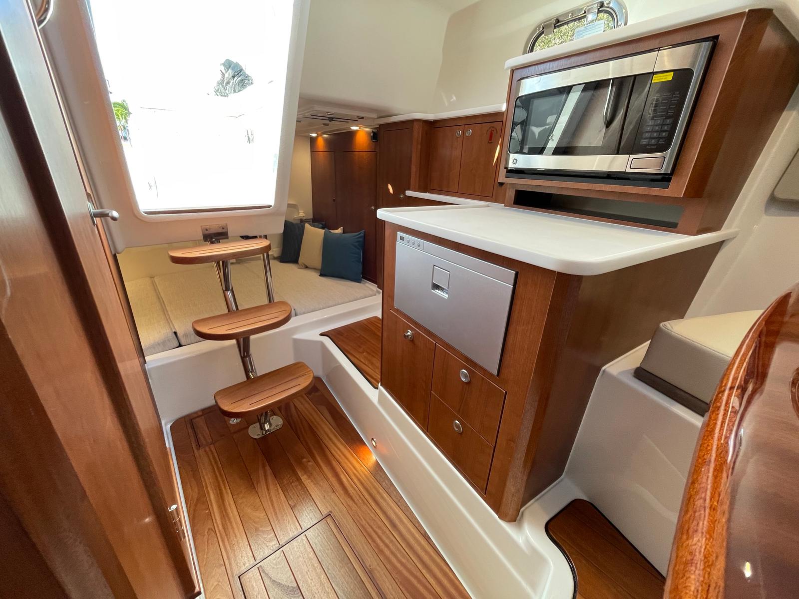 The Pursuit OS 325 is loaded with premium features that set it apart from other cruiser boats for sale. The SeaKeeper Ride 600 stabilizer enhances onboard comfort by minimizing roll, ensuring a smooth and steady experience even in choppy conditions. The helm and footrest, finished in a sophisticated carbon color, provide a modern touch and ergonomic support for long days at the wheel. Inside, the tranquil seas interior fabric and upgraded white upholstery create a serene and inviting atmosphere, perfect for relaxing after a day on the water.For those who value comfort and convenience, the OS 325 is equipped with a generator and a 16-gallon diesel tank, ensuring reliable power for extended trips. The cabin air conditioning with reverse cycle 110v/60Hz keeps the interior climate-controlled, offering respite from the summer heat or chilly evenings. Every detail, from the hull’s fresh white finish to the navy bootstripe, reflects Pursuit’s commitment to quality and style.