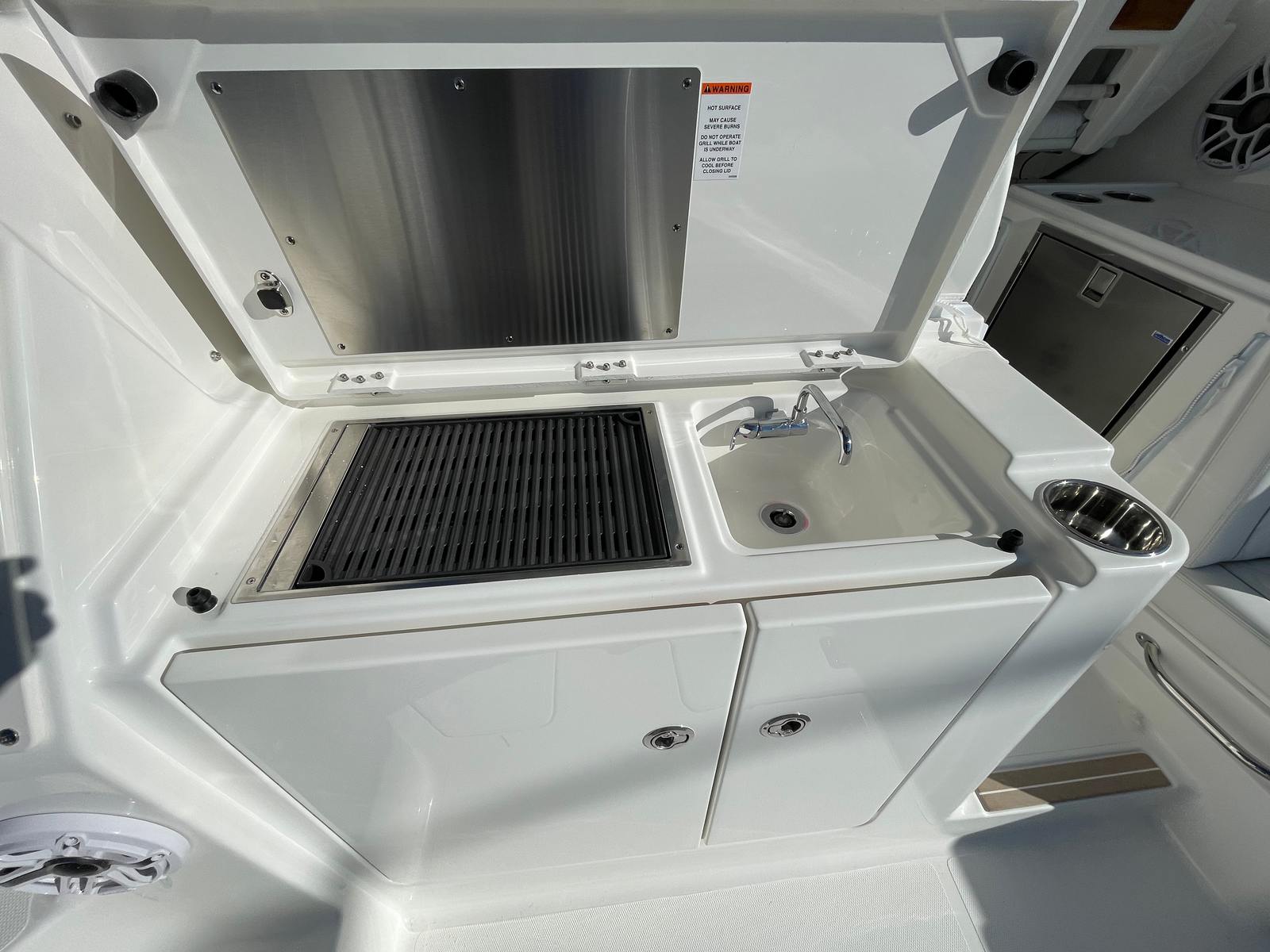 The Pursuit OS 325 is as practical as it is luxurious. Its thoughtful design includes ample storage for gear, supplies, and personal items, keeping the deck clutter-free and organized. The boat’s manageable length of 34.5 feet strikes the perfect balance between spaciousness and ease of handling, making it ideal for both seasoned captains and newcomers alike. The efficient twin Yamaha engines not only deliver impressive performance but also contribute to fuel efficiency, allowing you to spend more time exploring and less time refueling.Docking is a breeze thanks to the Yamaha Joystick Control, which provides precise control in tight spaces and crowded marinas. The generator and diesel tank offer peace of mind during extended trips, ensuring you have the power you need for all your onboard systems. The climate-controlled cabin adds another layer of comfort, making the OS 325 a versatile choice for a wide range of activities and weather conditions.