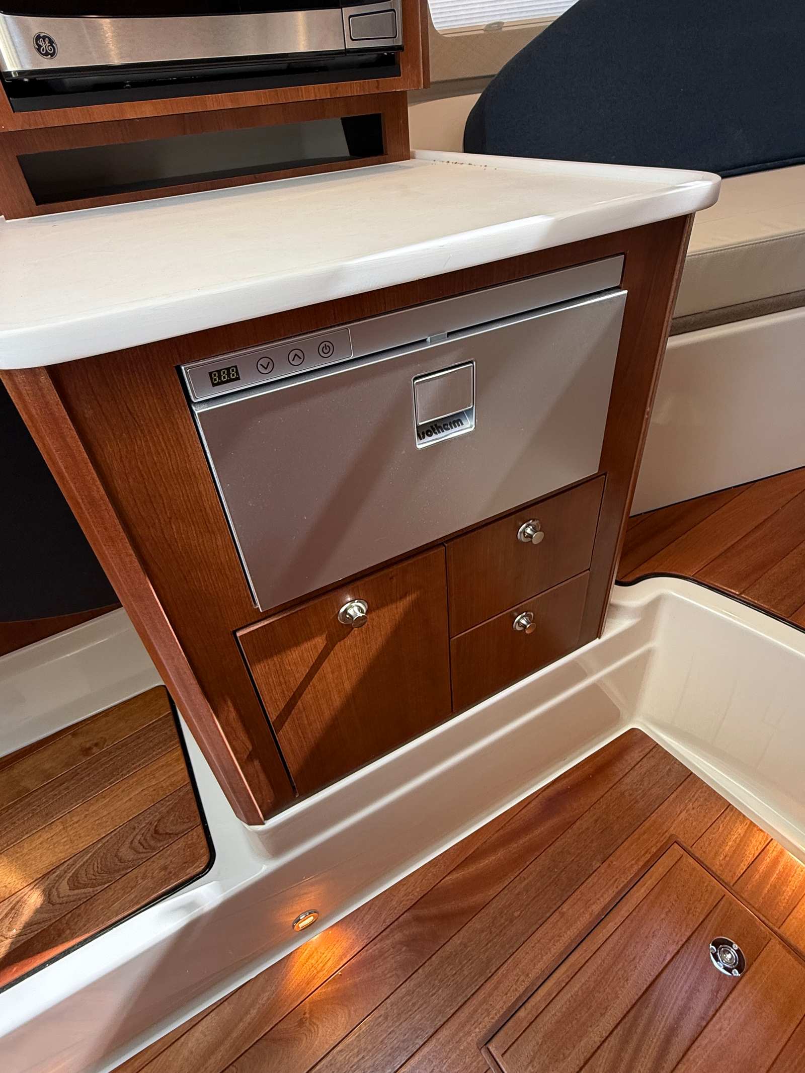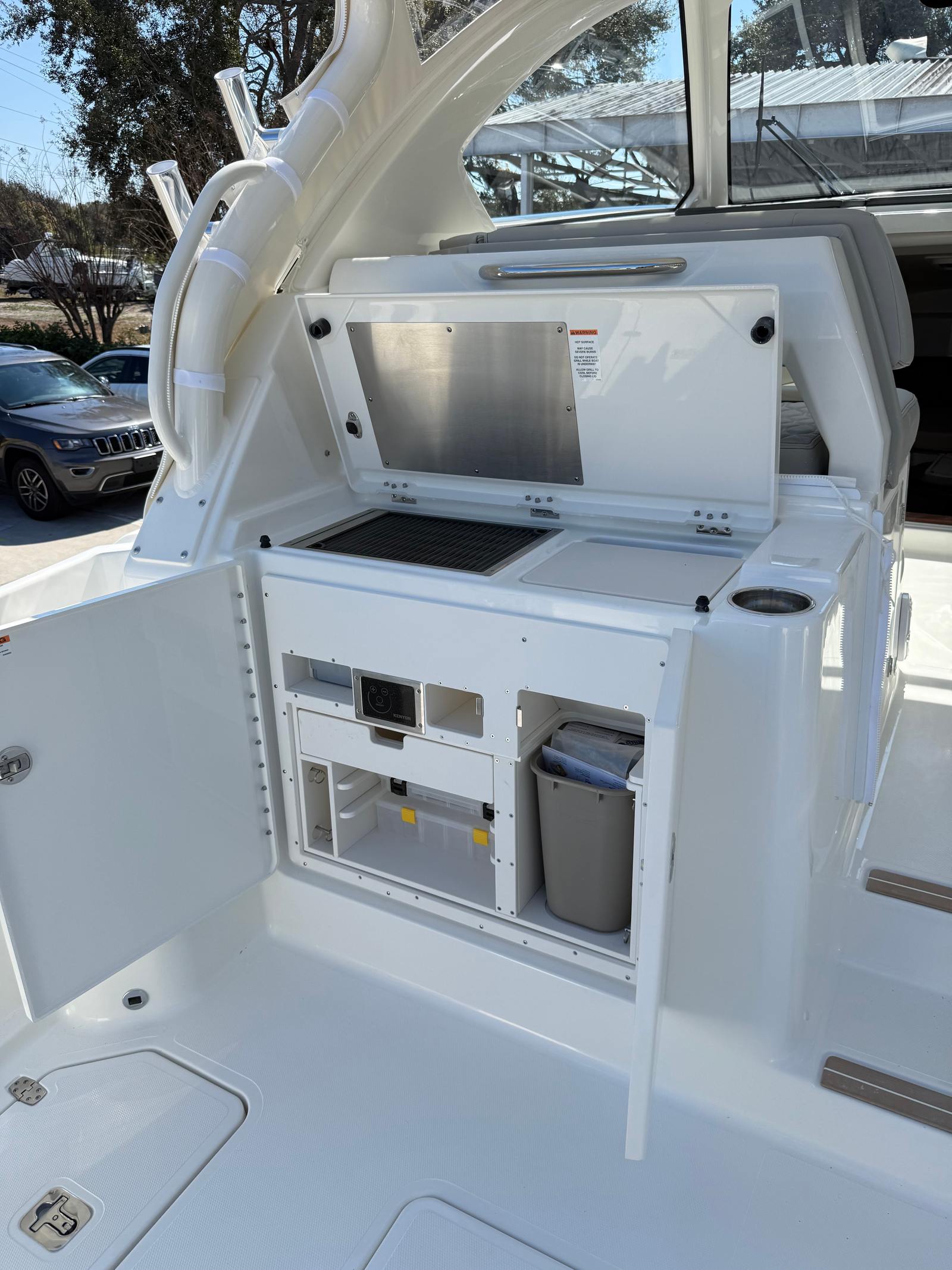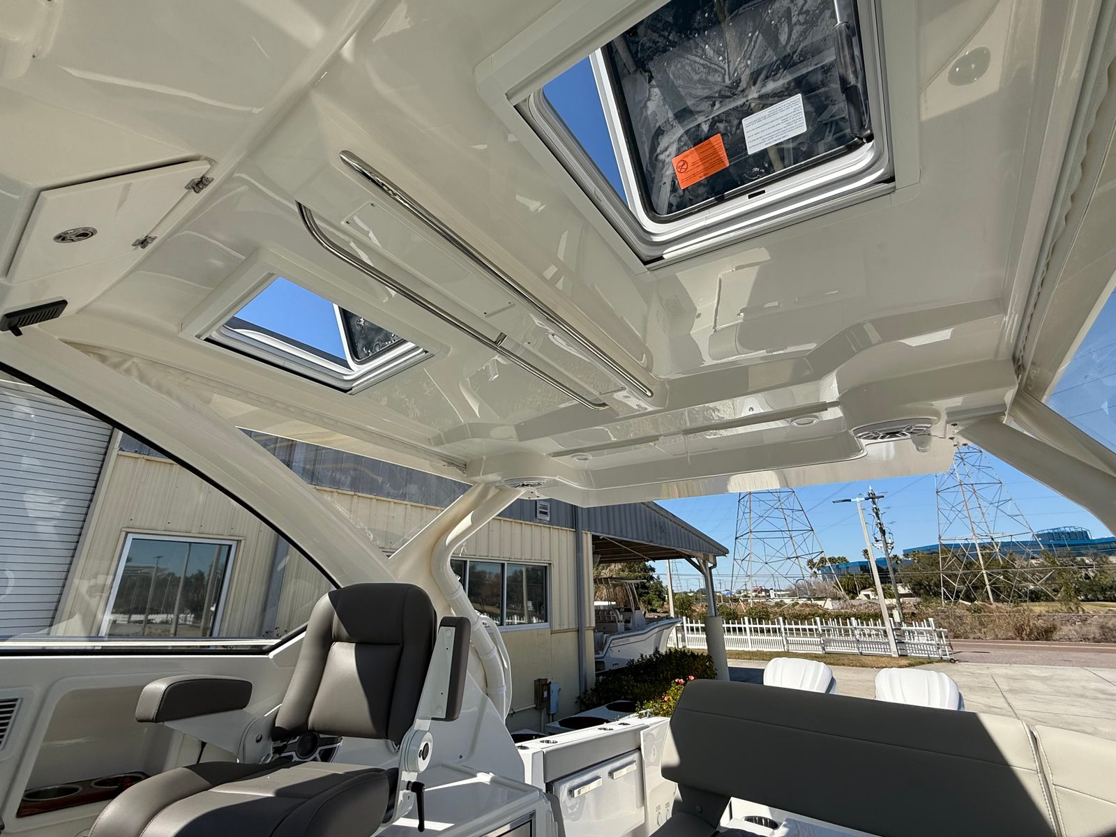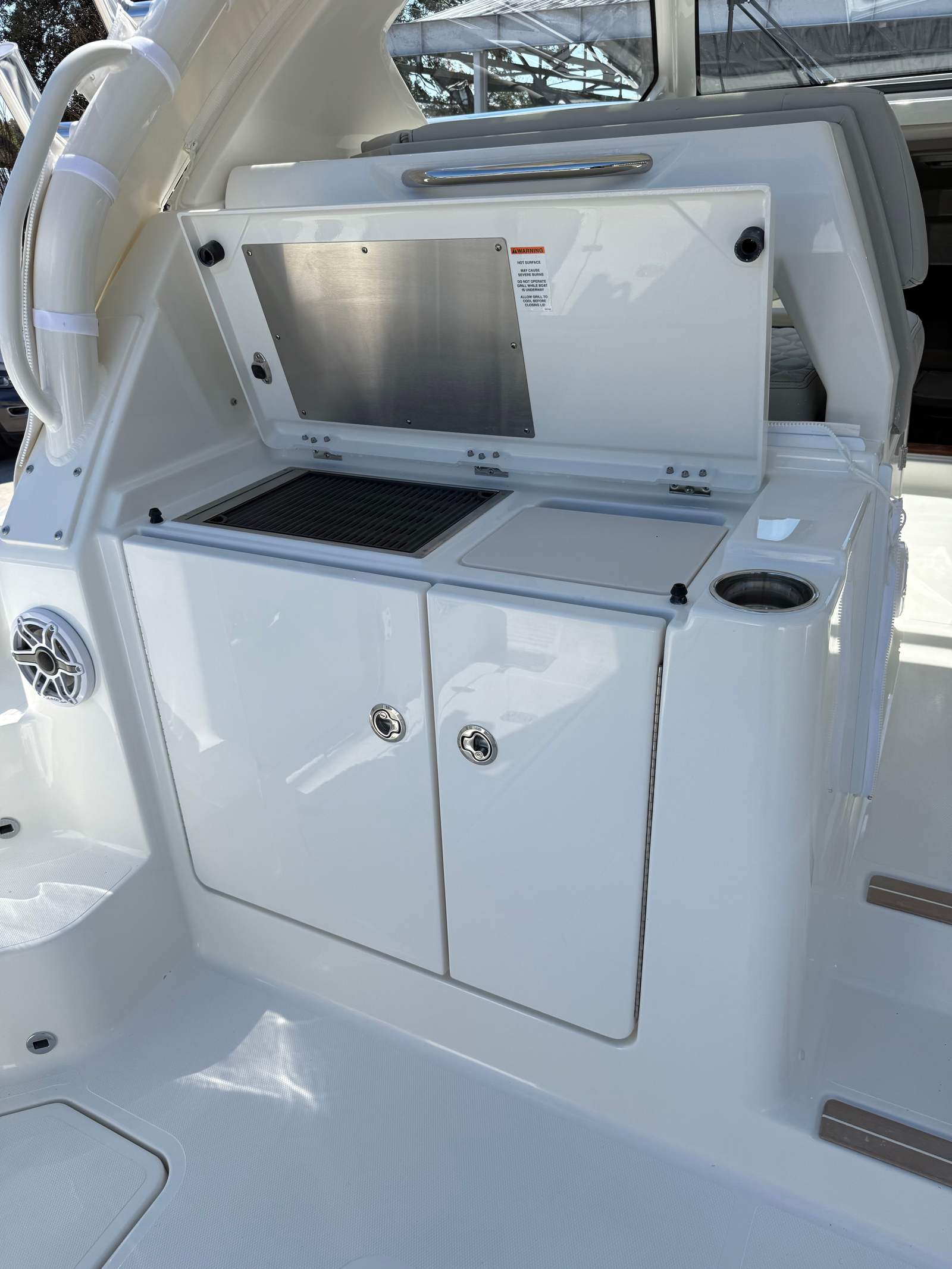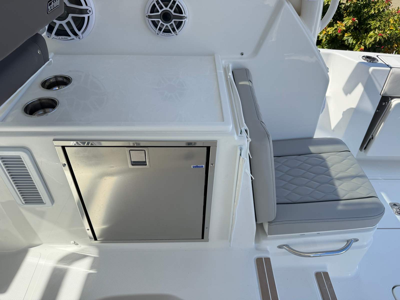 Step aboard the Pursuit OS 325 and discover a world of comfort and convenience. The interior fabric, finished in Tranquil Seas, creates a serene and inviting atmosphere, perfect for unwinding after a day on the water. The standard canvas upgrade features Stamoid material with polycarbonate windows in a crisp white finish, providing excellent protection from the elements while maintaining clear visibility and a stylish look.The bridgedeck teak table, complete with dedicated storage, offers a versatile space for dining, socializing, or simply enjoying the view. For those who love to soak up the sun, the forward deck sunpad with adjustable backrests and a Stamoid cover provides the ultimate relaxation spot. Advanced navigation is made possible with the Garmin Radar Dome GMR Fantom 24 (50 W), ensuring you stay safe and informed wherever your journey takes you.Comfort is paramount on the OS 325, with cabin air conditioning featuring reverse cycle 110v/60Hz (10,000 BTU) to keep the interior cool and comfortable in any weather. Every detail, from the hullside color to the bootstripe, has been carefully selected to enhance both aesthetics and functionality, making this Pursuit boat for sale a true standout in its class.