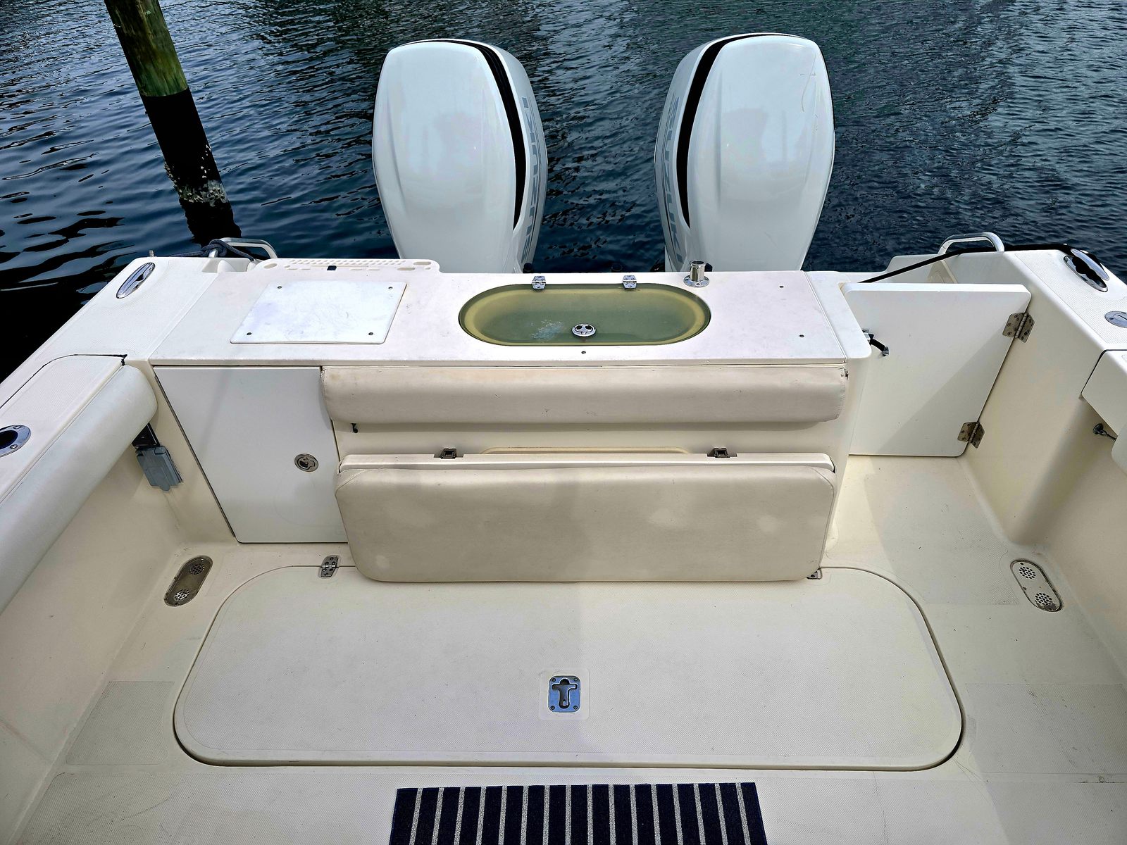 Fishing/Cockpit: 45-gallon live well, insulated fish box with macerator, bait prep station, tackle storage, and transom door.