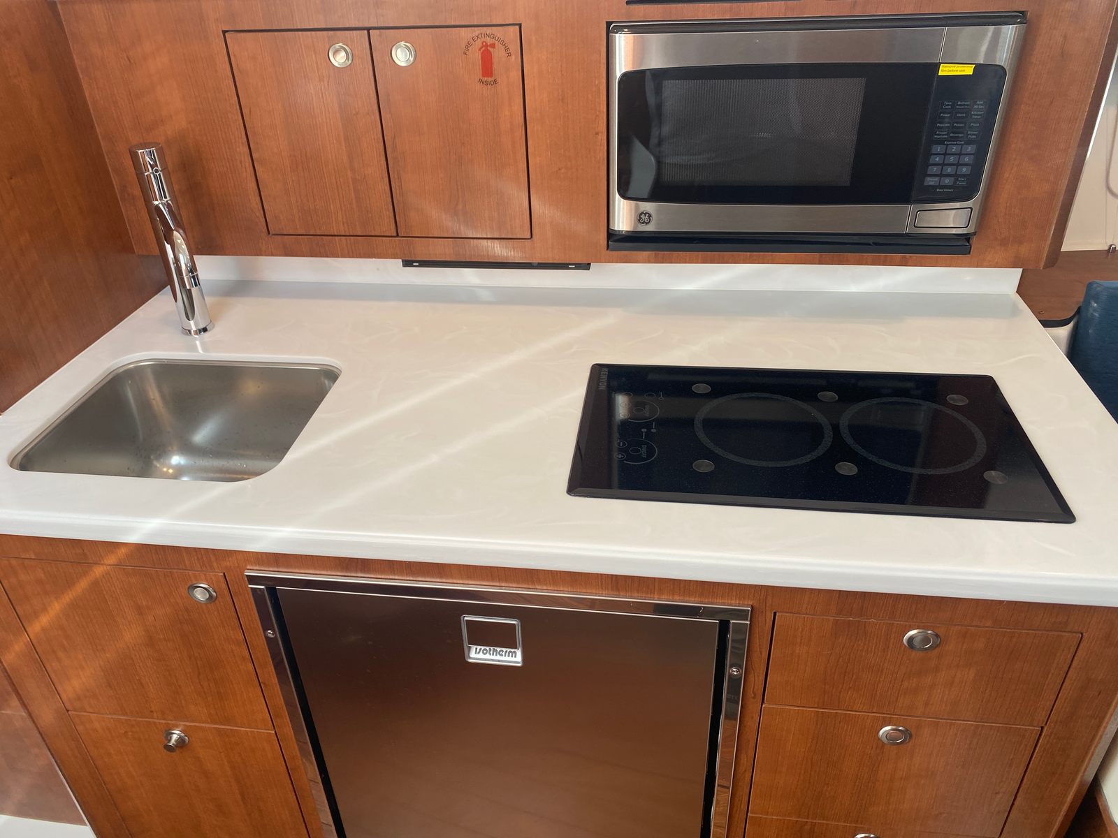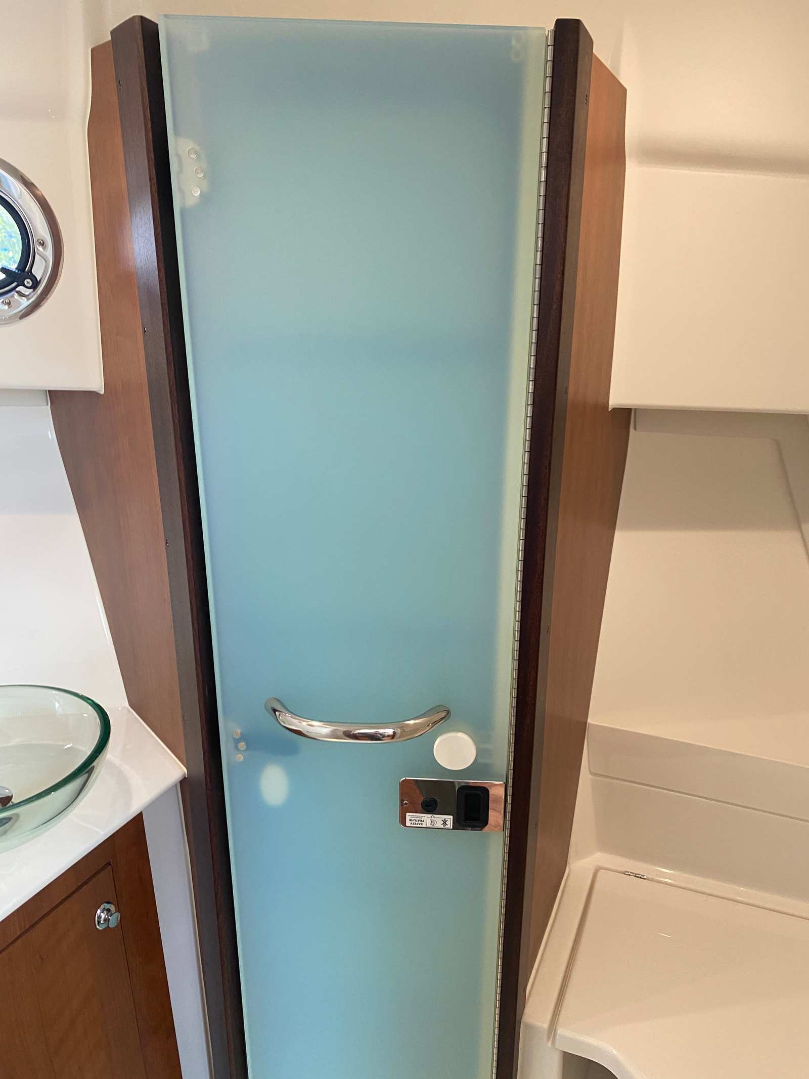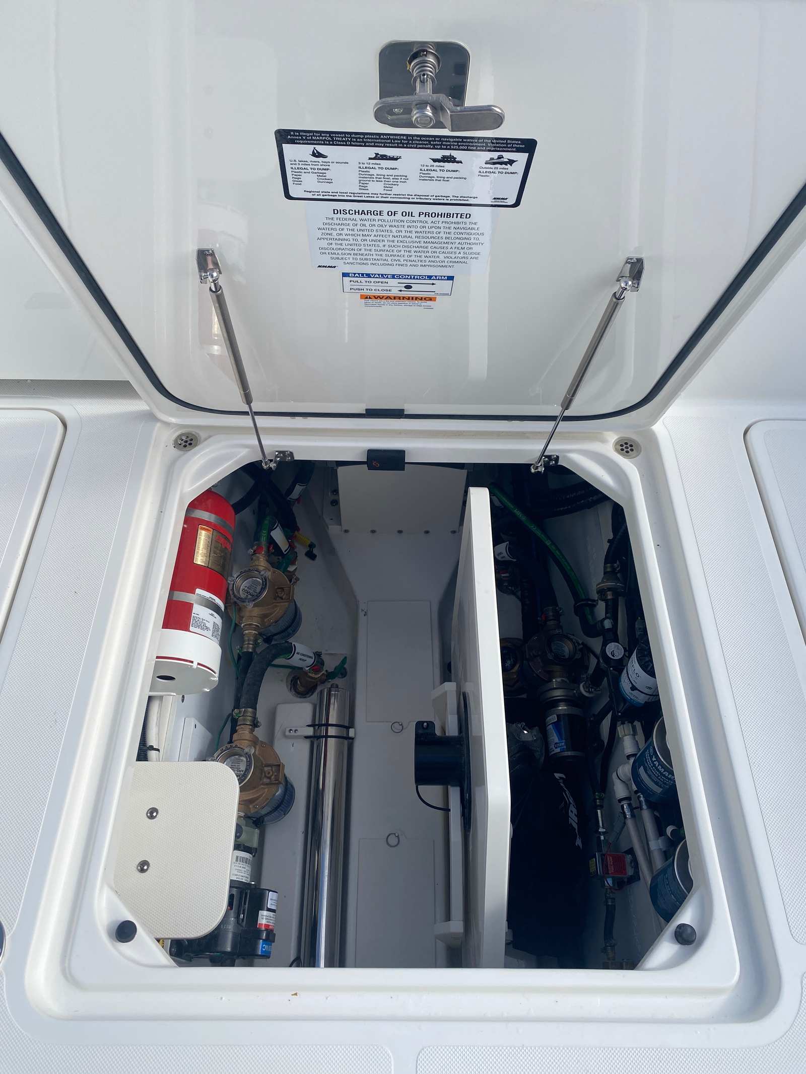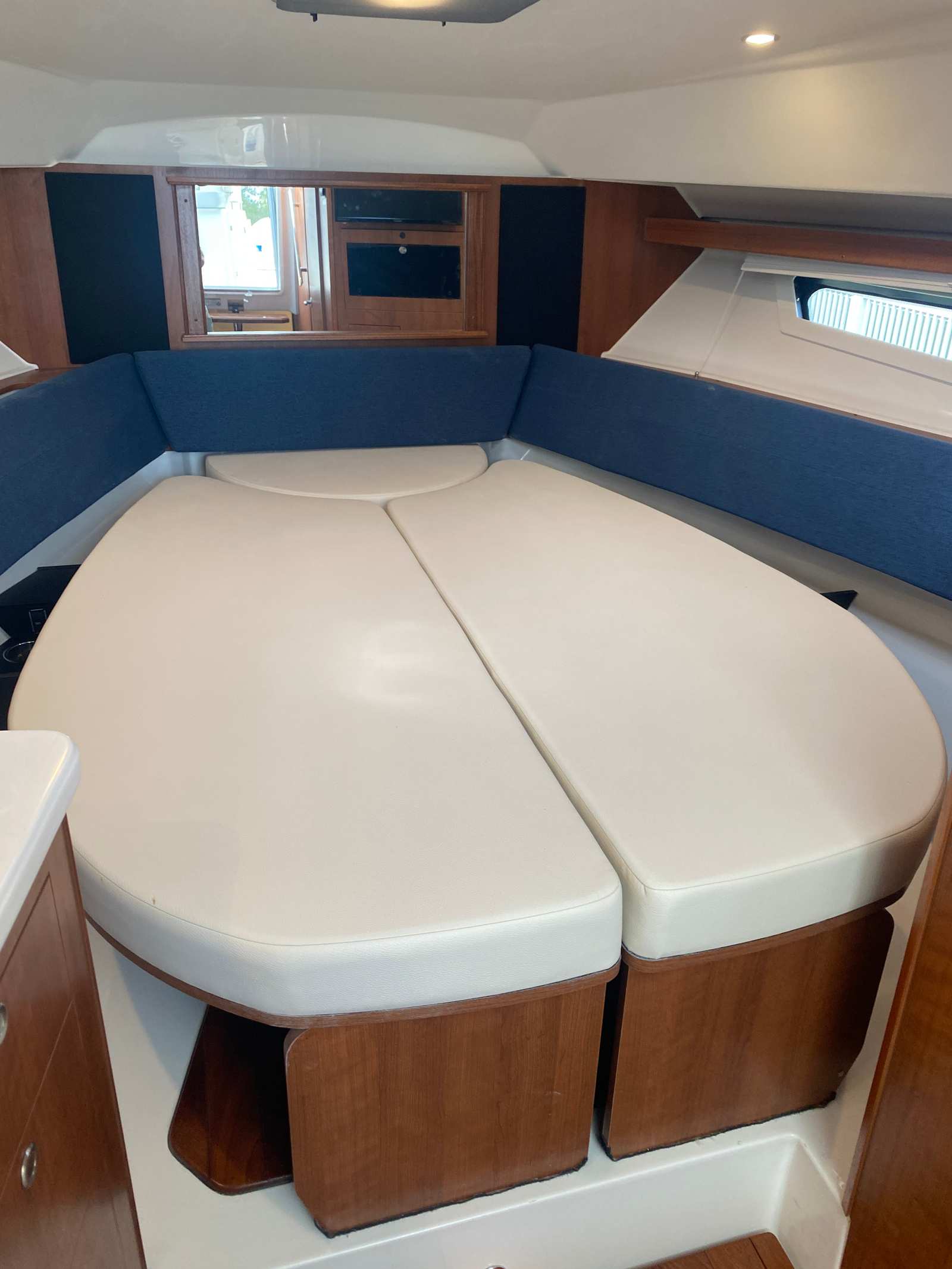 Step aboard the Pursuit OS 355 and discover a world of thoughtful features designed to elevate your boating experience. The Fresh White hull and Platinum bootstripe not only enhance the boat’s visual appeal but also reflect Pursuit’s attention to detail. The Carbon helm provides a sleek, modern command center, while the Tranquil Sea interior fabric offers a soothing environment for relaxation.Enjoy the convenience of a Bridgedeck Teak Table with dedicated storage, perfect for alfresco dining or socializing with friends and family. The cockpit is equipped with air conditioning and reverse cycle heat (16,000 BTU, 240V/60Hz), ensuring comfort in any climate. A custom hardtop with an integrated stainless steel electric retractable Makefast sunshade offers one-touch operation, allowing you to easily adjust your exposure to the sun. The fiberglass cockpit table, also with dedicated storage, adds versatility to your entertaining options. For enhanced safety and visibility, the OS 355 features an ACR RCL-100 LED spotlight with remote control at the helm, providing peace of mind during nighttime navigation.
