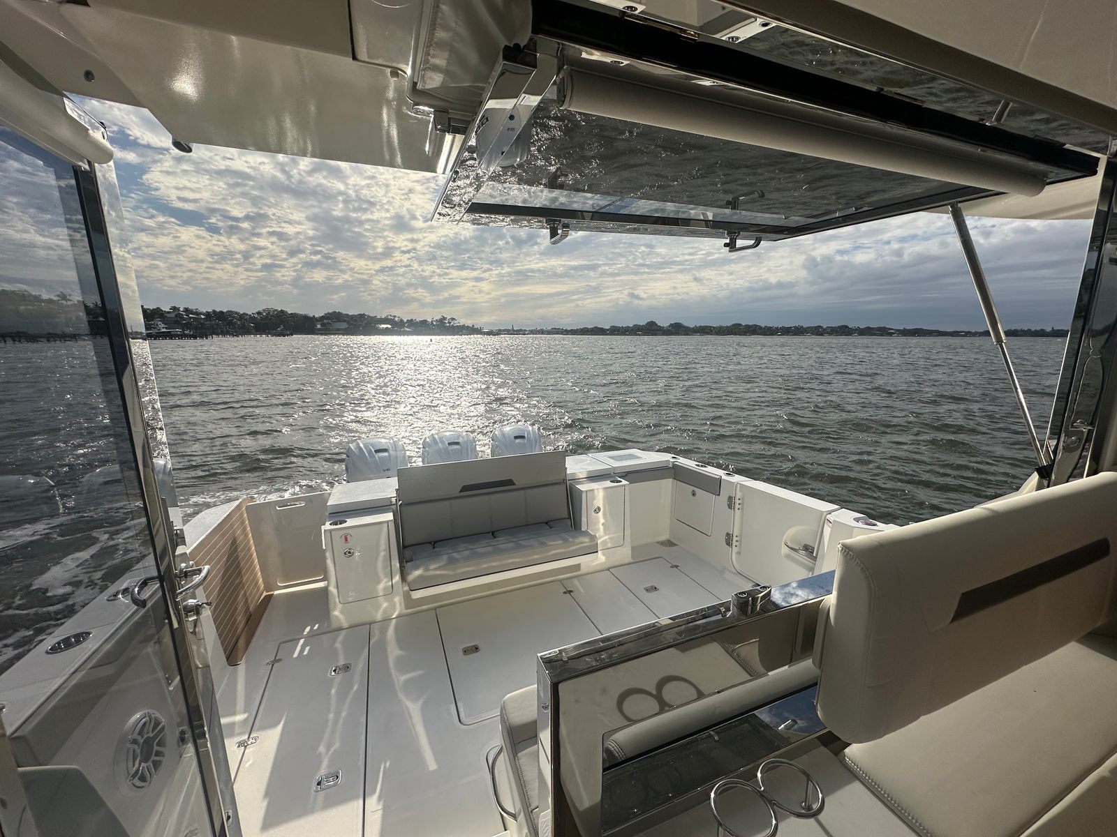 The Pursuit OS 445 is equipped with an array of premium features designed to enhance your boating experience. Outriggers with 18ft carbon fiber telescoping poles provide versatility for fishing enthusiasts, allowing for optimal bait presentation and increased catch potential. The Coastal Sunrise Upholstery adds a touch of elegance and comfort to the seating areas, creating a welcoming environment for relaxation and socializing.Enjoy shade and protection from the elements with the electric retractable cockpit sun shade and the forward Mediterranean-style sunshade, ensuring comfort during sunny days on the water. The helm control hardtop-mounted LED spotlight offers superior visibility for nighttime navigation, while black triple engine covers add a sleek, cohesive look to the vessel’s exterior.Advanced technology is seamlessly integrated, including a Garmin GC aft-facing camera for enhanced safety and situational awareness, and a Garmin GXM 54 SiriusXM weather receiver to keep you informed of changing conditions. Bolt-on hardtop rod holders provide convenient storage for fishing gear, maximizing deck space and organization.