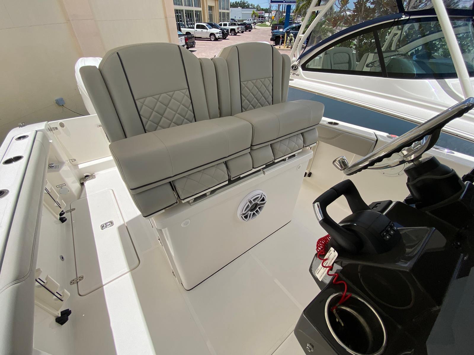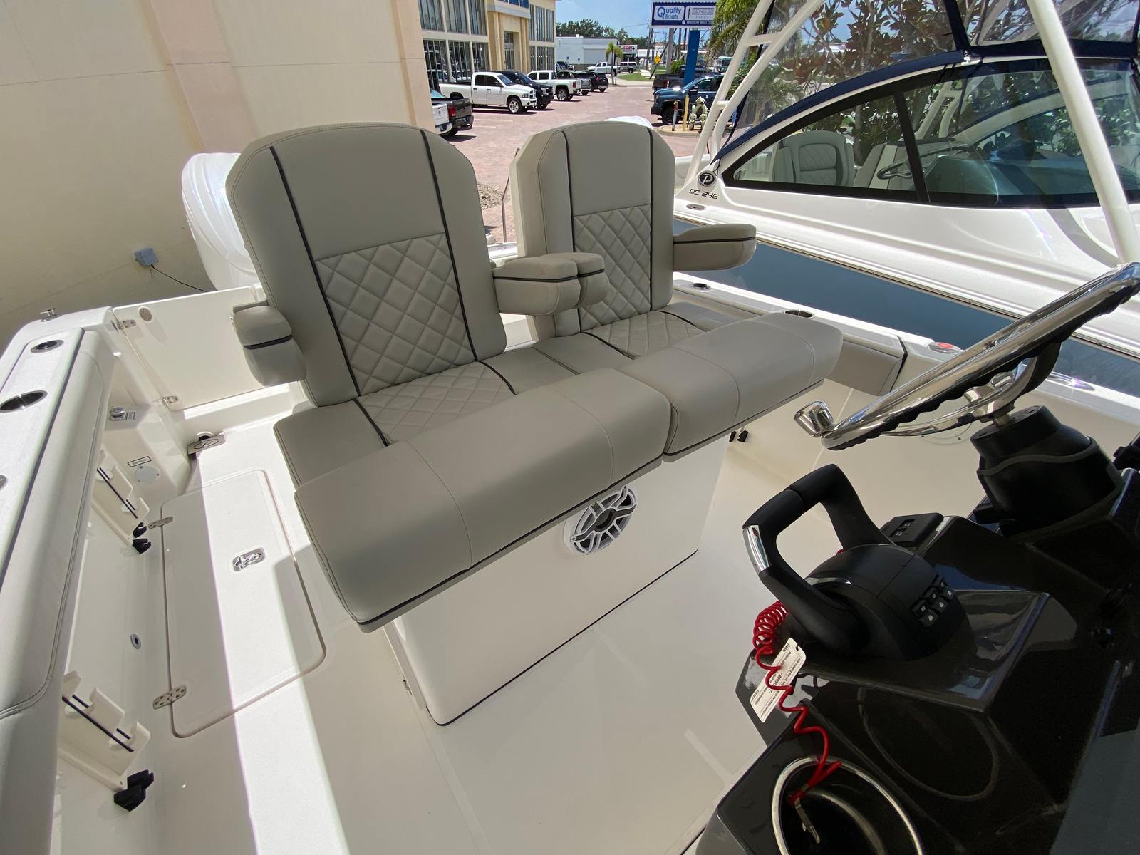 The Pursuit S 268 is loaded with premium features that set it apart from other Center Console boats for sale. The advanced windlass/anchoring system provides effortless anchoring, allowing you to secure your spot with the push of a button. Enjoy your favorite music with the premium stereo, amp, and speakers, complete with Sirius satellite radio for endless entertainment options. The premium hardtop, paired with a windshield and wiper, offers protection from the elements while maintaining clear visibility. The hardtop liner in fresh white adds a touch of elegance, complementing the boat’s sophisticated aesthetic.Navigation is a breeze thanks to the Garmin widescreen 12" display package, which includes a second 12" display for enhanced situational awareness. The cadet gray leaning post cover adds both style and durability, while the all-color spectrum underwater lights (three in total) create a captivating ambiance for evening cruises. Bow seating with port and starboard backrests ensures comfort for all passengers, and blue LED accent lights (mid-level, four in total) provide a modern touch that enhances the boat’s visual appeal.