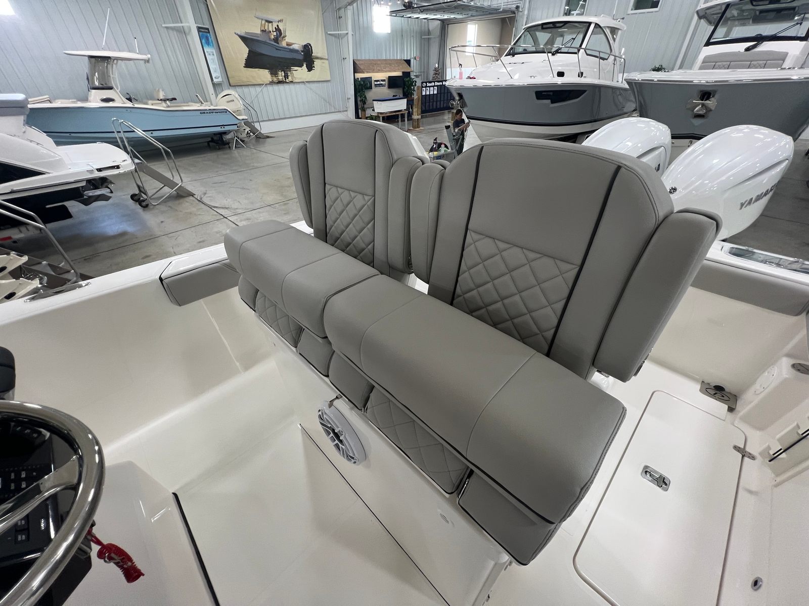 - Premium Helm Seating w/Four (4) Folding Armrests, Articulating Flip-up Bolsters, Upgraded Seat Slide with Fore/Aft Adjustments, and Edson® 316L SS Steering Wheel with Control Knob and Non-Slip Grip