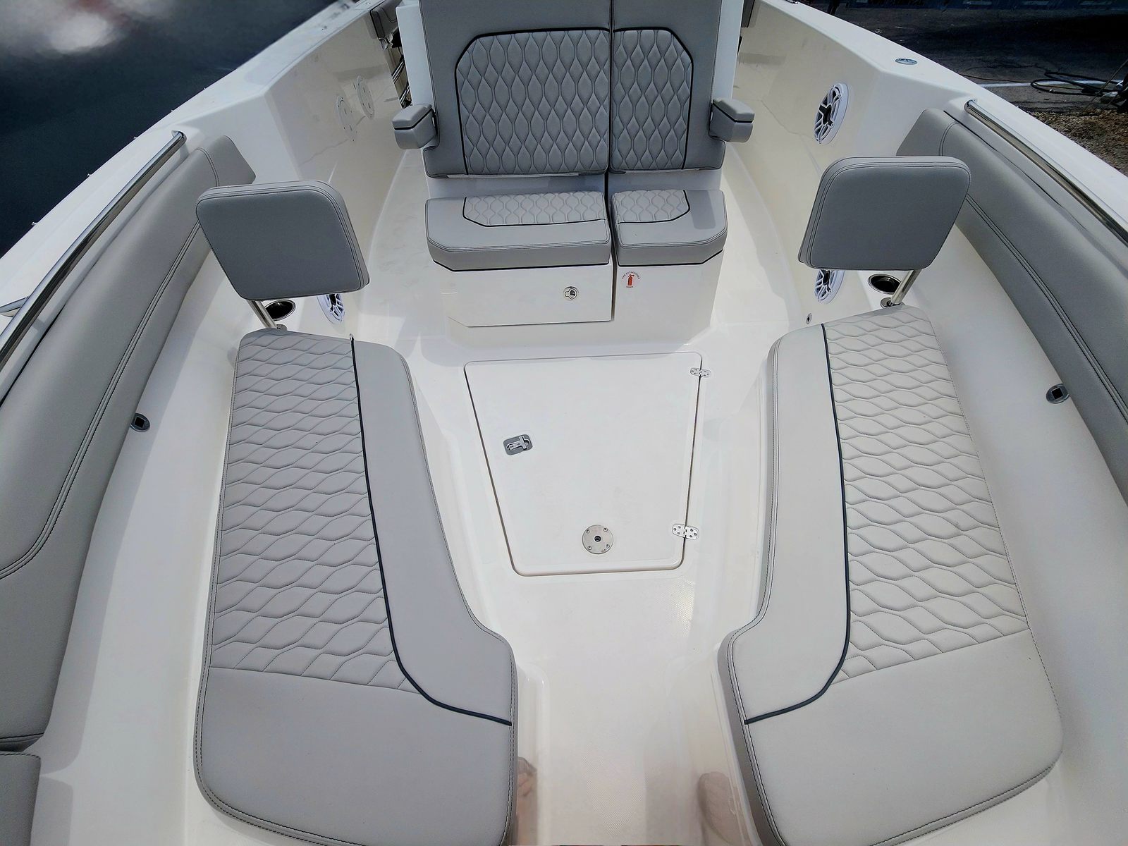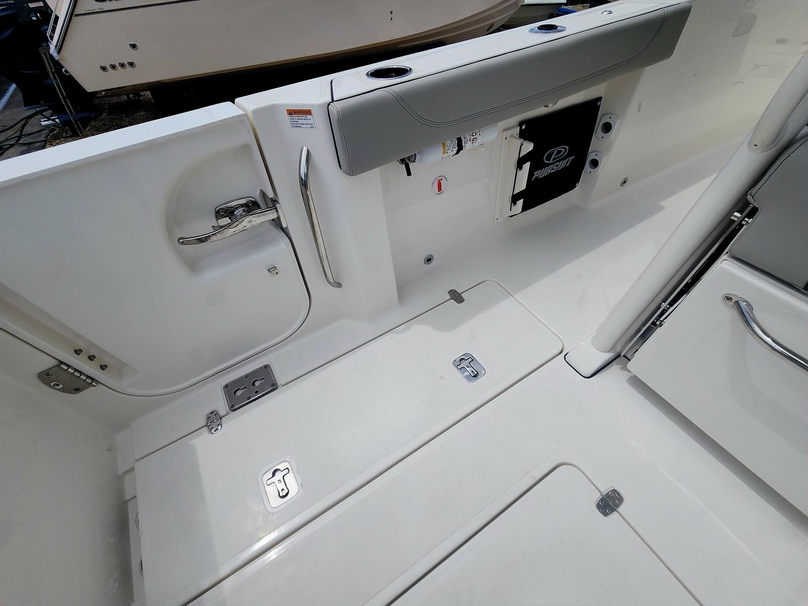 The Pursuit S 288 is loaded with features that elevate your boating experience. The helm and footrest are finished in a stylish Carbon color, creating a modern and comfortable command center for the captain. The hardtop liner matches the Fresh White hull, enhancing the boat’s cohesive and elegant aesthetic. A hullside boarding door ladder offers convenient access for swimmers, divers, or anyone boarding from the dock, while the 110V/60HZ dockside power with battery charger ensures your onboard systems stay powered up and ready for action.For those who love to enjoy the water after sunset, the S 288 is equipped with three all color spectrum underwater lights. These lights not only add a dramatic visual effect but also enhance safety and visibility during evening outings. The absence of a bow thruster is offset by the intuitive joystick system, which provides precise control for docking and close-quarters maneuvering.