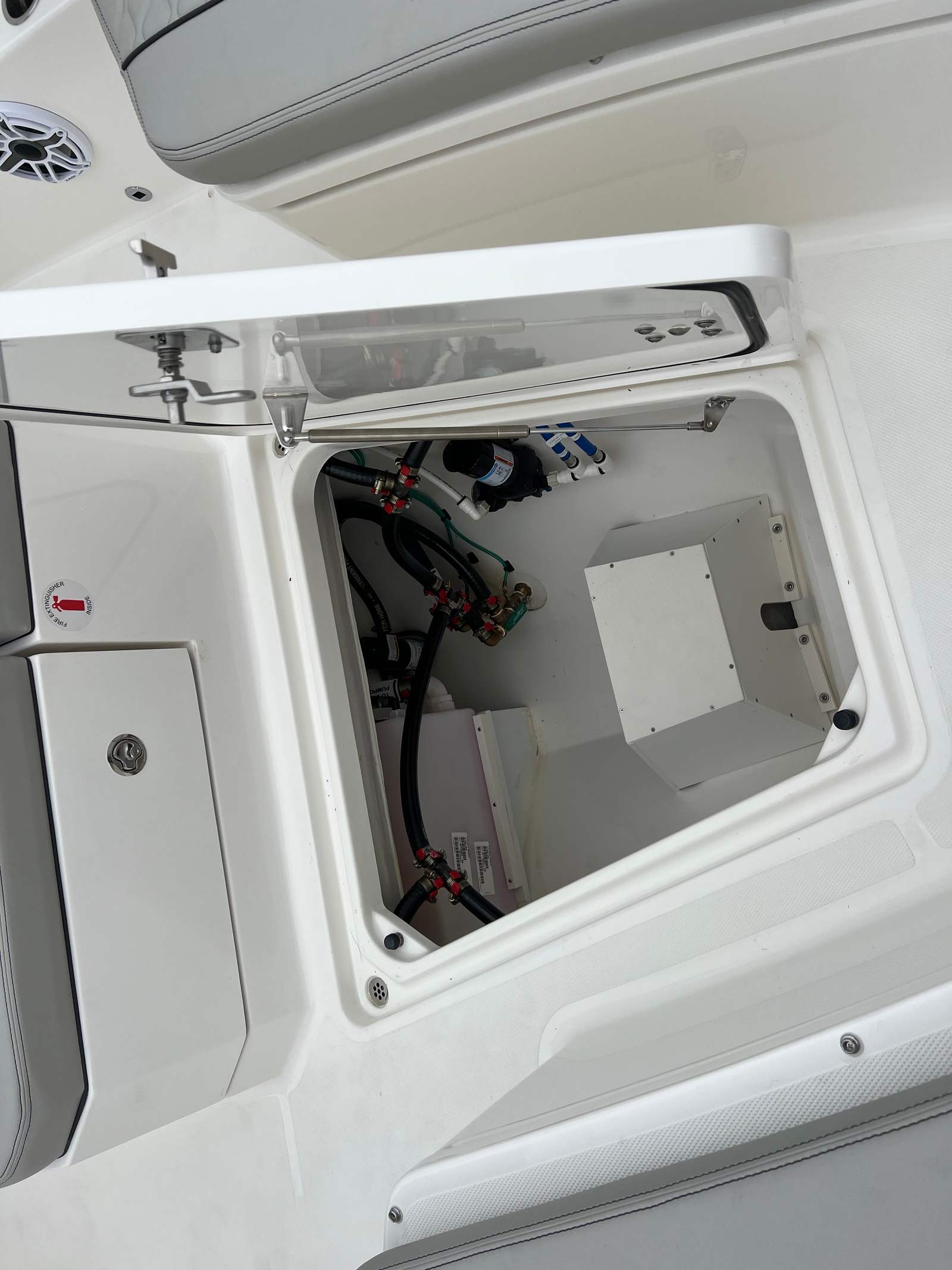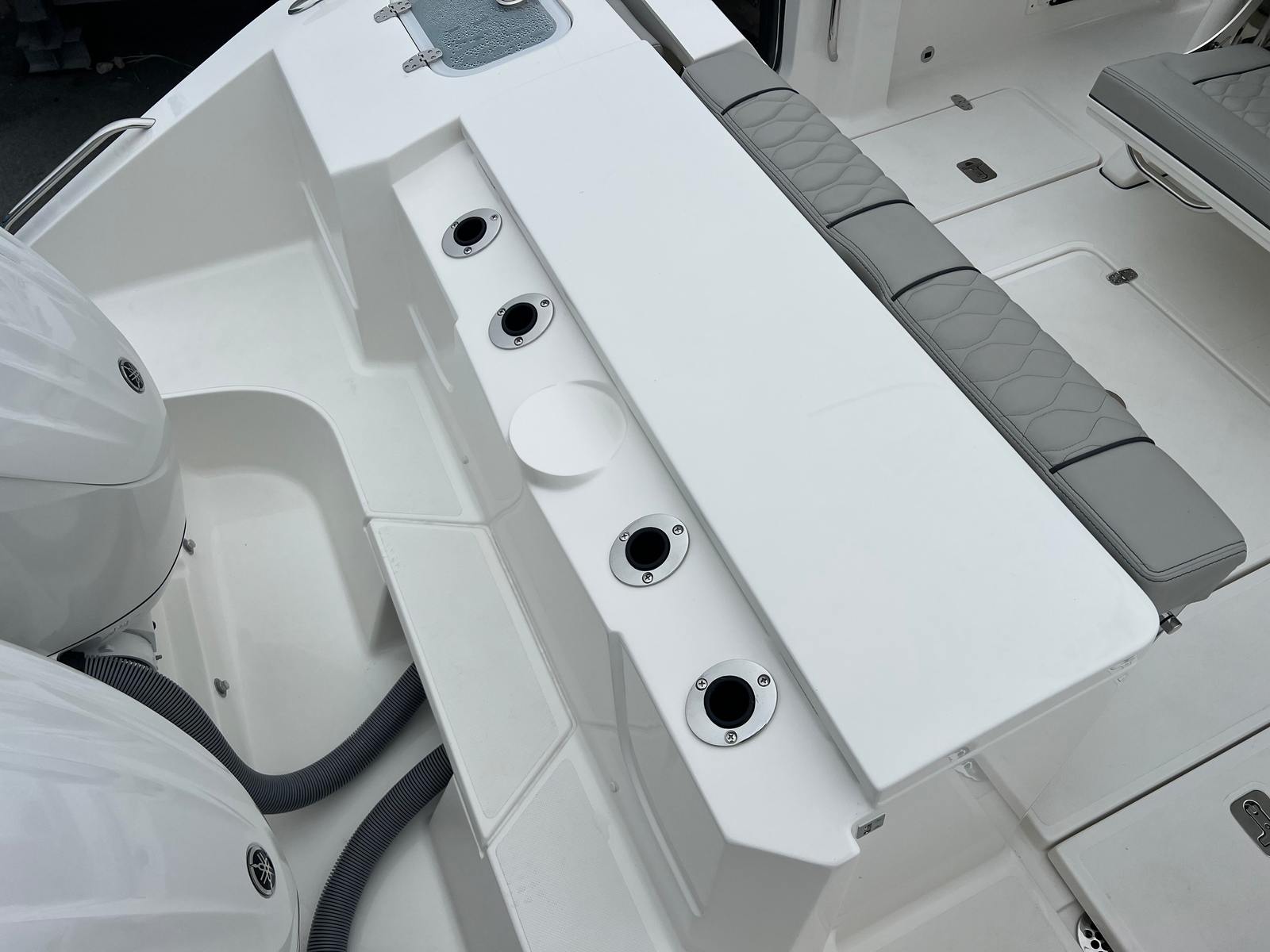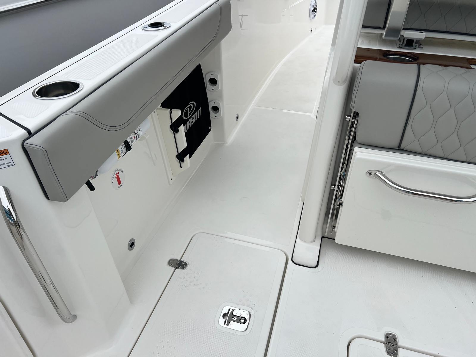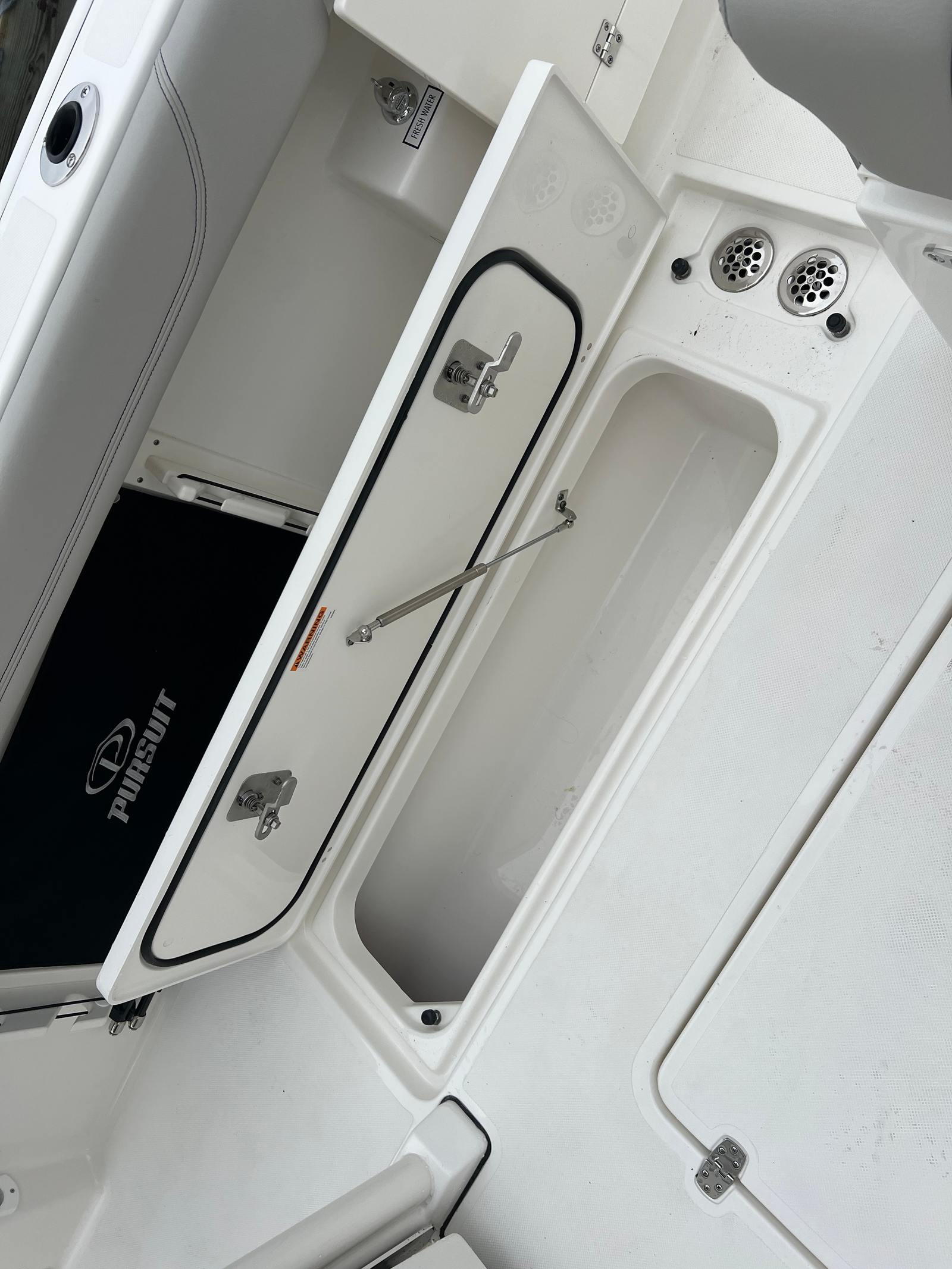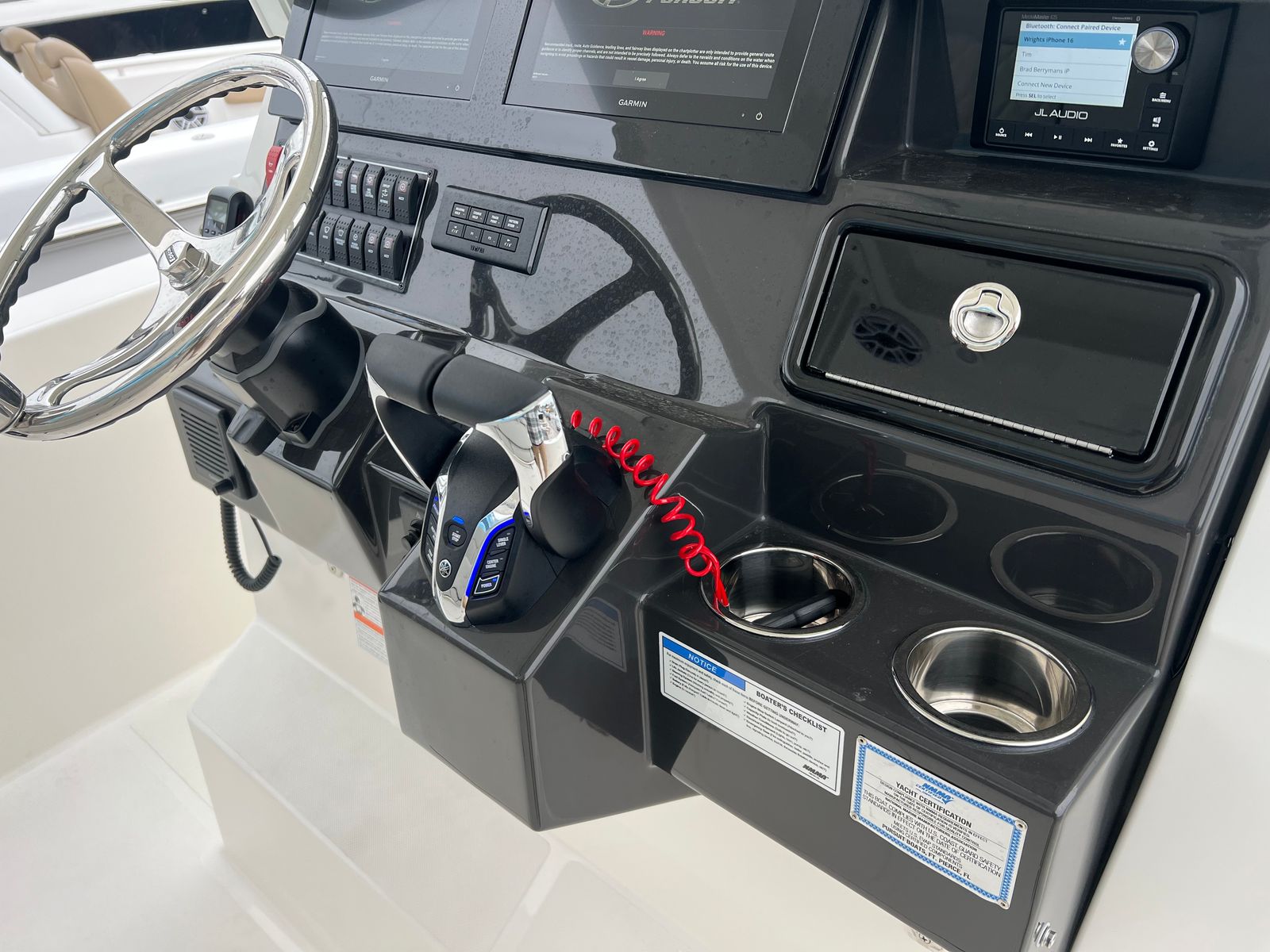Practicality meets luxury in the Pursuit S 288 Center Console. The side door boarding ladder makes it easy for guests of all ages to board and disembark, while the cockpit table offers a versatile space for meals, games, or relaxing with a cold drink. The instrument cover and helm seat cover protect key areas from wear and tear, reducing maintenance and preserving the boat’s pristine appearance. The hardtop liner provides shelter from the elements, ensuring a comfortable environment regardless of the weather.Storage is thoughtfully integrated throughout the boat, allowing you to stow fishing gear, water toys, and personal items securely. The twin Yamaha engines deliver impressive fuel efficiency, helping you maximize your time on the water without frequent refueling stops. Maneuvering in tight spaces is a breeze thanks to the Yamaha® Joystick Control, making this Center Console boat for sale an excellent choice for both novice and experienced boaters.