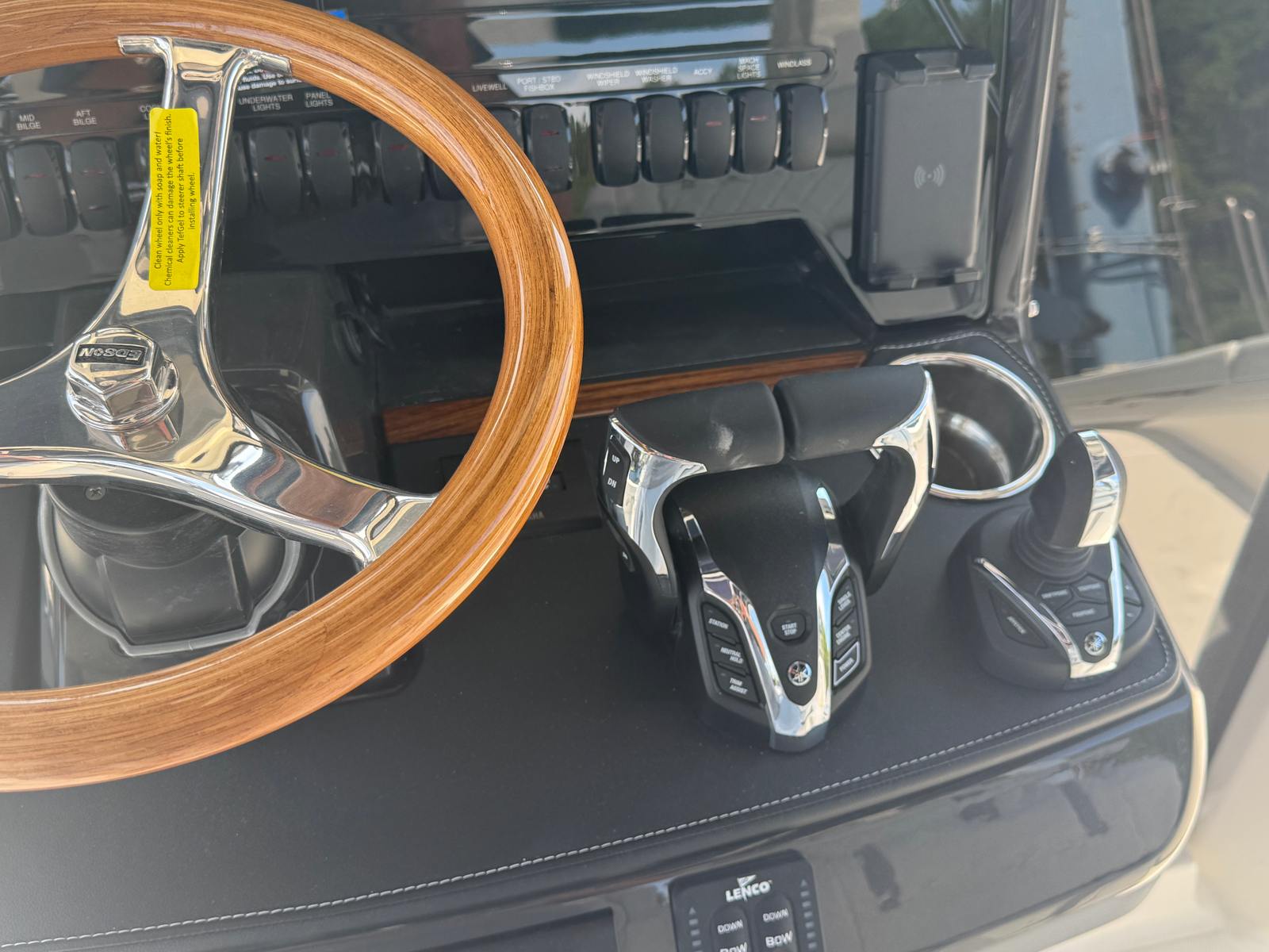 - Helm - Premium Upgrade: Edson Solid Teak Steering Wheel with Power Knob, Leather-Wrapped Dash Pad (Black), Synthetic Teak Flooring on Helm Footrest Treads and Teak Accents on Dash Storage Pockets and Entertainment Center
