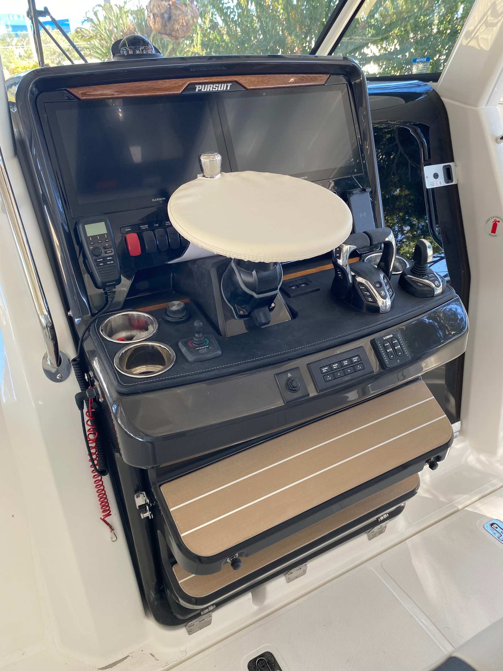 The Pursuit S 328 Center Console is packed with premium features designed to enhance your time on the water. The twin Yamaha F350 engines provide robust power, while the Yamaha® Joystick Control system ensures intuitive maneuvering. The hull’s Fresh White color and Platinum Bootstripe add a touch of sophistication, complemented by the Carbon helm and Tranquil Sea interior fabric for a modern, upscale look. Comfort is paramount, with a 110v/60Hz cabin air conditioning system featuring reverse cycle capability (6,000 BTU) to keep the interior cool and comfortable in any weather.Fishing enthusiasts will appreciate the four bow rod holders, offering convenient storage and easy access to gear. The cockpit refrigerator, powered by a 12v system with temperature control, replaces standard tackle storage and keeps refreshments chilled throughout your journey. For added luxury, the custom retractable Makefast sunshade with one-touch operation provides instant shade and protection from the sun, allowing you to relax in comfort during long days on the water.