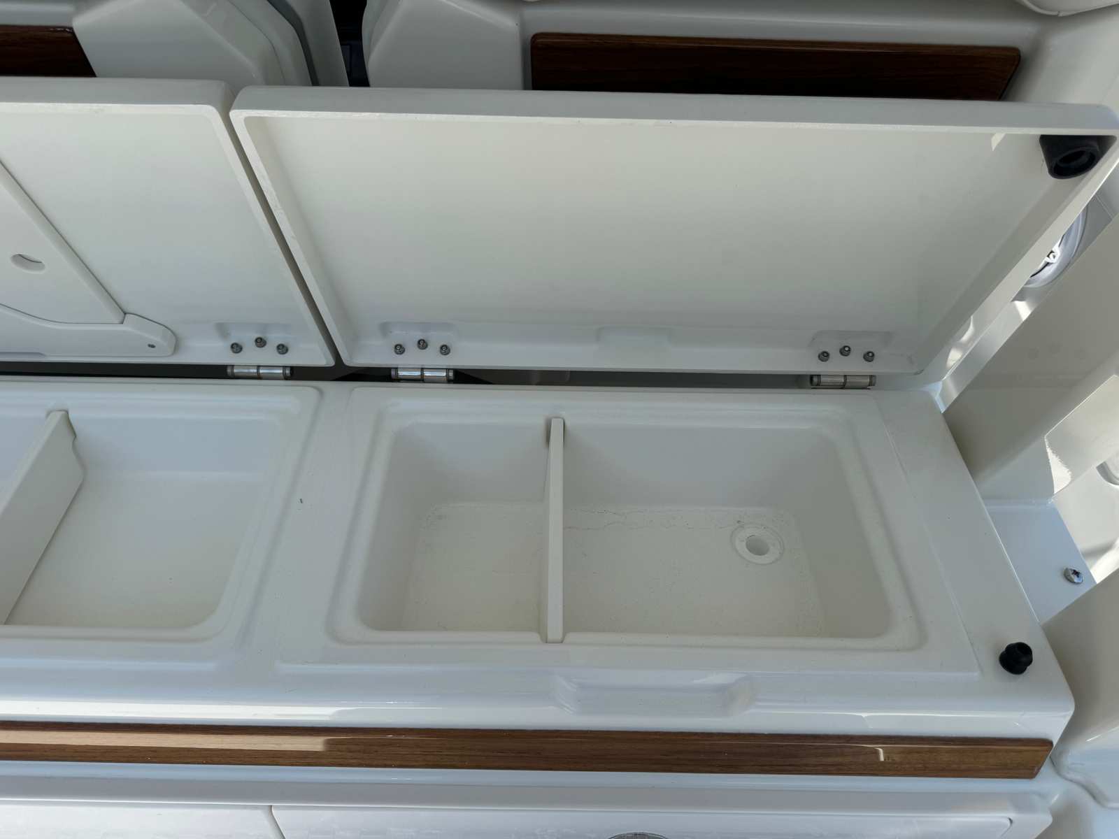 The Pursuit S 328 Center Console is loaded with premium features designed to enhance your time on the water. The Neptune Gray hull color, accented by a bold black bootstripe, gives the boat a sophisticated and modern look. The helm features a carbon color scheme, complemented by a hardtop liner in Neptune Gray and an interior finished in the tranquil and inviting Tranquil Sea color. For those who appreciate comfort and convenience, the S 328 comes equipped with a generator (120V/60Hz) and 110v/60Hz cabin air conditioning with reverse cycle, ensuring a pleasant environment no matter the weather. The helm receives a premium upgrade with an Edson solid teak steering wheel featuring a power knob, a leather-wrapped dash pad in black, and synthetic teak flooring on the helm footrest treads. Teak accents on the dash storage pockets and entertainment center add a touch of elegance and warmth to the overall design.