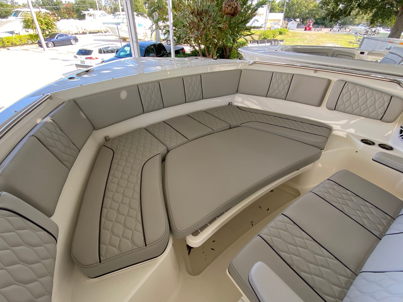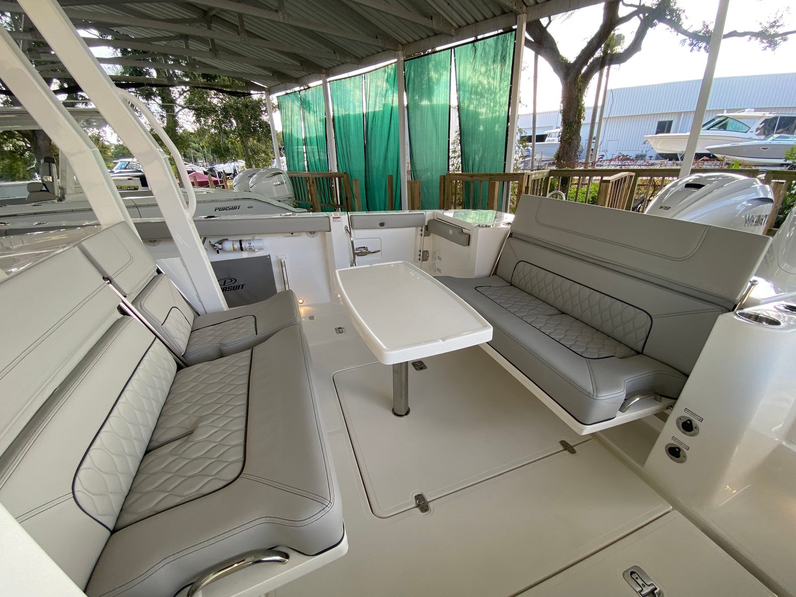 Owning the Pursuit S 358 Center Console means embracing a lifestyle of fun, relaxation, and adventure. The spacious layout is perfect for socializing with family and friends, whether you’re hosting a sunset cruise, enjoying a day of water sports, or simply relaxing at anchor. The advanced air conditioning systems in both the cabin and cockpit ensure everyone stays comfortable, even during the hottest days of summer. The tranquil sea interior fabric and carbon helm create a serene and stylish environment, making every outing feel like a luxury retreat.The innovative sunshade solutions—both at the bow and integrated into the hardtop—allow you to customize your exposure to the sun, ensuring comfort for all passengers. With powerful twin Yamaha engines, you’ll enjoy the freedom to explore new destinations, reach your favorite fishing spots quickly, or simply cruise in style and confidence.