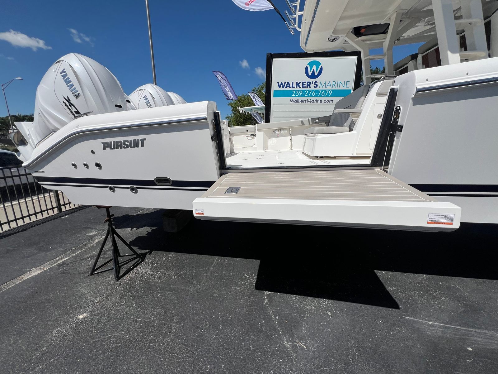 The 2025 Pursuit S 428 is loaded with premium features that enhance both safety and enjoyment on the water. The Garmin 72Mile GMR Fantom Radar Array offers advanced navigation and situational awareness, making it easy to explore new destinations with confidence. The Seakeeper Gyro Stabilization System is a game-changer for comfort, virtually eliminating boat roll and ensuring a stable, enjoyable experience for everyone on board, even in choppy conditions.For those who appreciate comfort and protection from the elements, the electric retractable cockpit sun shade provides instant relief from the sun, allowing you to create the perfect environment for relaxation or entertaining guests. The boat’s aesthetic appeal is further elevated by the navy boot stripe with navy accent, while the hardtop liner in fresh white adds a touch of modern elegance.To protect your investment and keep your boat looking pristine, the S 428 comes equipped with a suite of high-quality covers, including the White Stamoid LT instrument cover, aft facing seat cover, console chaise cover, and helm/comp seat cover. The blue quad engine covers not only enhance the boat’s visual appeal but also provide essential protection for the powerful engines.