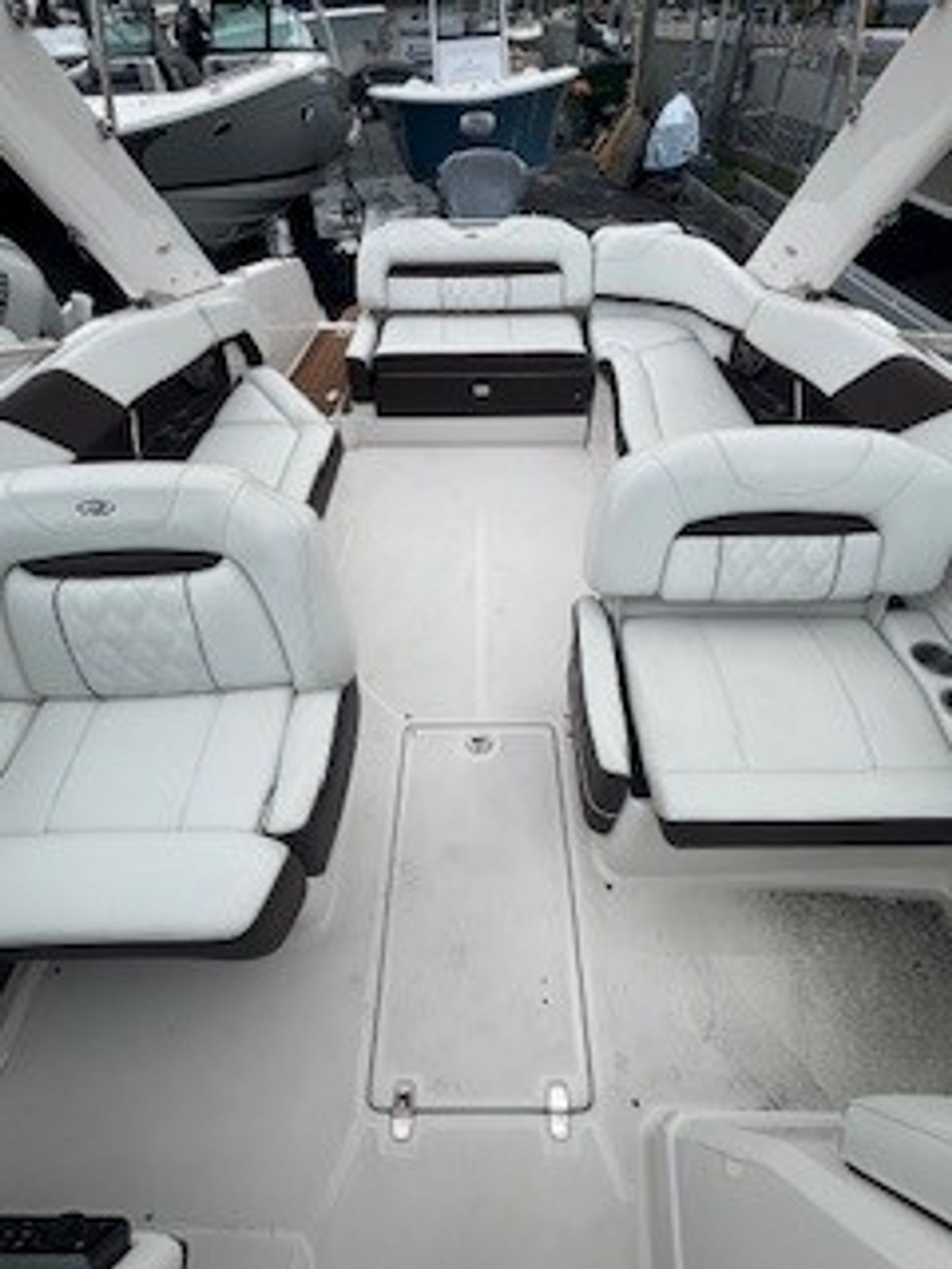 • Premium Helm Station: Equipped with a Garmin glass dash/GPS navigation system, power-assist steering, and trim tab controls for total command of the water.