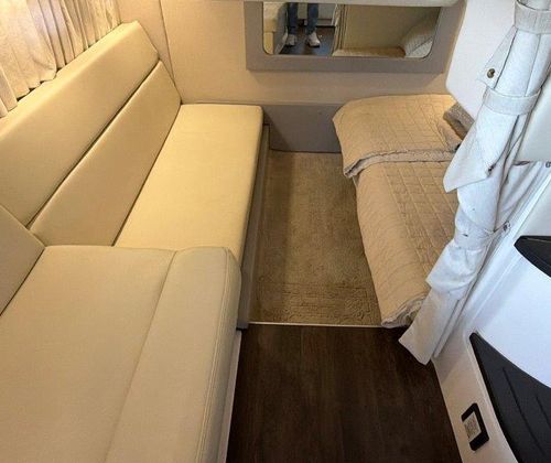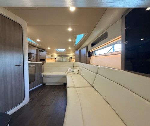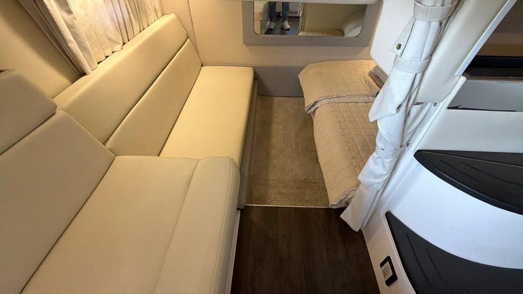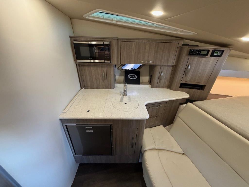 Below deck, the spacious salon features L-shaped seating for entertaining, a queen-size berth at the touch of a button, and an aft cabin that converts into a queen bed in seconds. The galley is fully equipped with a stove, microwave, and high-gloss teak table that stores neatly behind the couch when not in use.